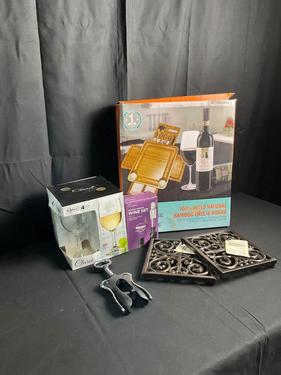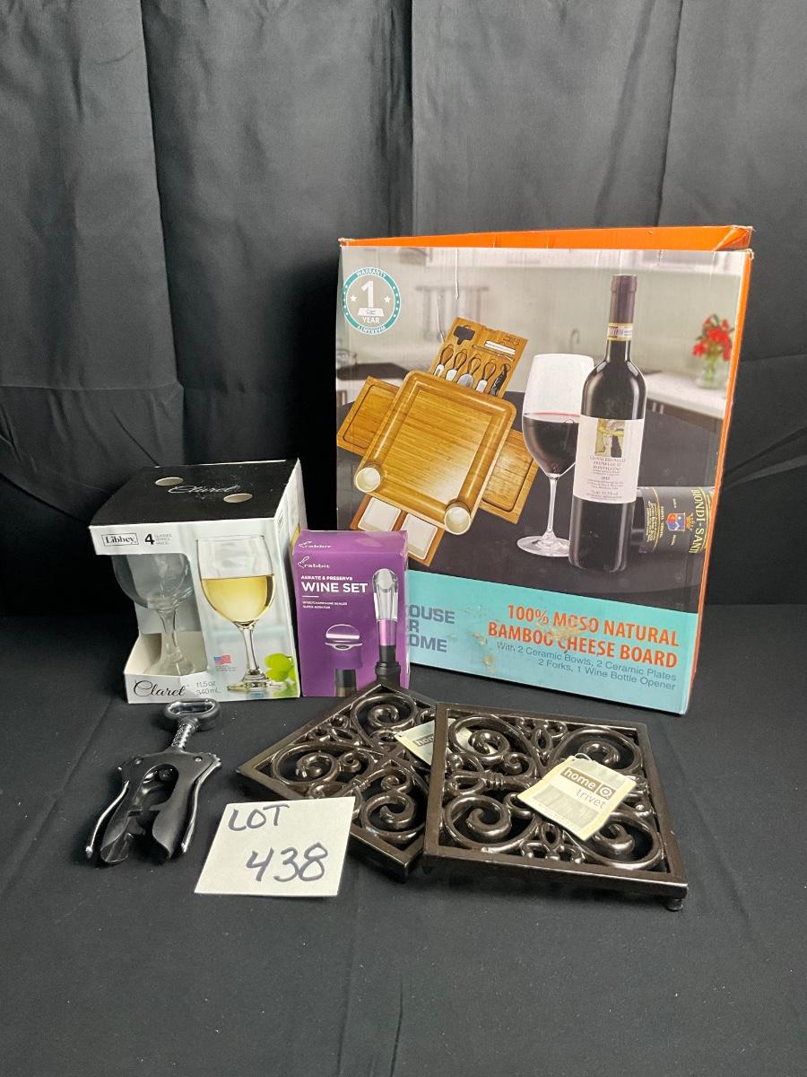 Lot S 438 NIB Natural Bamboo Cheese Board / NWT Two Wrought Iron Trivets / NIB Set of Four Wine Glasses / NIB Wine Set