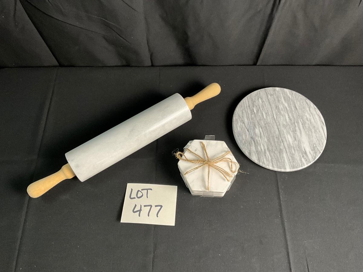 Lot S 477 Marble Rolling Pin / Cheese Plate / 4pc Coaster Set