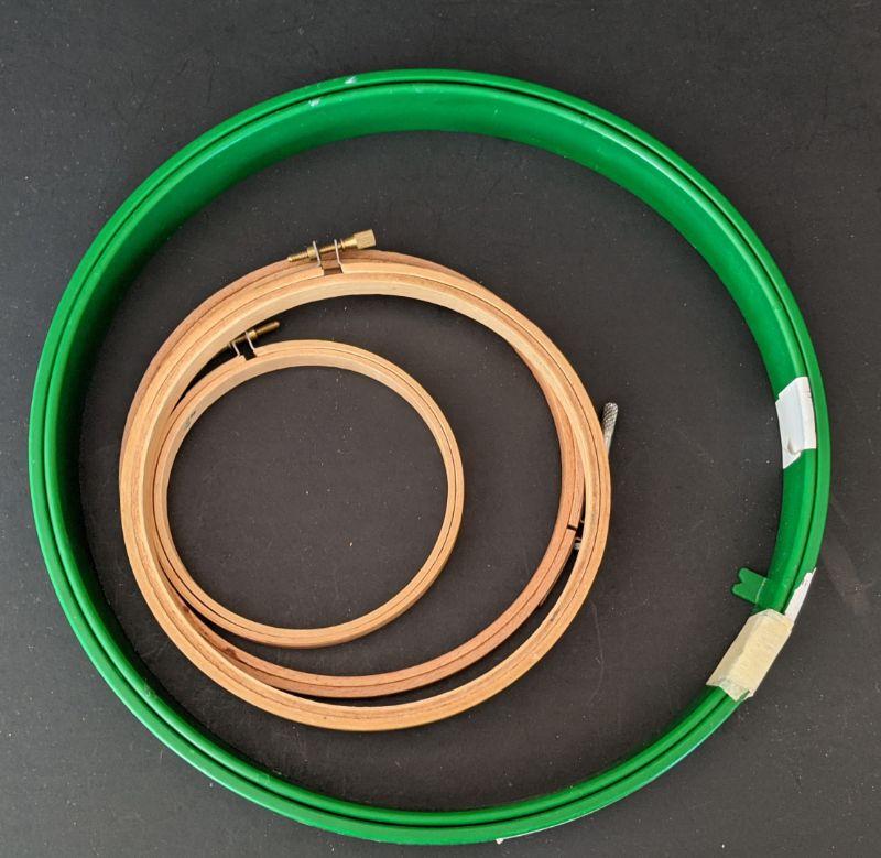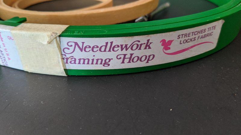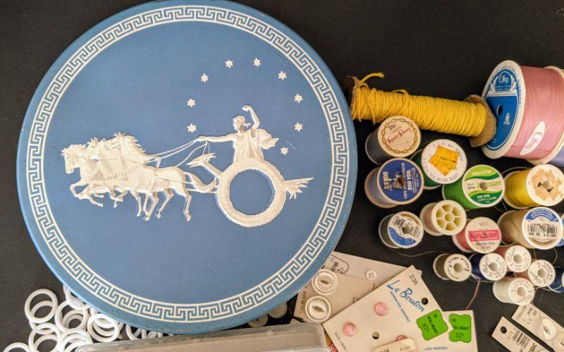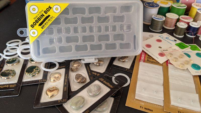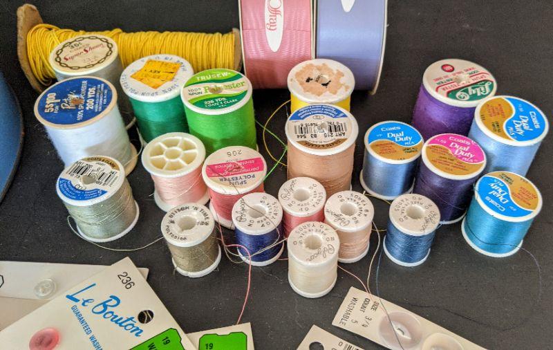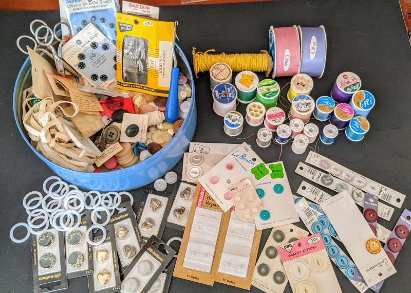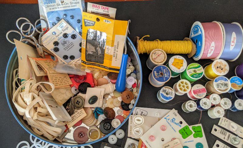 Lot # 203s Lot of vintage sewing notions, buttons, thread, embroidery hoops, bobbin case in TIN