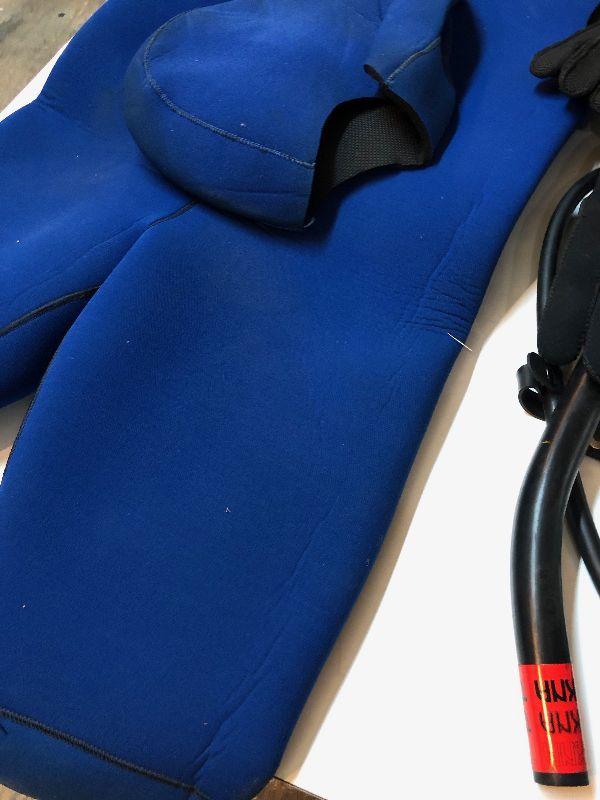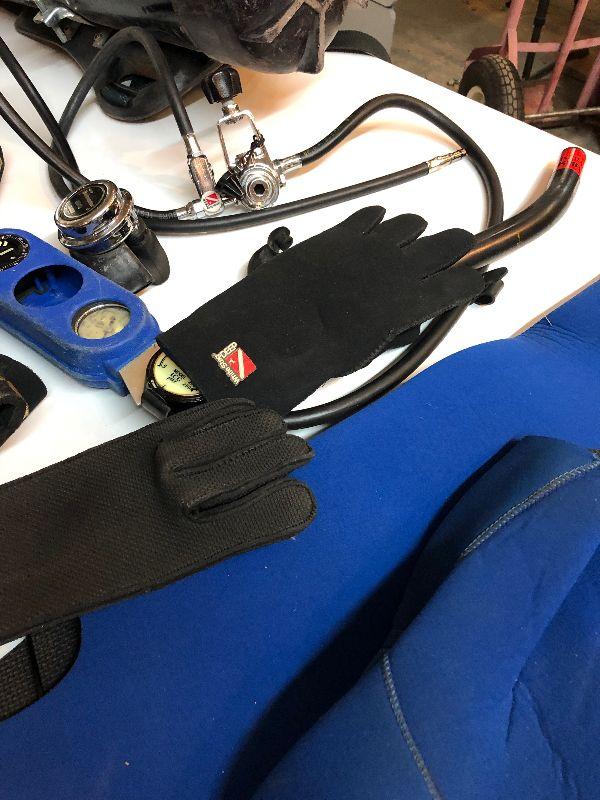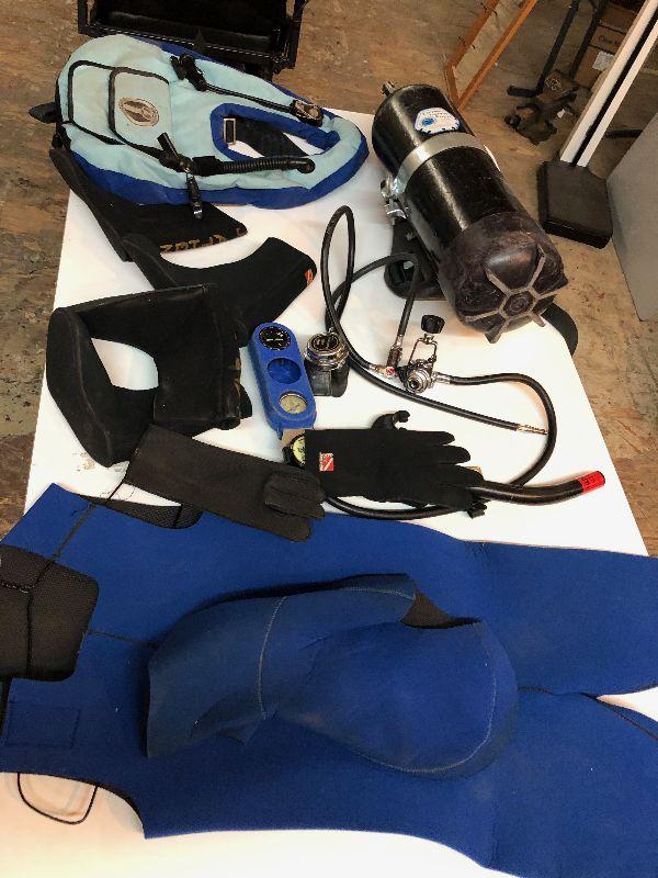 As shown a large lot of vintage SCUBA gear...tank with regulator..boots..gloves..wet suit...snorkel..dive vest...Some normal use wear...No flippers...
