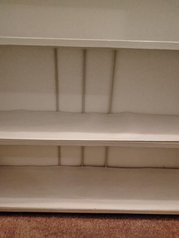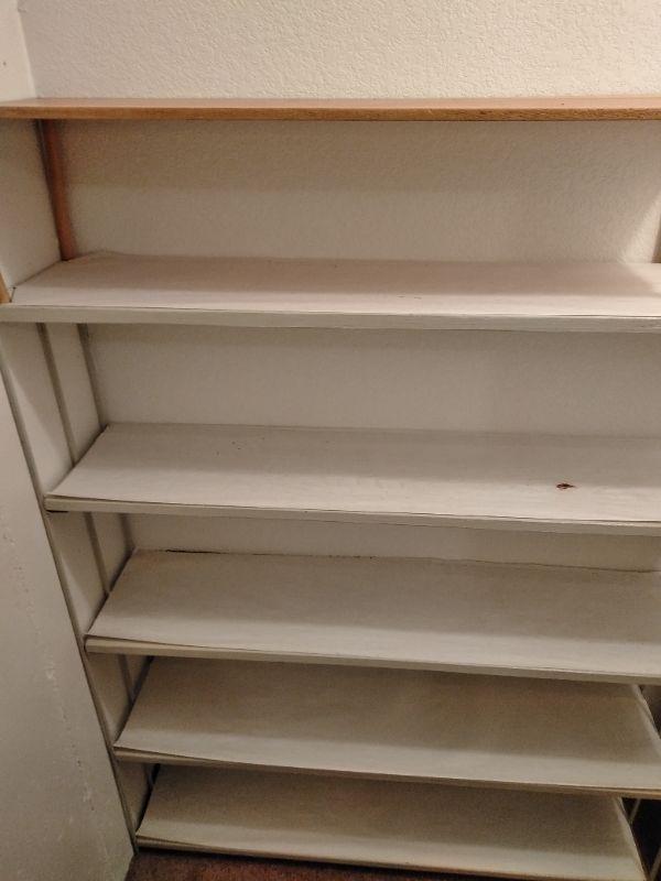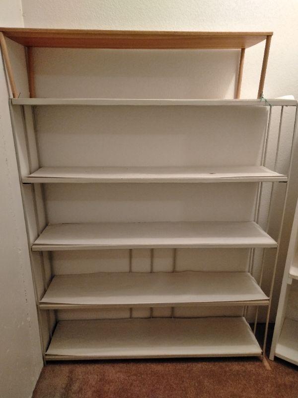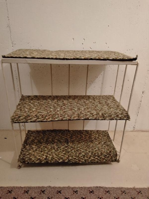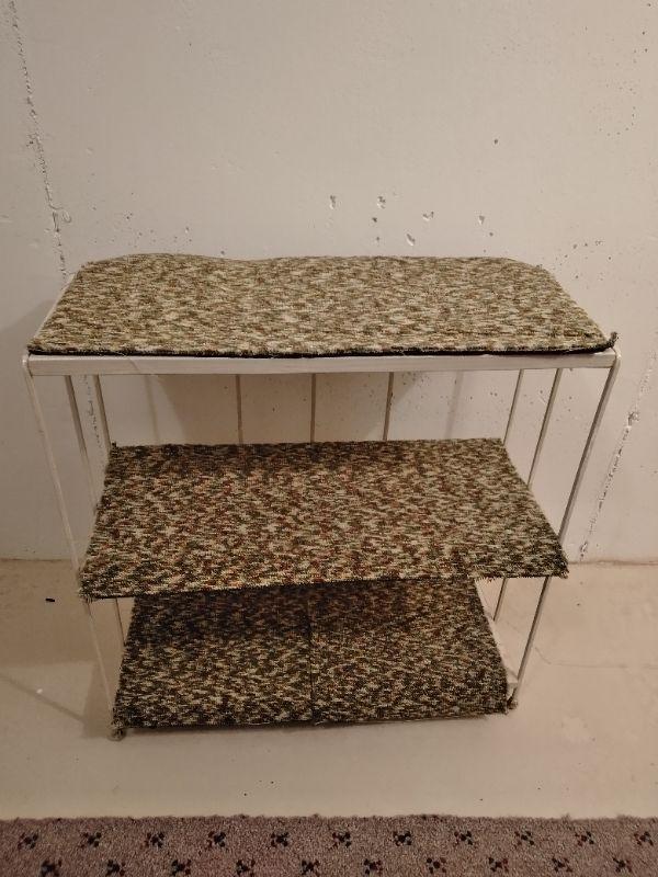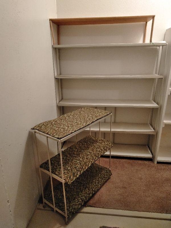 TWO STORAGE UNITS BOTH HAVE METAL FRAMES. SMALL ONE IS 25" X 24.5" X 9.5" TALLER ONE IS 47" X 40" X 9.5" THE SMALLER ONE HAS CARPET ATTACHED TO THE SHELVES.