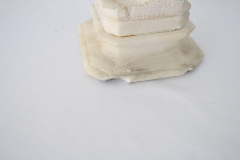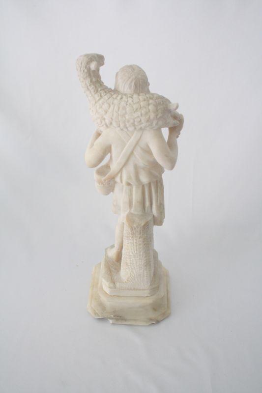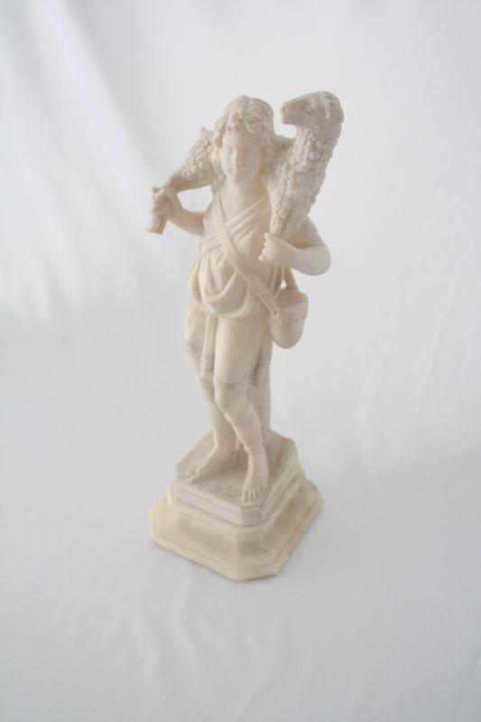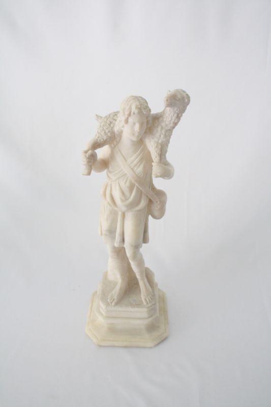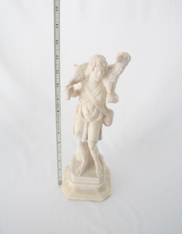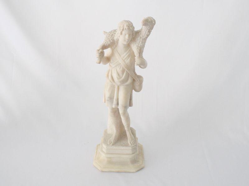 Italian Alabaster Shepherd Statue - Italian style alabaster carved stone sculpture of a shepherd boy carrying a sheep on his shoulders. Measures 4.5" (width) and 12" (height). Damaged- has a chip on the base as shown in pictures.