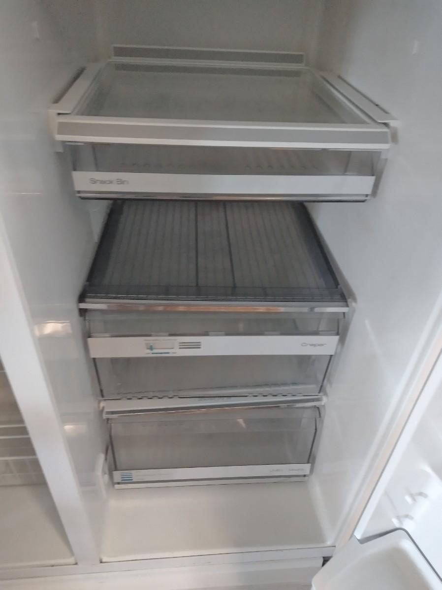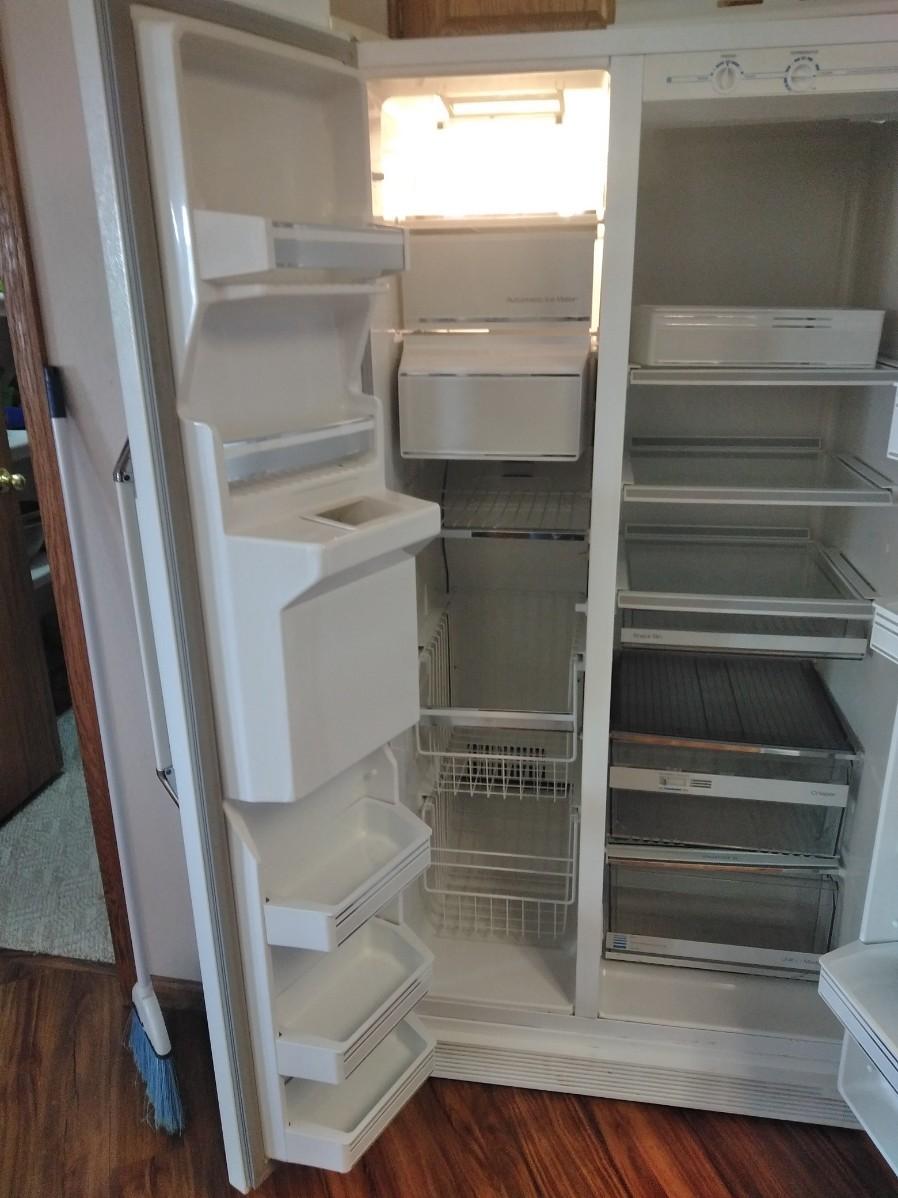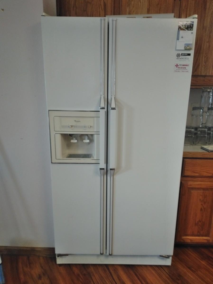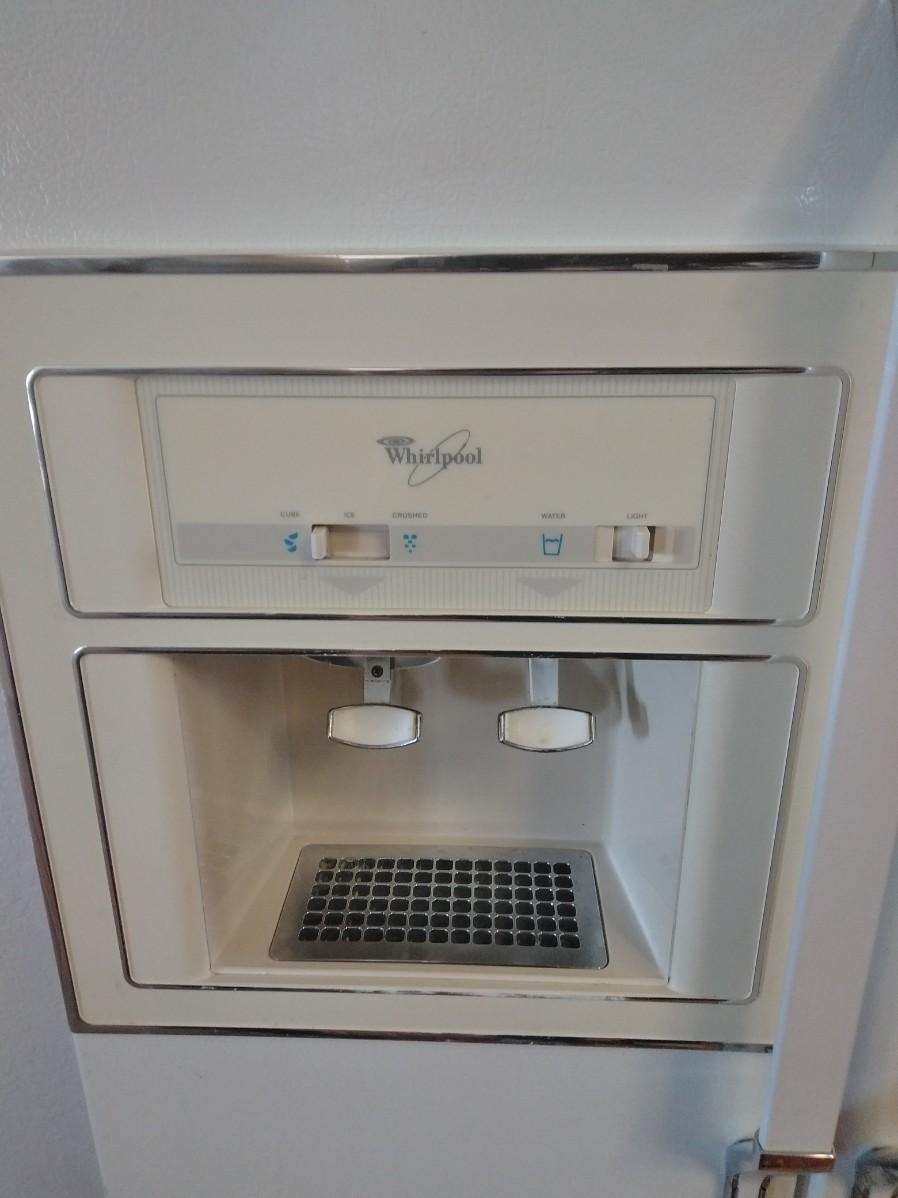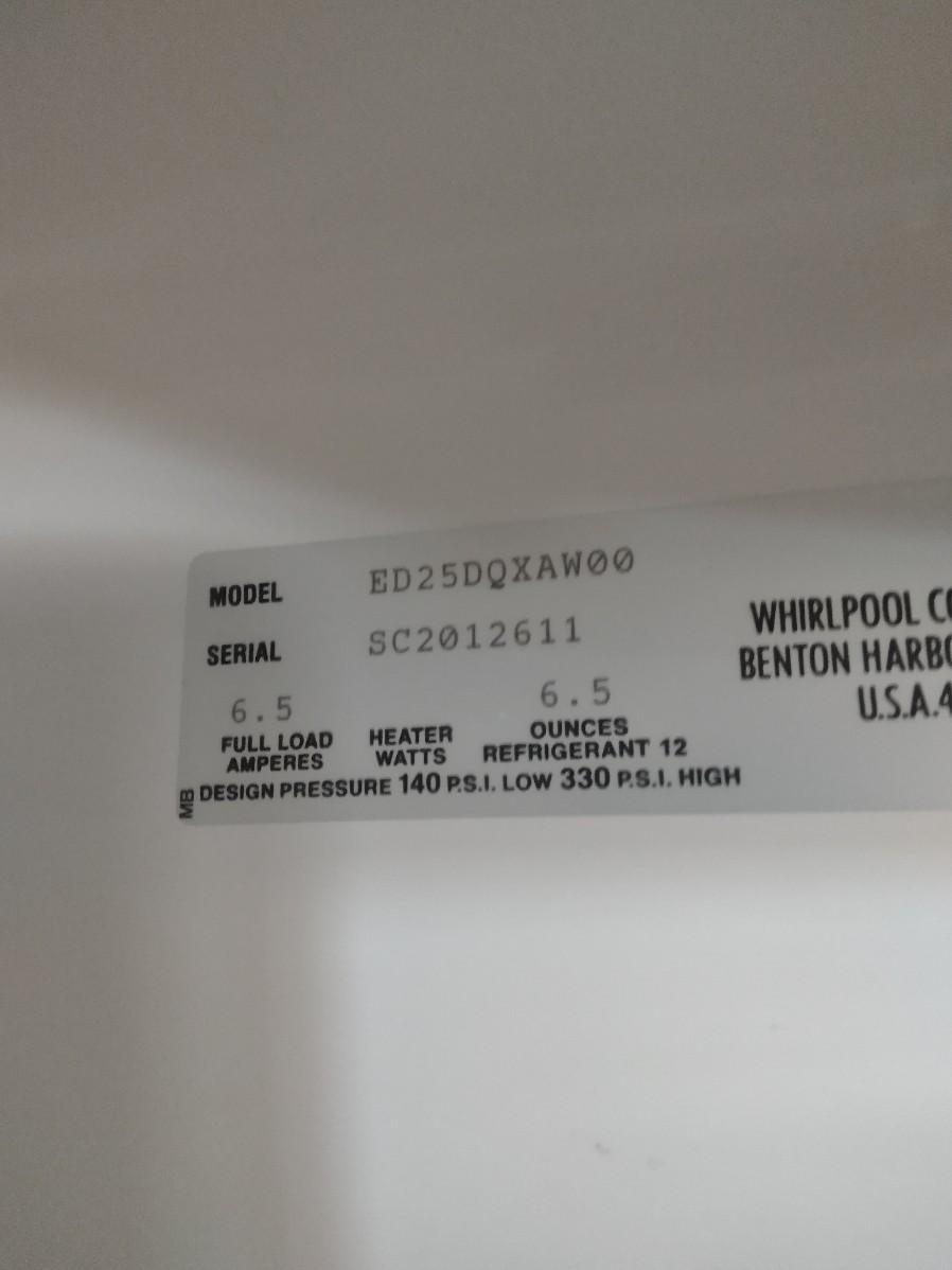 WHIRLPOOL SIDE BY SIDE FRIDGE FREEZER 5'8" x 32" x 35" WITH WATER AND ICE DISPENSER. MODEL NUMBER ED25DQXAW00