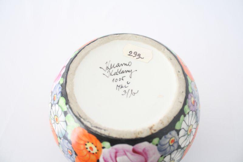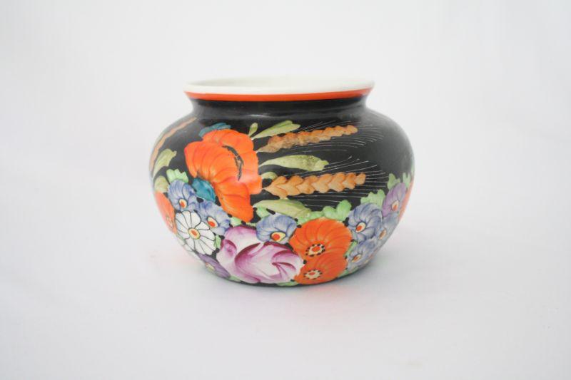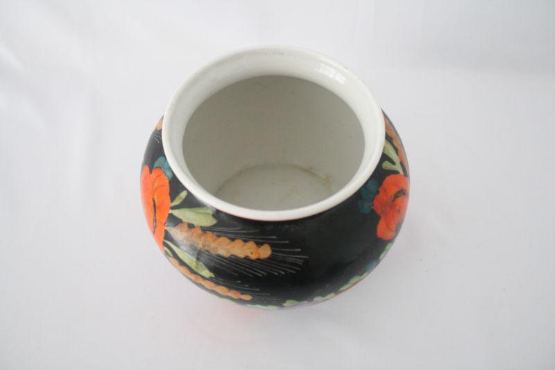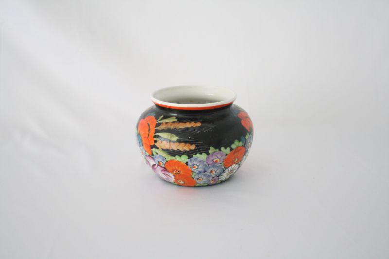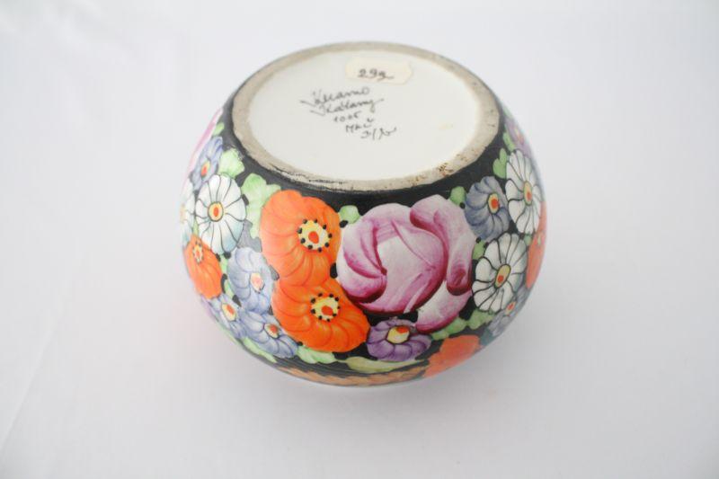 Small Hand Painted Signed Vase - Small black vase painted with bright colored flowers. Signed by an unknown artist. Measures approximately 6 inches wide and 4.5 inches tall.
