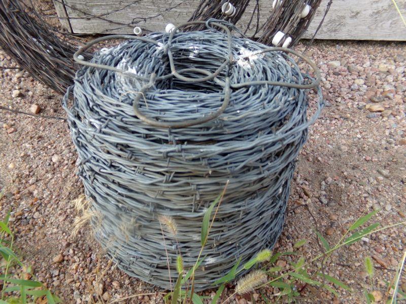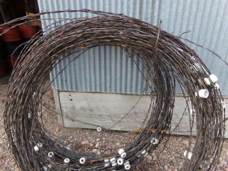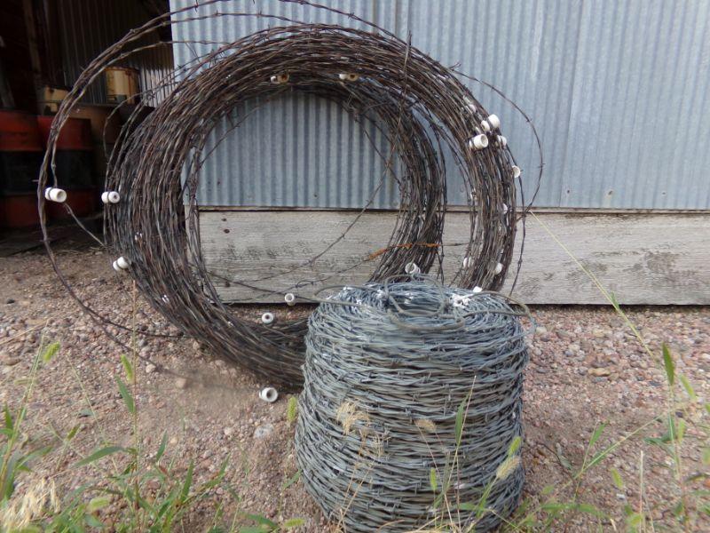 SPOOL OF BARBED WIRE AND 2 ROLLS OF ELECTRIC BARBED WIRE.
