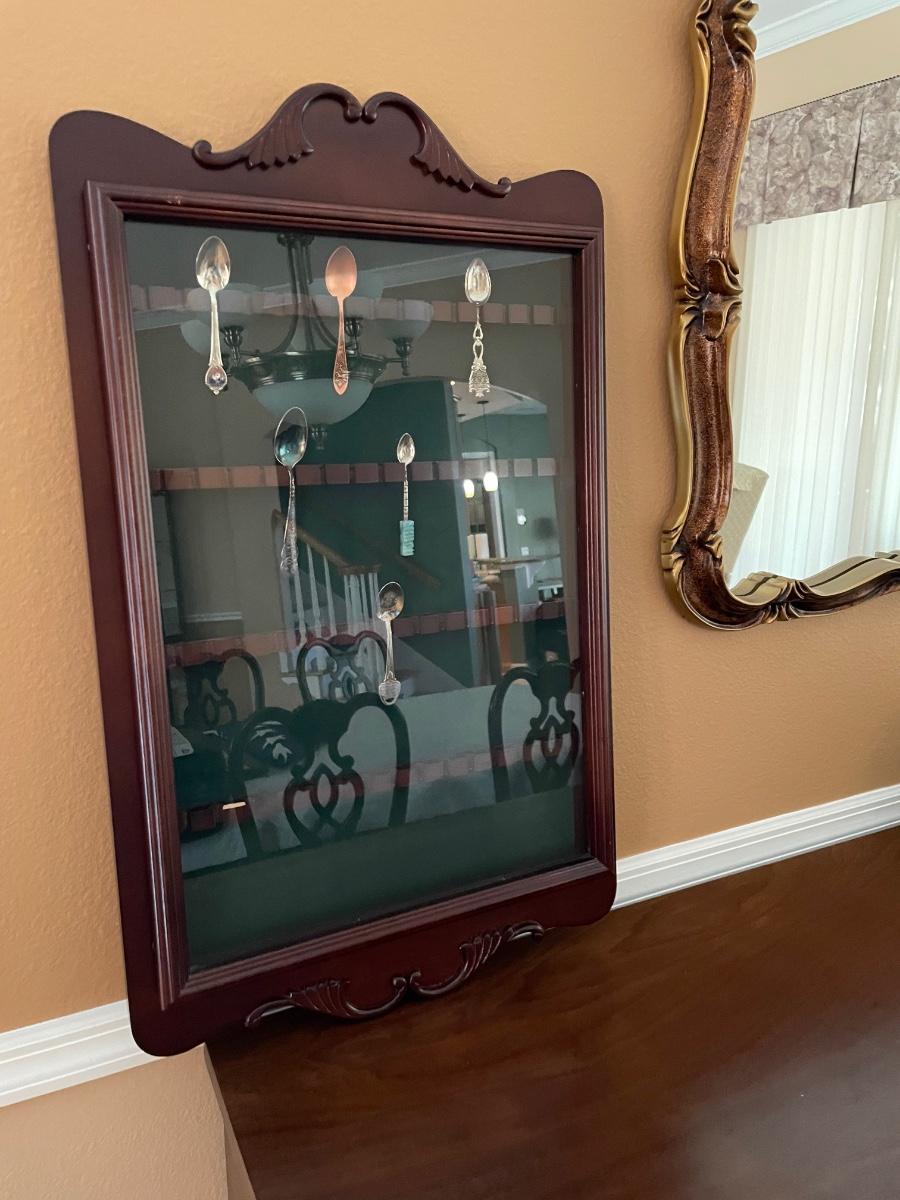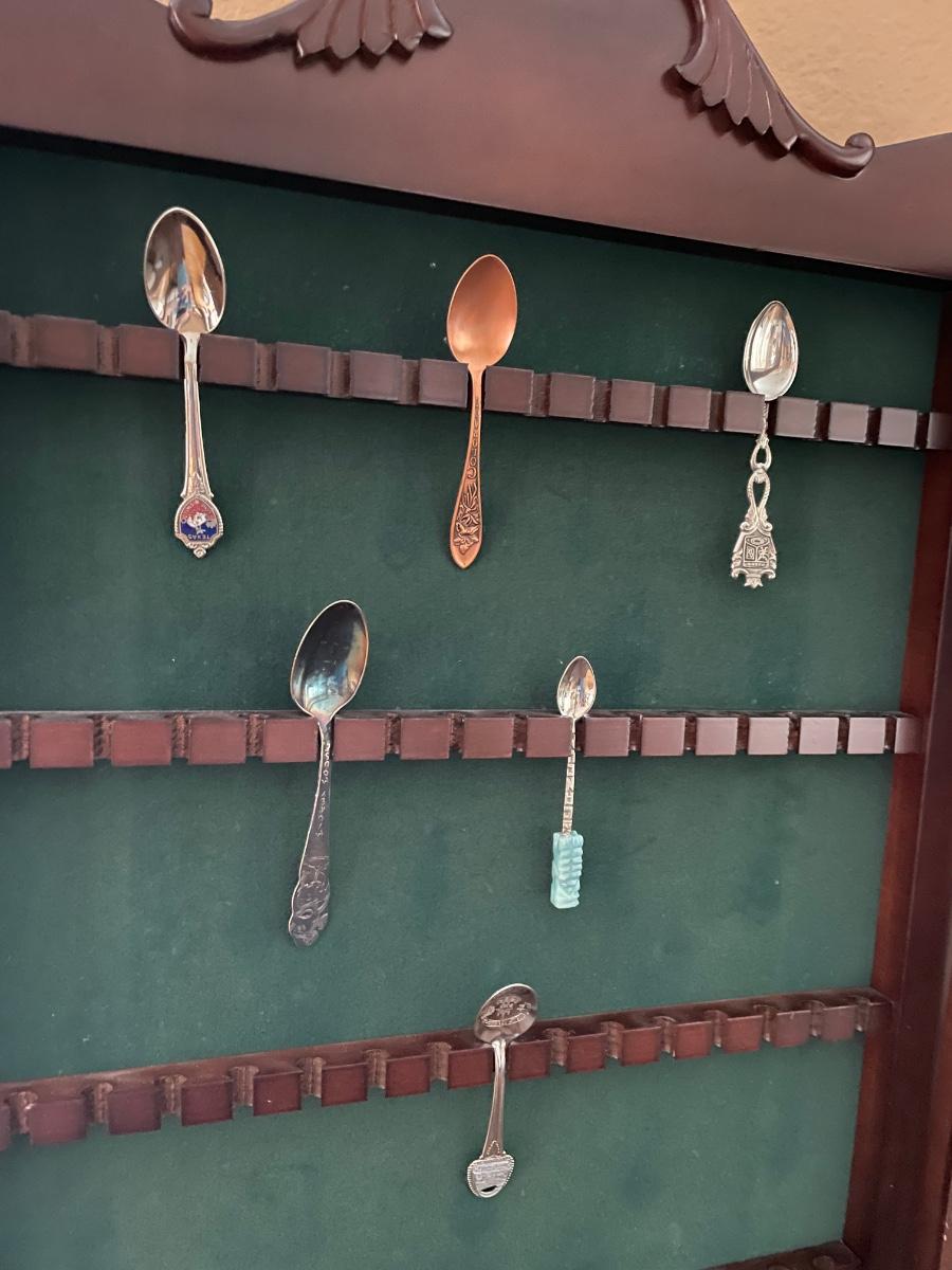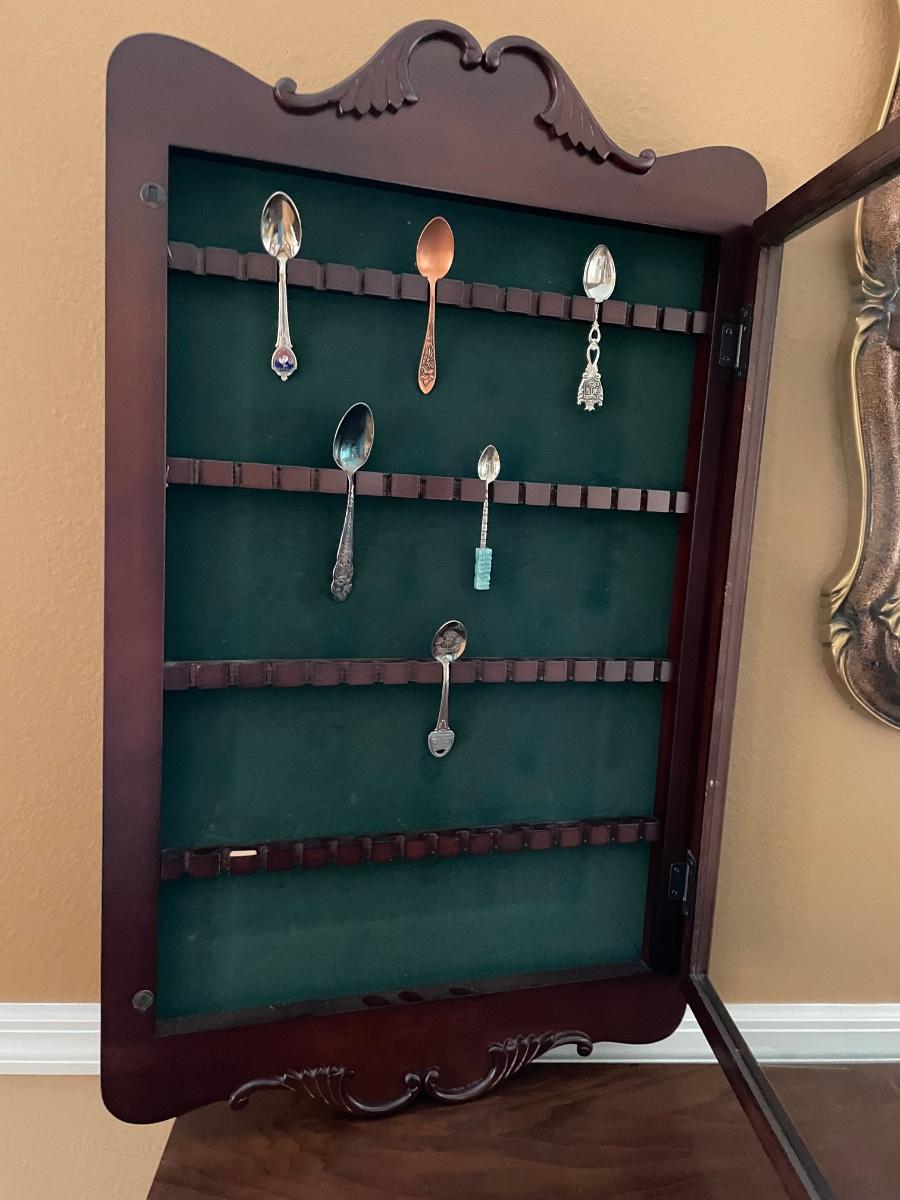 16" x 24" Glass front and lined in felt with wooden racks for tiny spoons