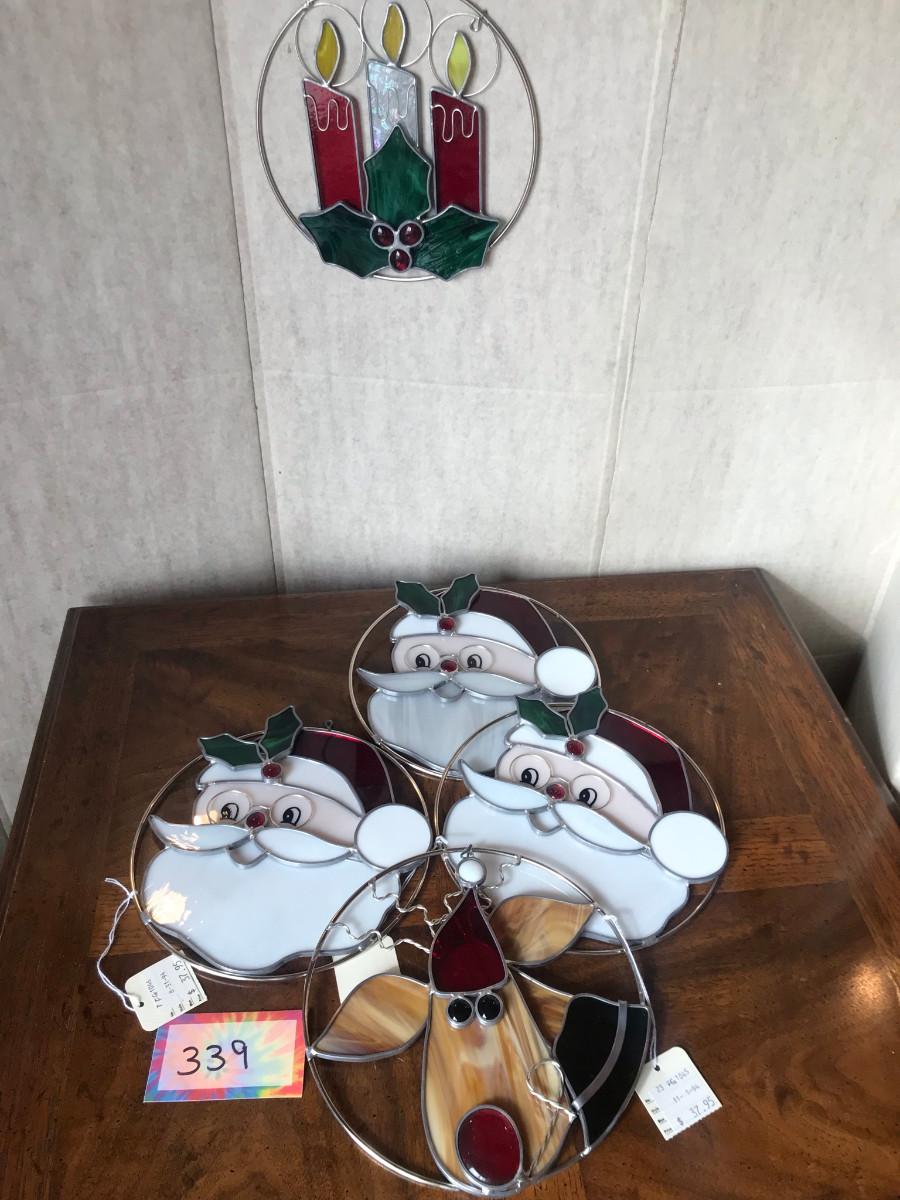 You get 5 sun catchers. 3 Santa's, a Reindeer, & Candles. They are about 6" diameter. They sold originally for $37.95 each in 1994! I believe these either came from Estes Park or a gift shop in Ft. Collins! Great for gifts!