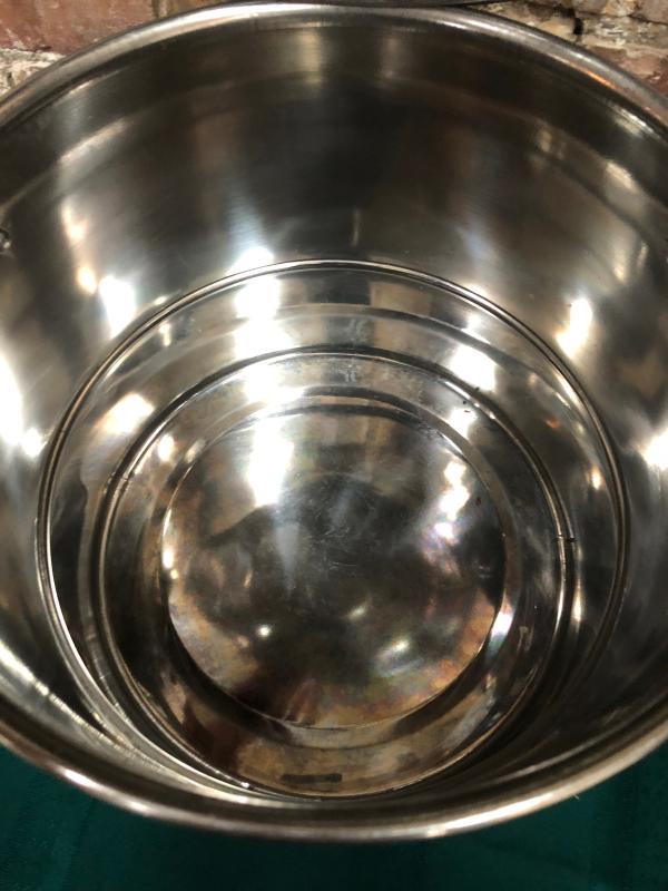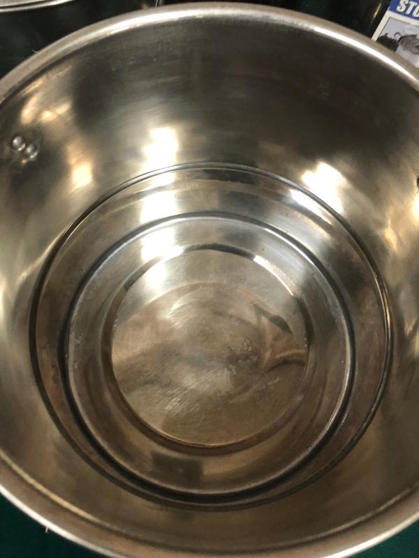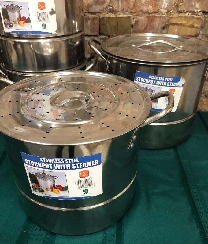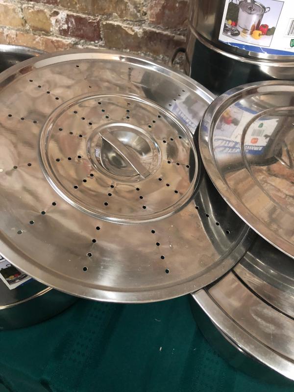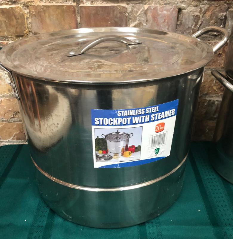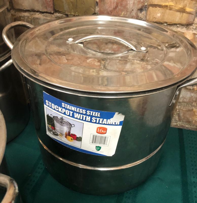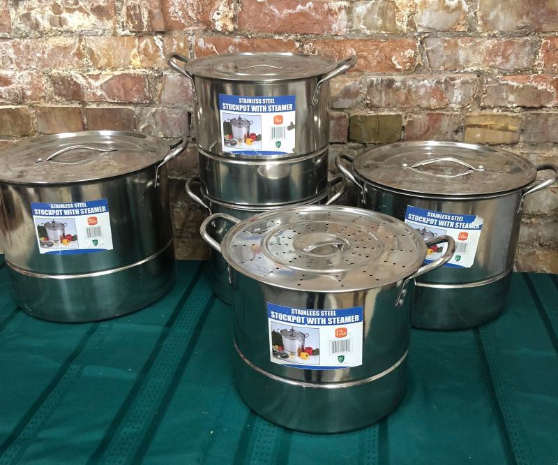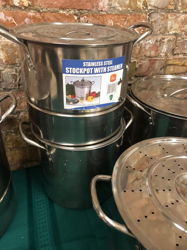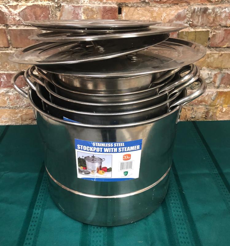 New condition with labels here are (5)five stainless steel Stockpots...20qt..16qt..12qt..8qt(2x)...with perforated tops as well...
