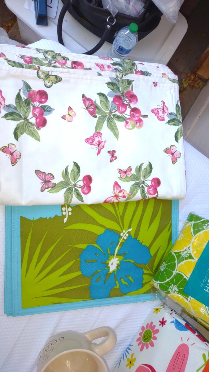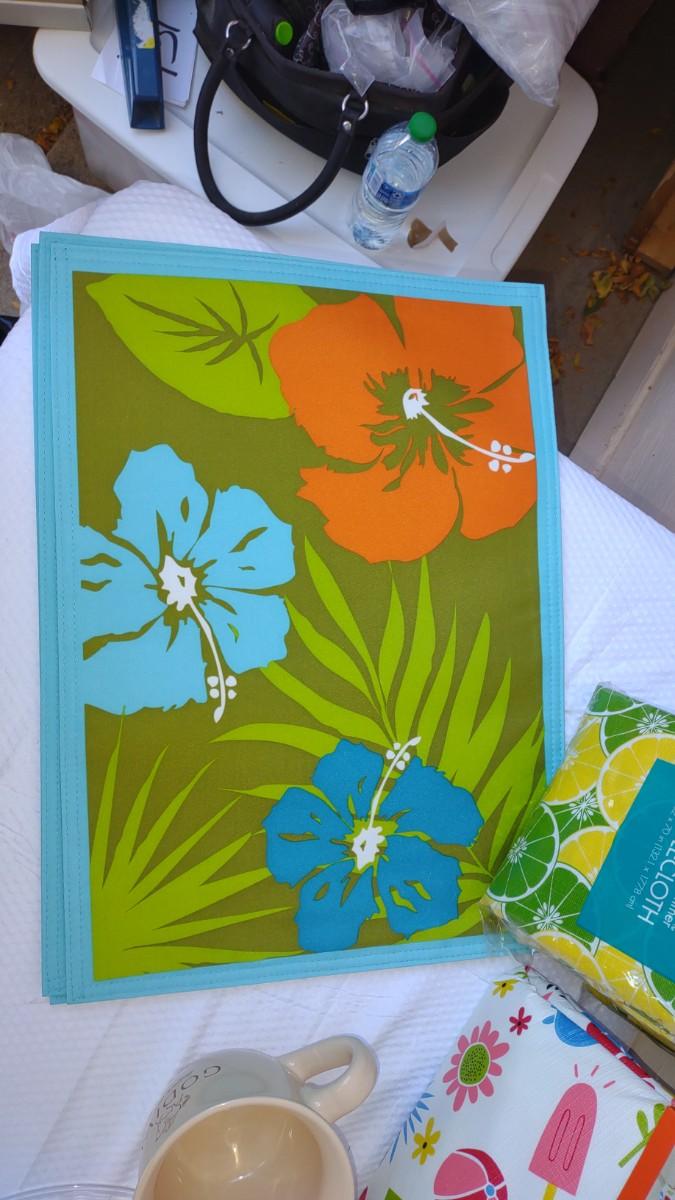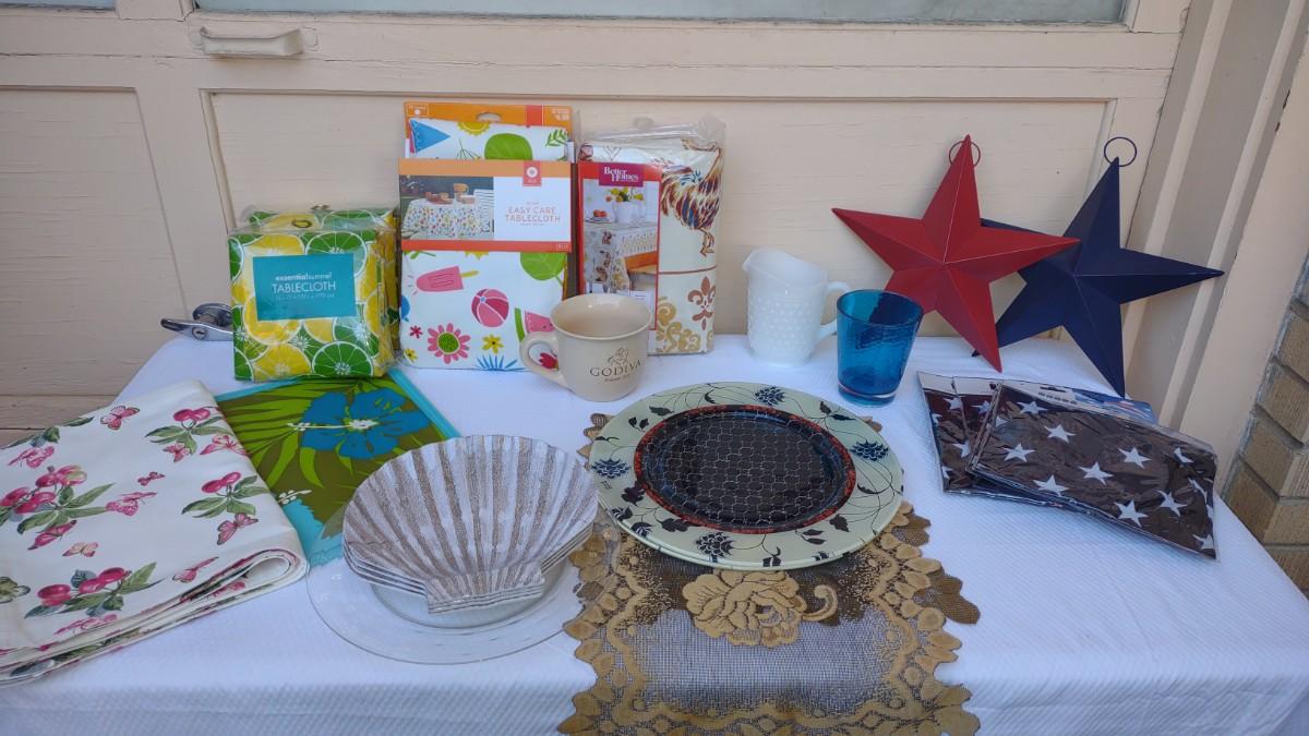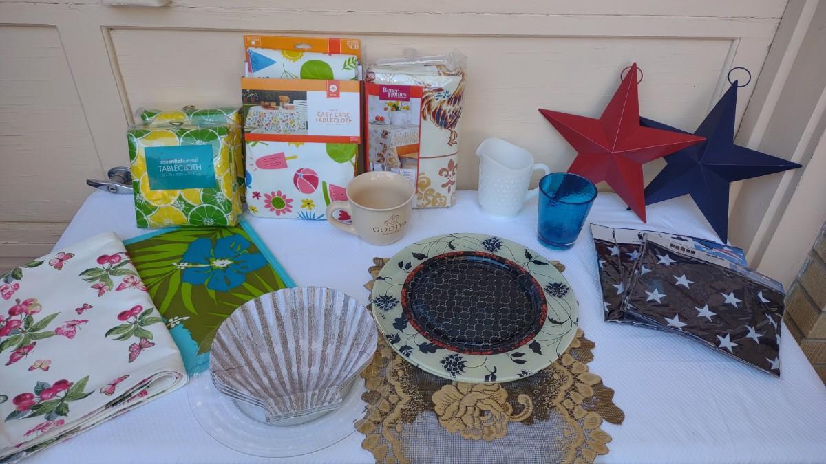 THIS LOT DEFINITELY HAS A SUMMER FEEL TO IT. WITH DECORATIONS FOR 4TH OF JULY TO PLASTIC TABLECLOTH COVERS, 4 SEASHELL PLASTIC PLATES, AND AWESOME PLACEMATS. THE BLUE PLACEMATS HAVE 3 TOTAL. AND THE BUTTERFLY PLACEMATS HAVE A TOTAL OF 6