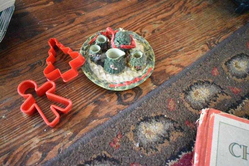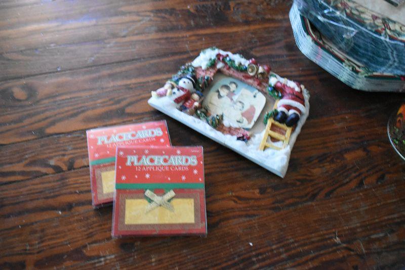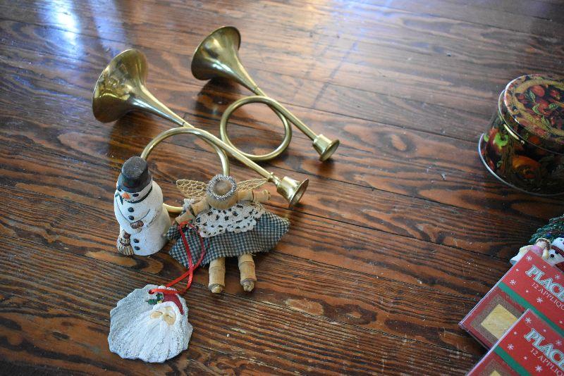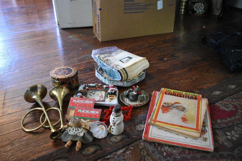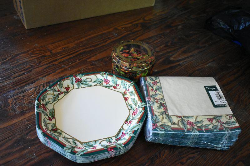 Two brass horns, paper plates and napkins, children's books and more. Bring container to remove items in.