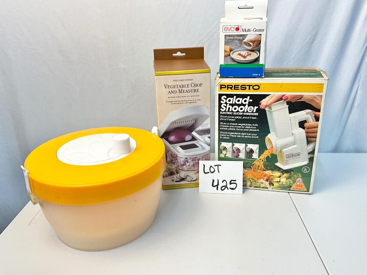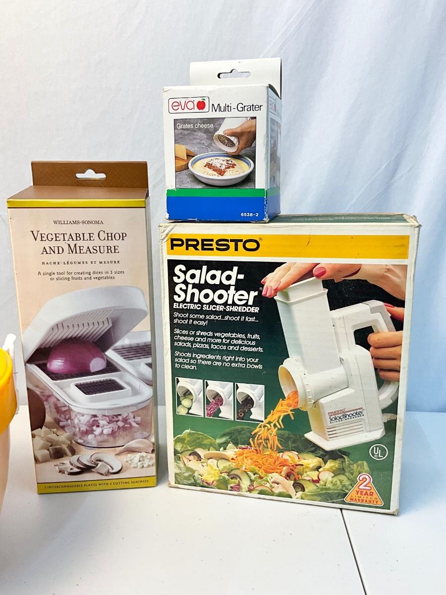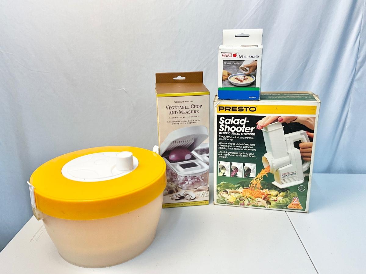 Lot T 425 NIB Presto Salad Shooter / NIB William-Sonoma Vegetable Chopper / NIB Eva Multi Grater / Salad Spinner