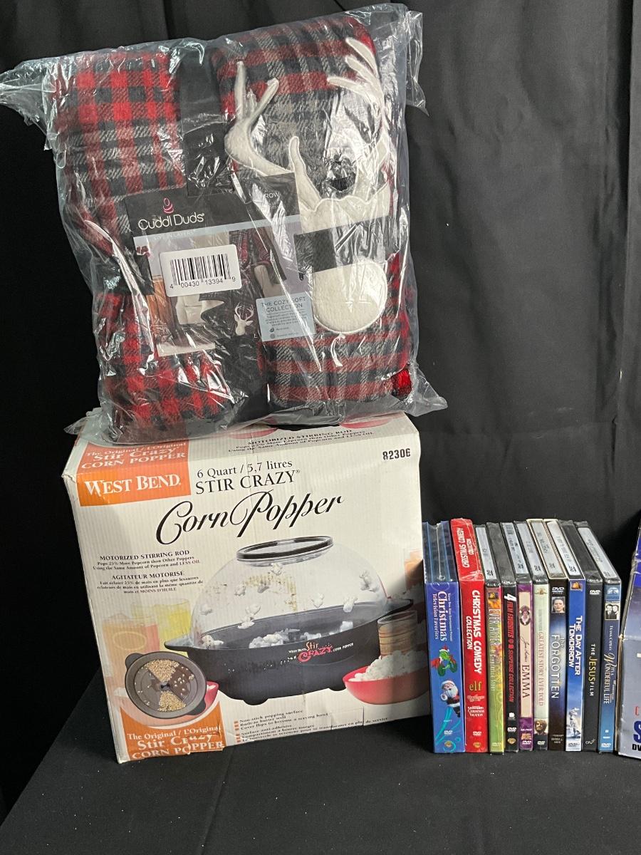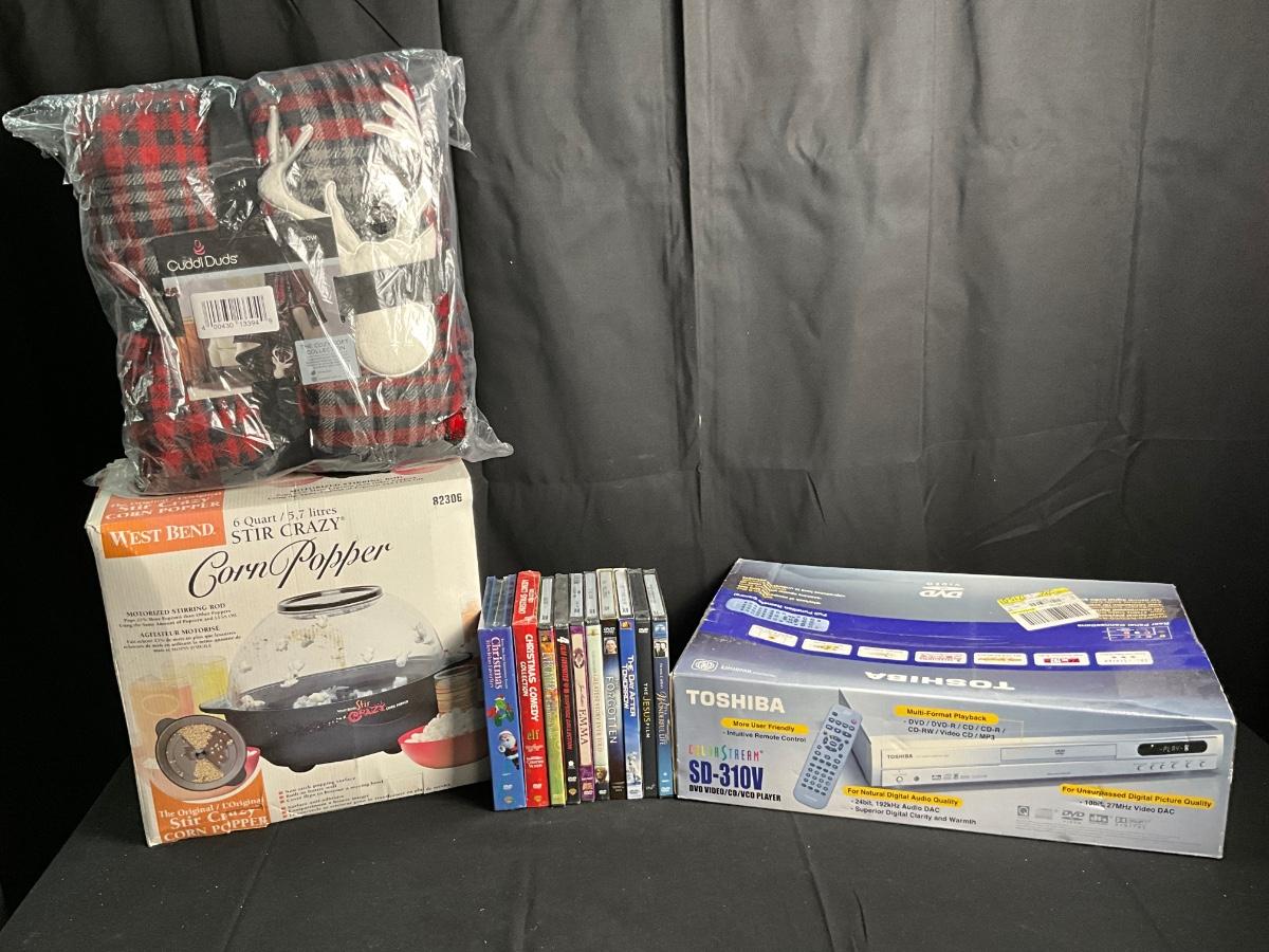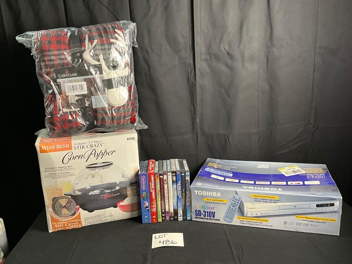 Lot T 486 NIB West Bend Stir Crazy Corn Popper / NIB Toshiba DVD Player & DVD’s / NWT Cuddl Duds Throw