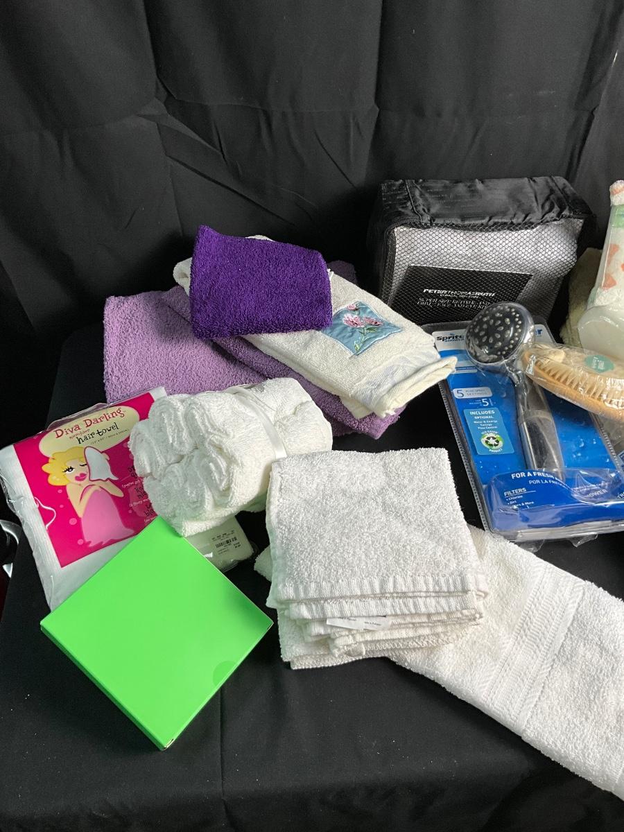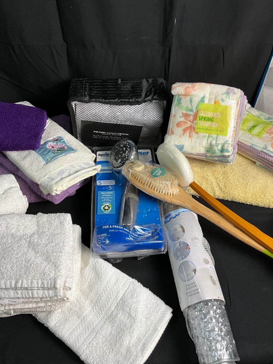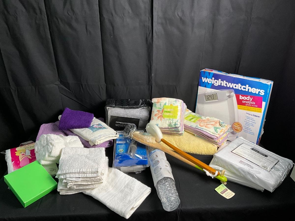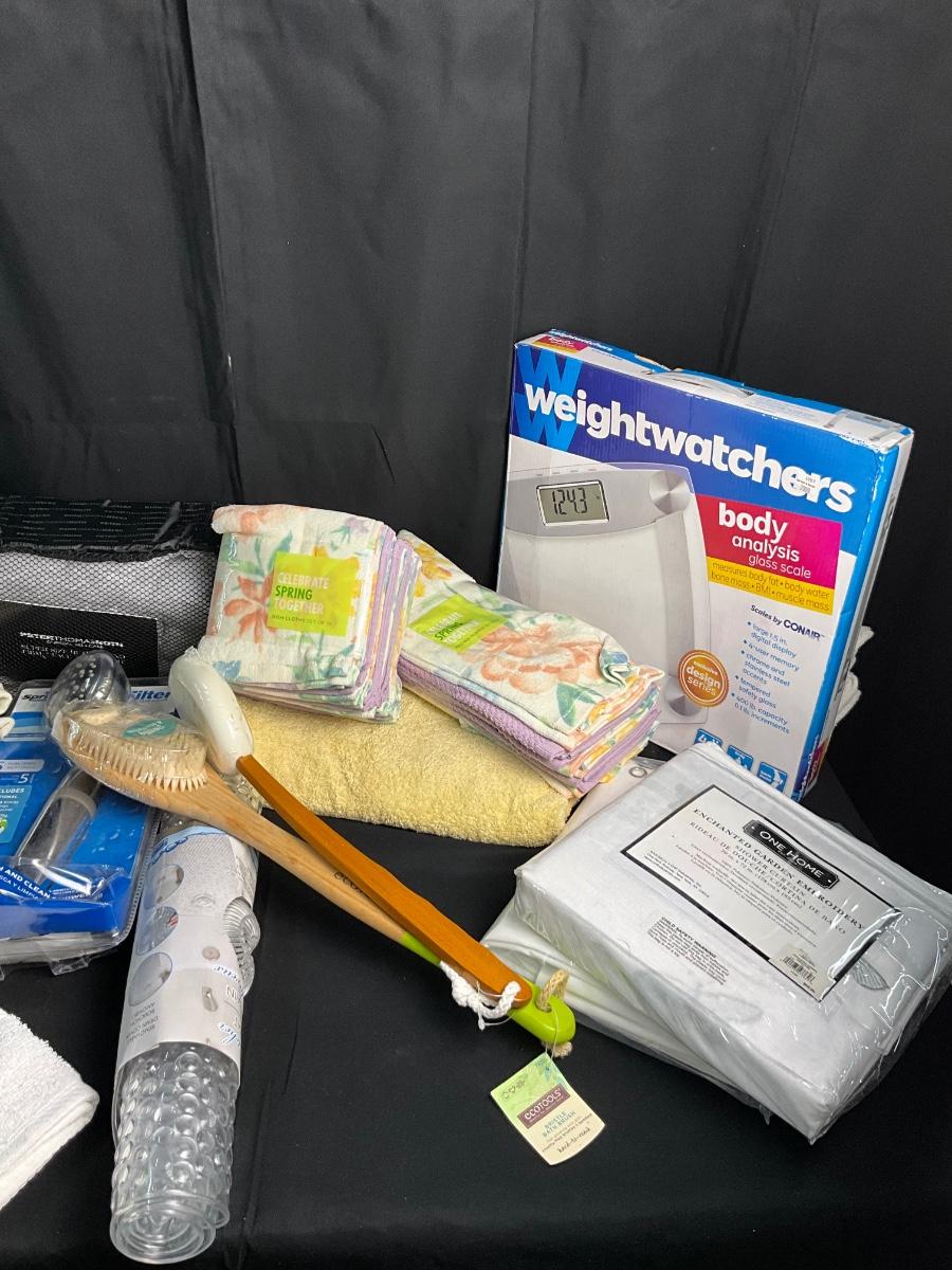 Bath Towels/ Hand Towels/Shower Curtain/Face Cloths/NIB Weight Watchers Scale/ NIB Shower Head