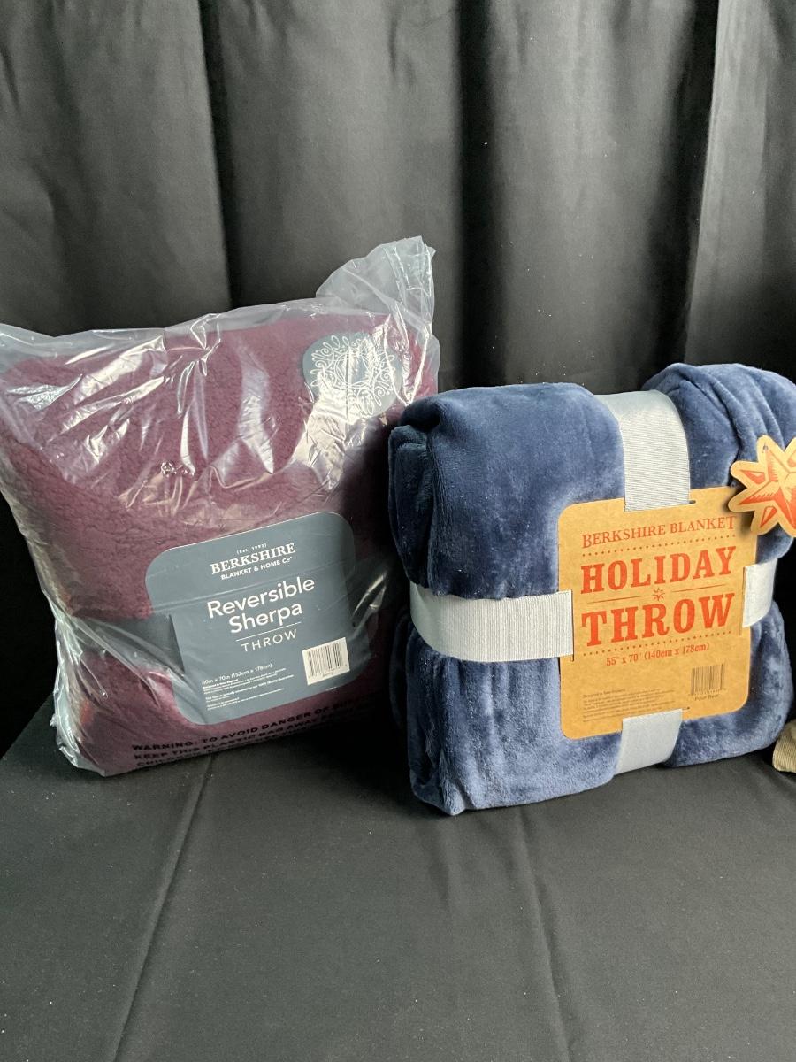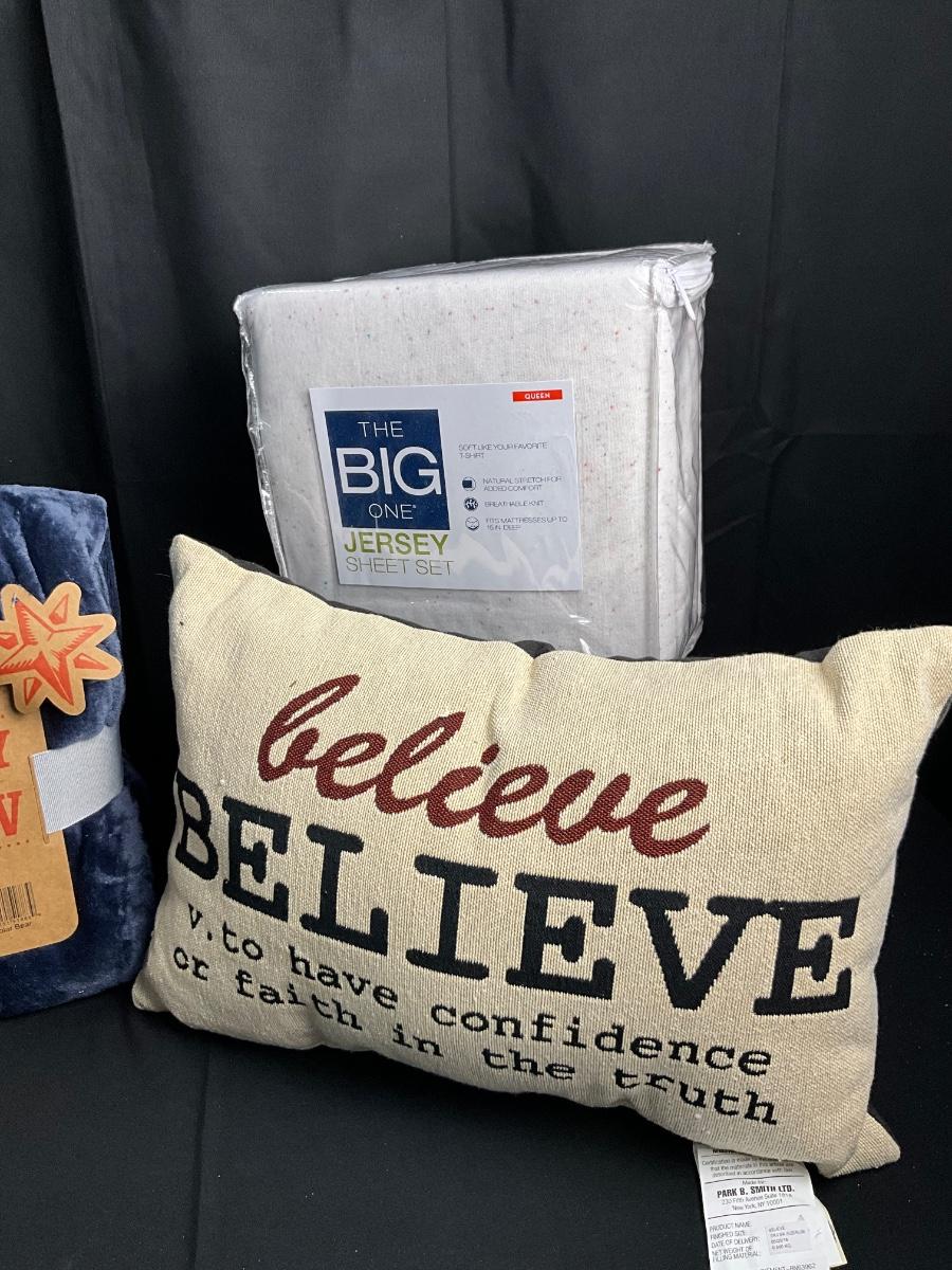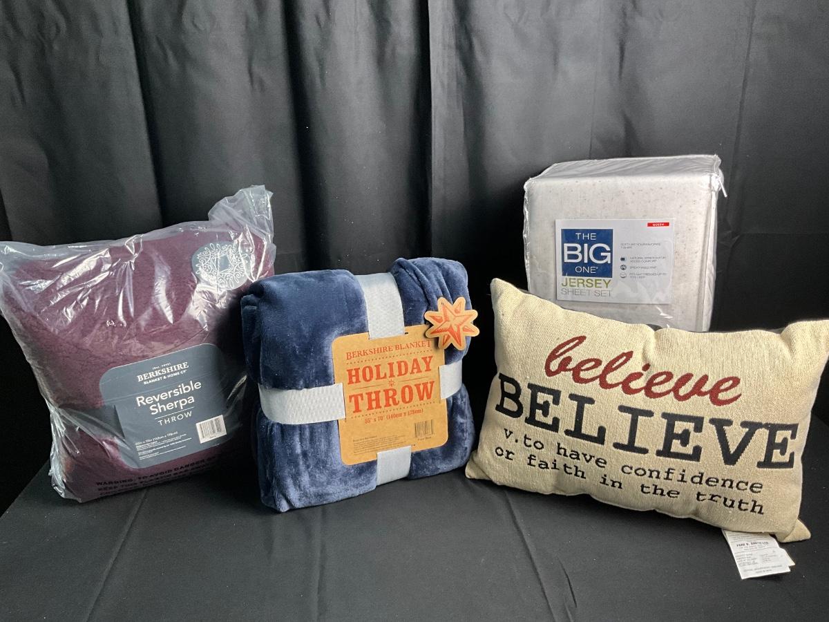 Lot T 494 NWT Berkshire Reversible Sherpa / NWT Plush Throw / BELIEVE Pillow / Jersey Queen Size Sheet Set