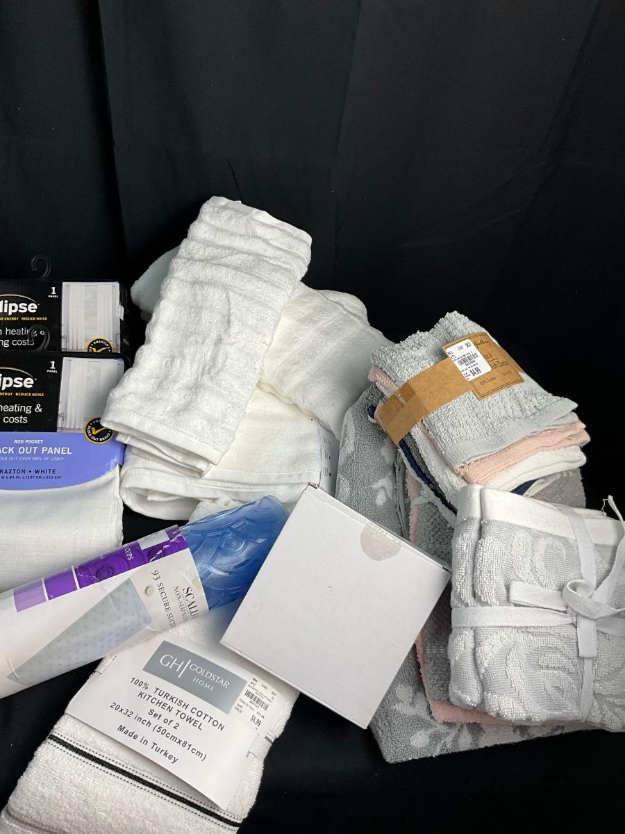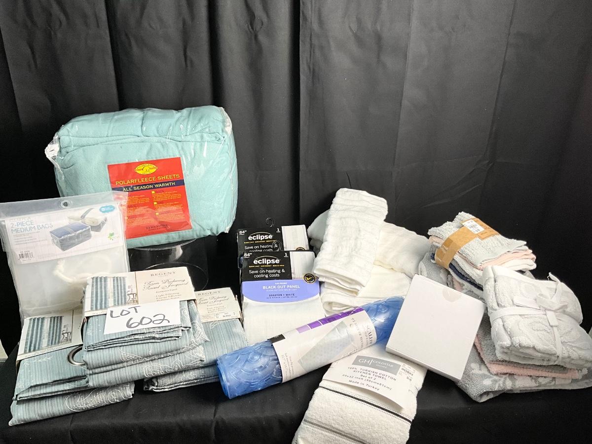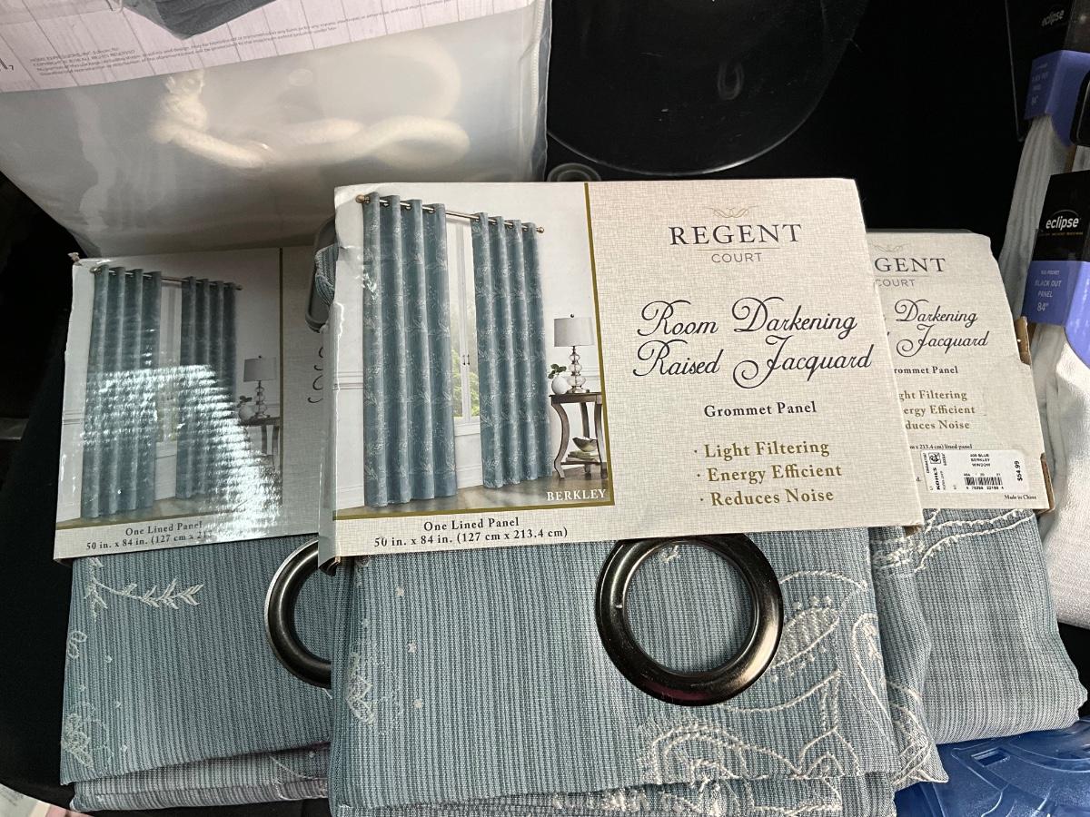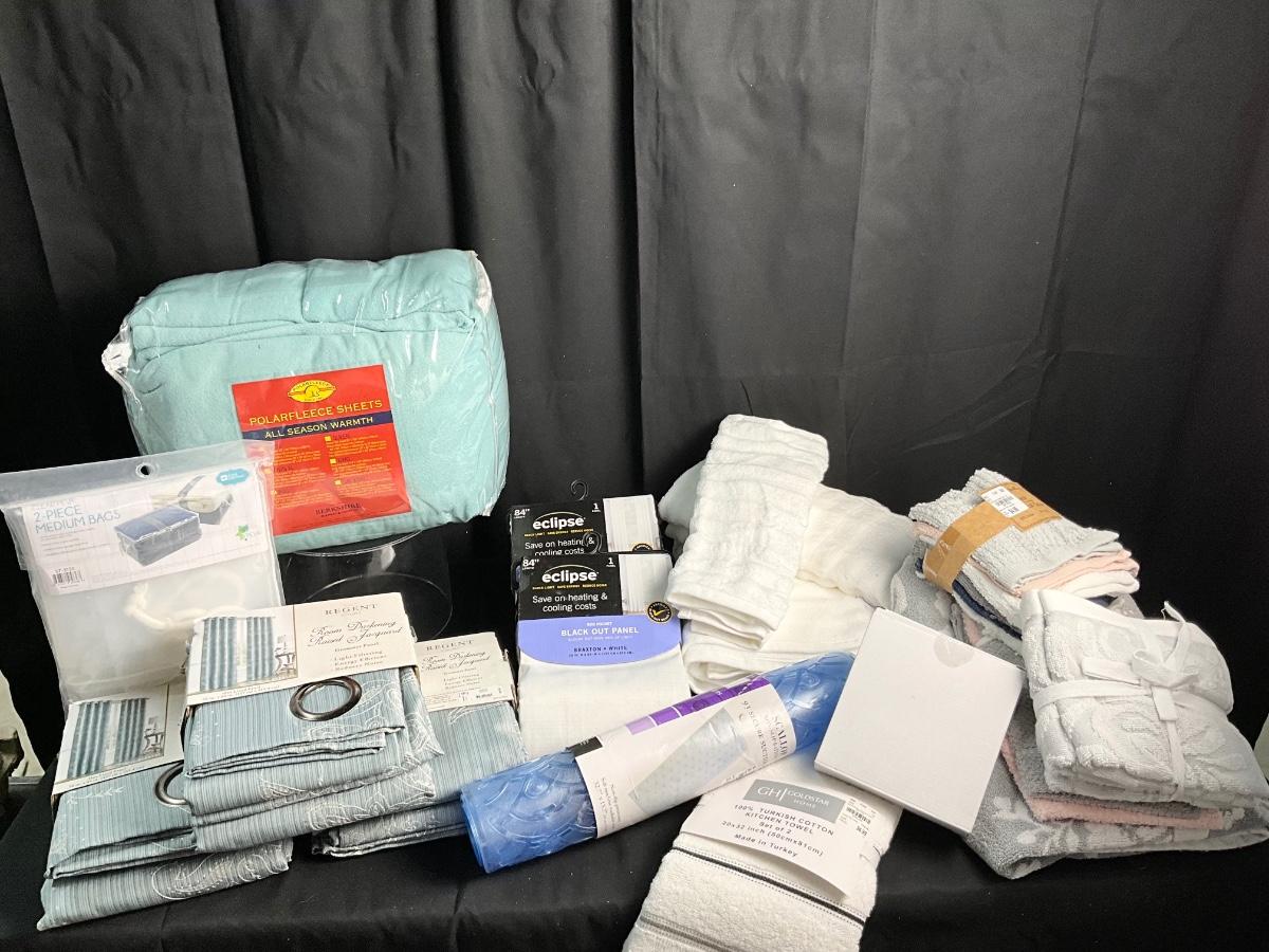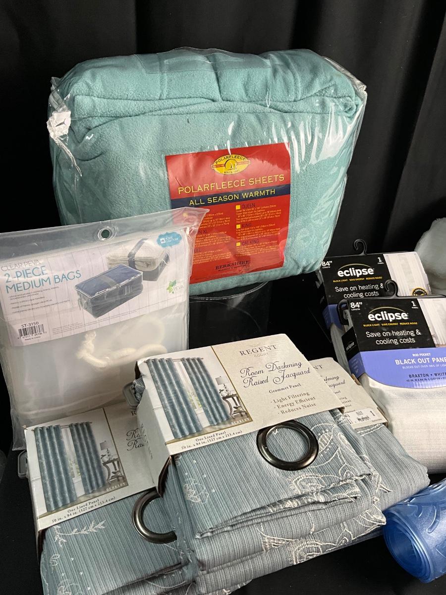 Lot T 602 NIB Sage Colored Flannel Sheet Set, NIB Regent Court Room Darkening Panels, NIB White Room Darkening Panels and more