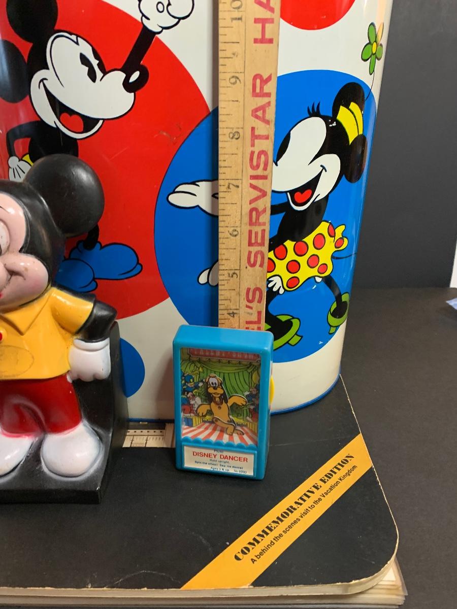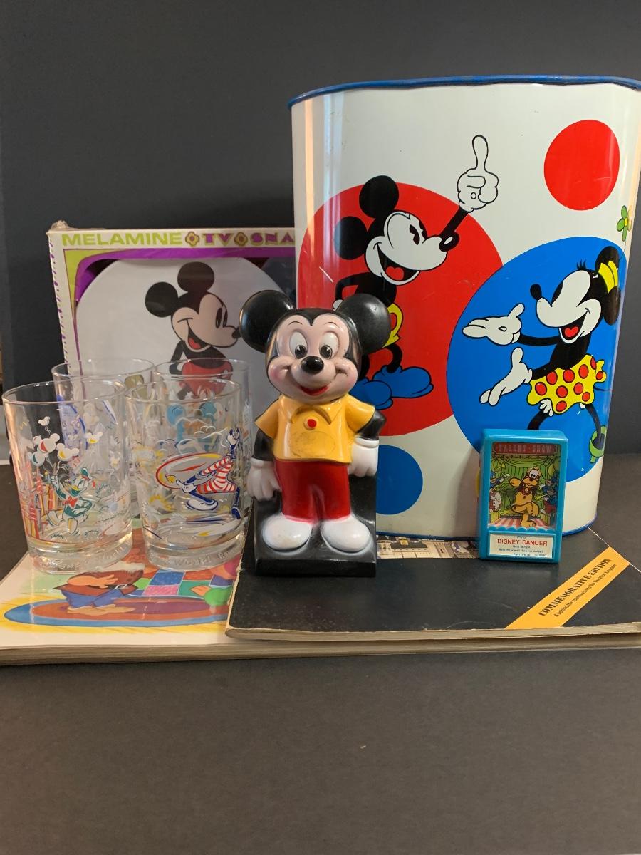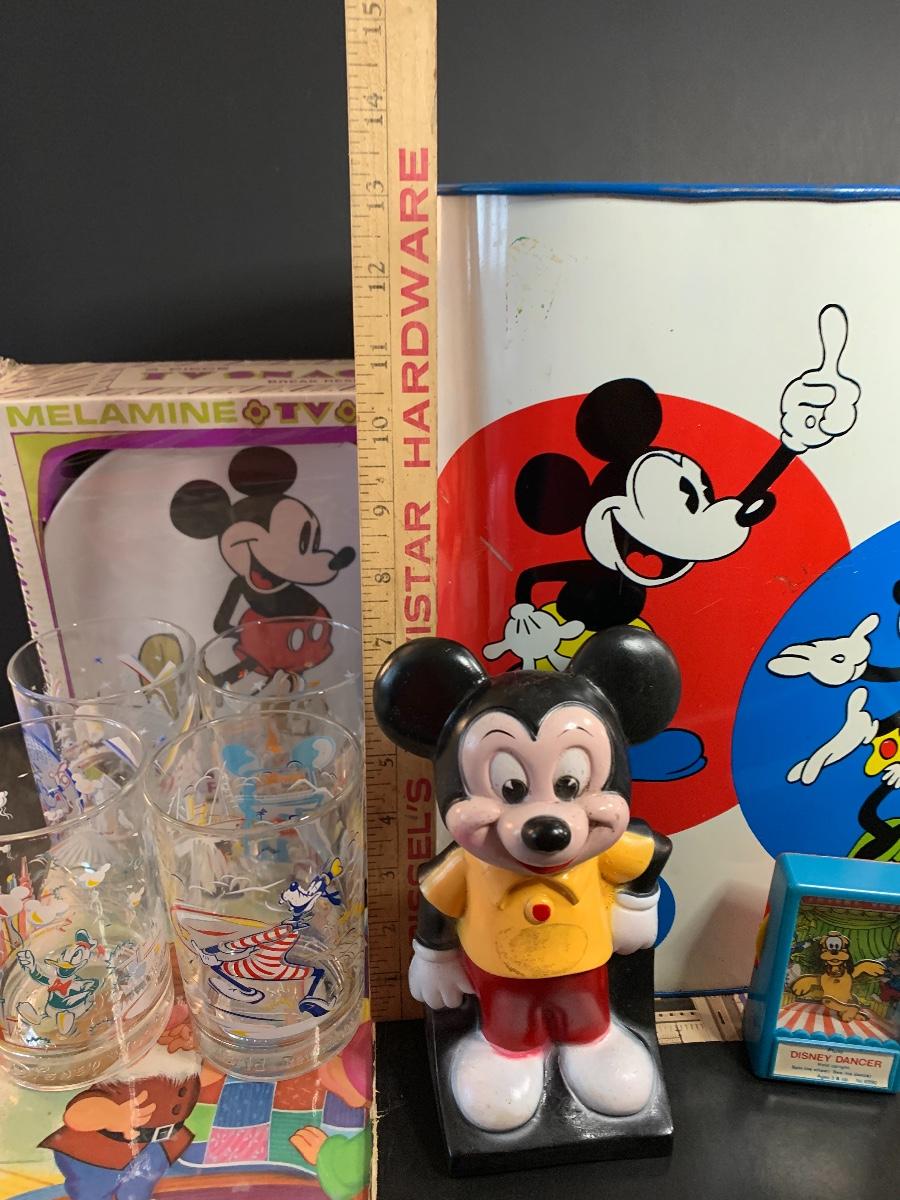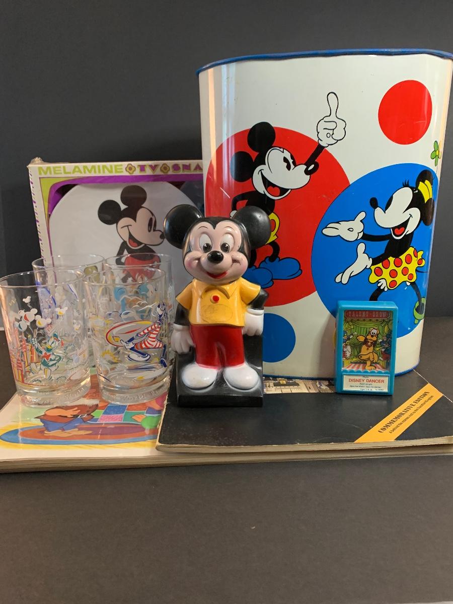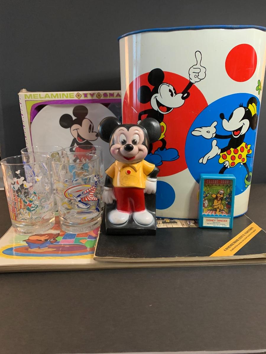 Especially for those who love Disney: A vintage Walt Disney Mickey Mouse, Minnie Mouse, Donald Duck, & Daisy metal waste basket, 1960's vintage placemats, Mickey Mouse bank, Melamine Snack Set - still in original packaging, the story of Disney book, beverage glasses and more. The metal waste basket does have scratches and wear.