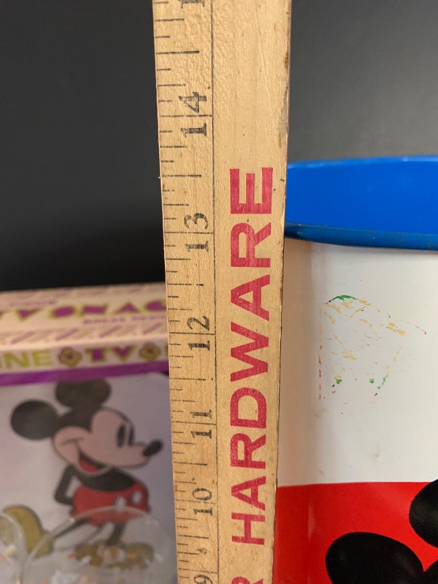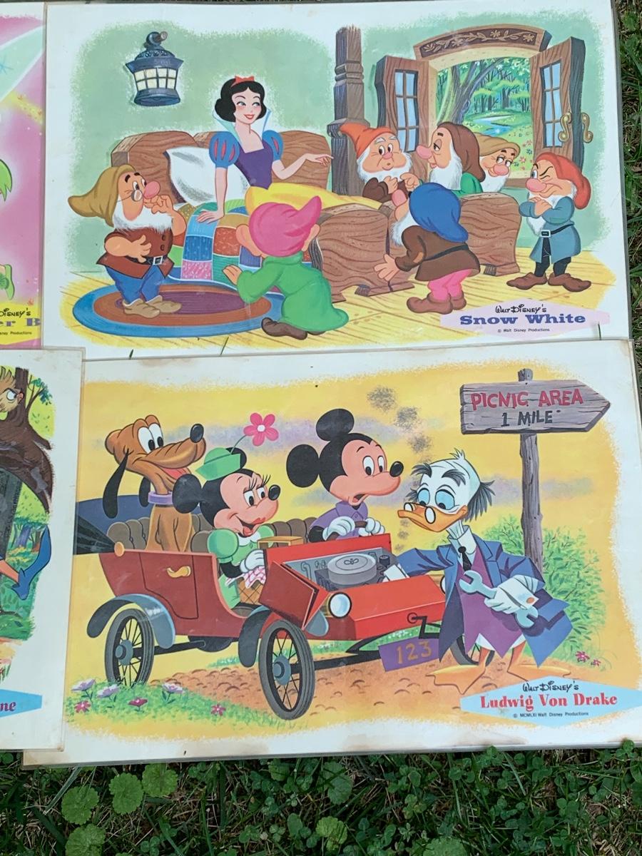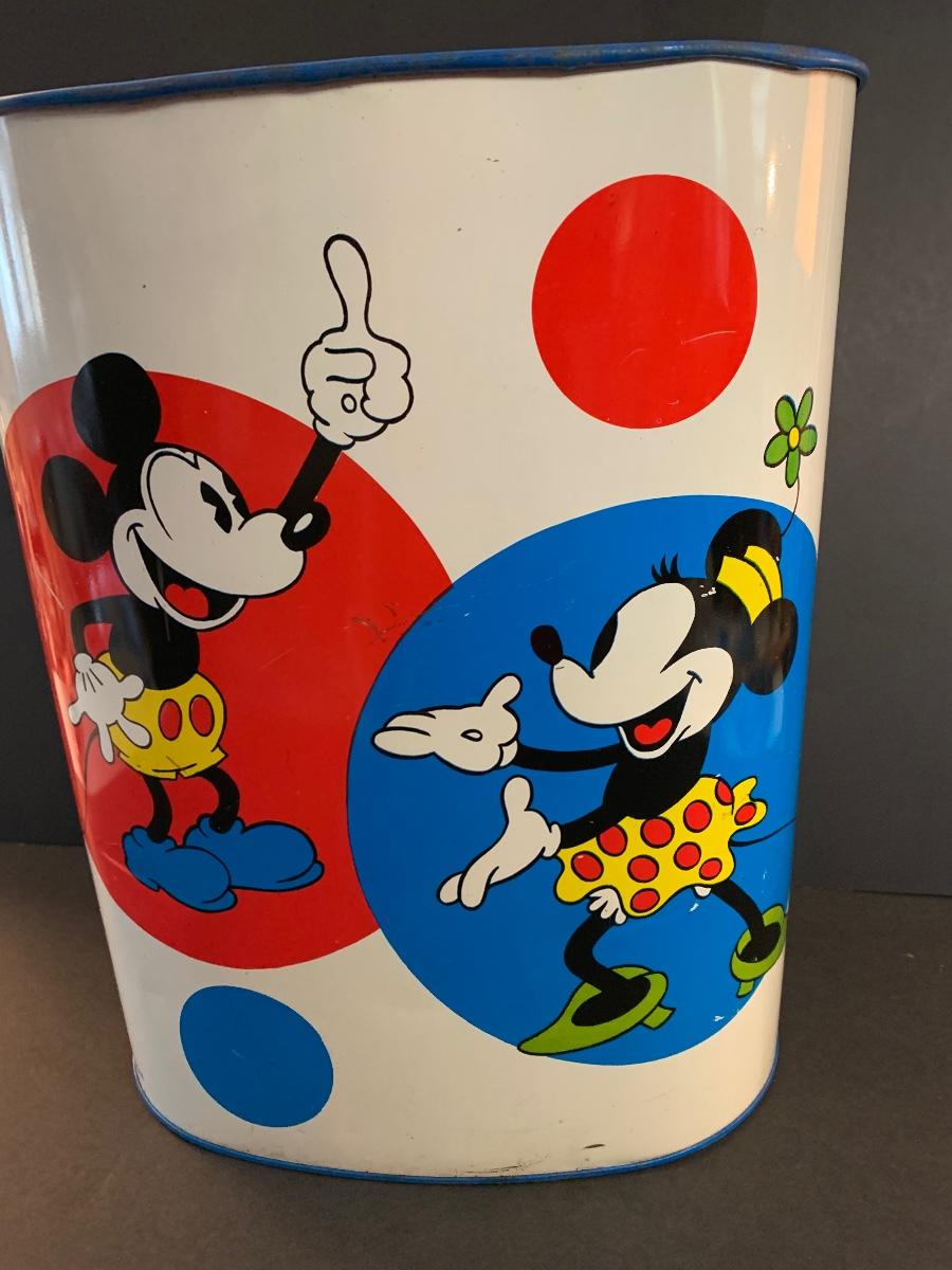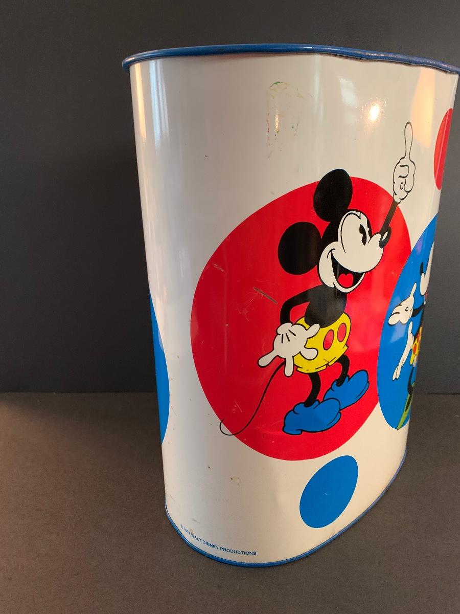 Especially for those who love Disney: A vintage Walt Disney Mickey Mouse, Minnie Mouse, Donald Duck, & Daisy metal waste basket, 1960's vintage placemats, Mickey Mouse bank, Melamine Snack Set - still in original packaging, the story of Disney book, beverage glasses and more. The metal waste basket does have scratches and wear.