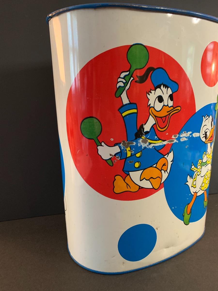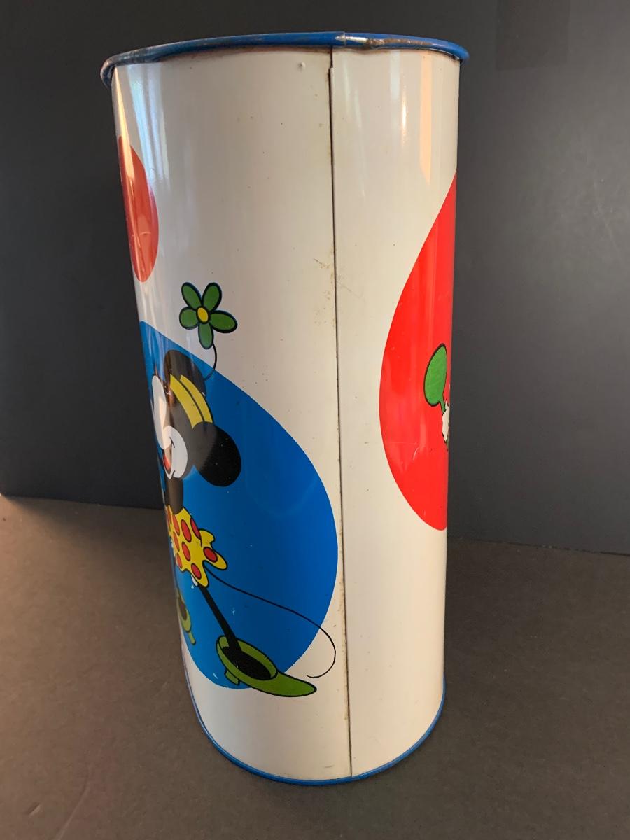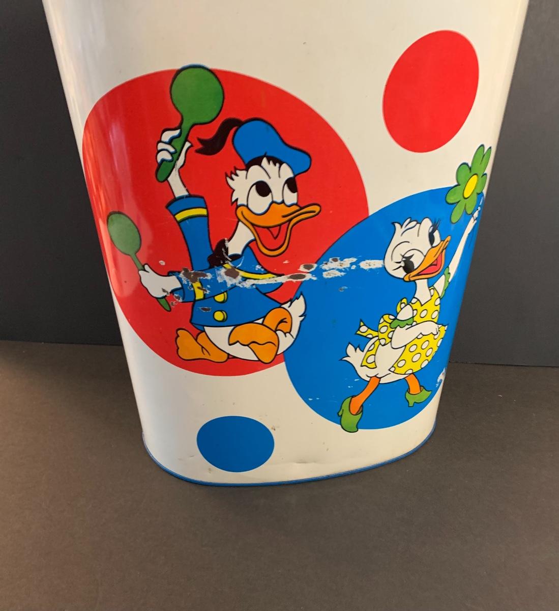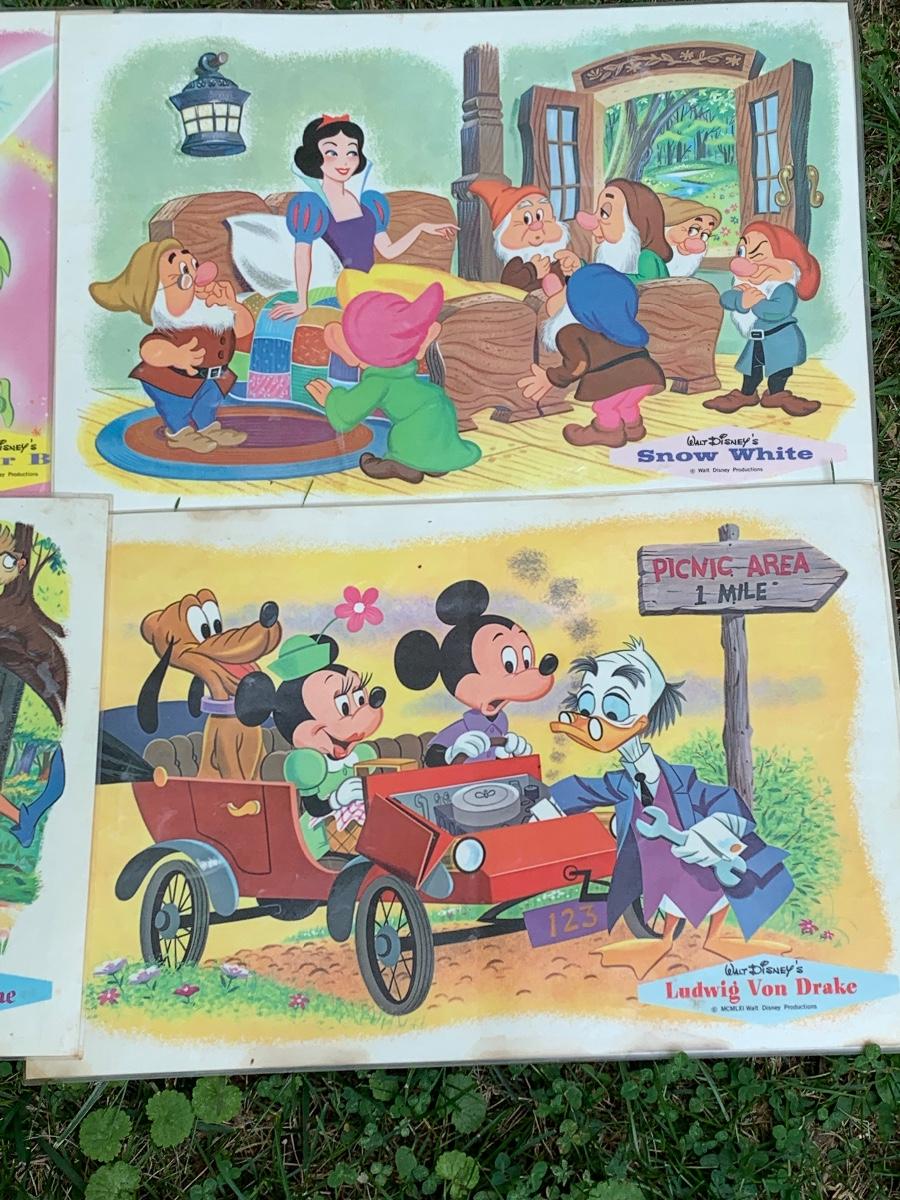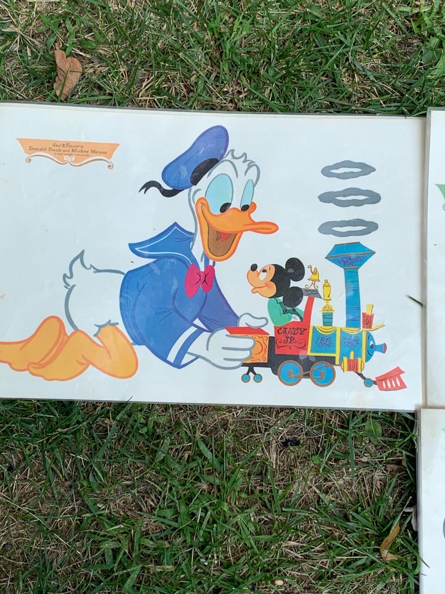 Especially for those who love Disney: A vintage Walt Disney Mickey Mouse, Minnie Mouse, Donald Duck, & Daisy metal waste basket, 1960's vintage placemats, Mickey Mouse bank, Melamine Snack Set - still in original packaging, the story of Disney book, beverage glasses and more. The metal waste basket does have scratches and wear.