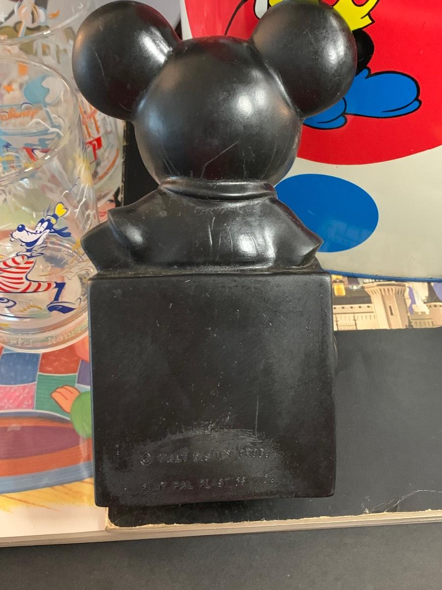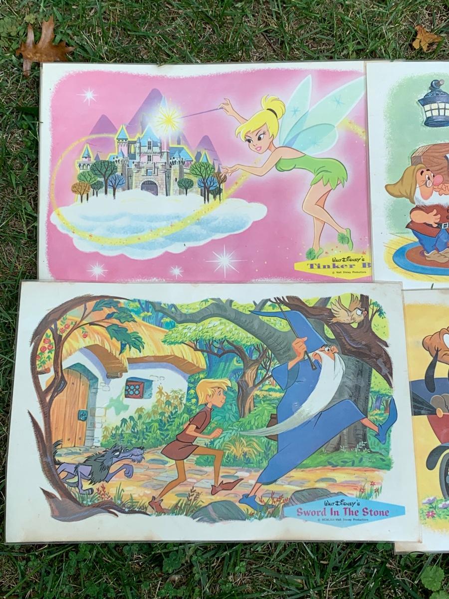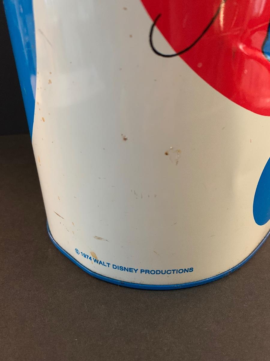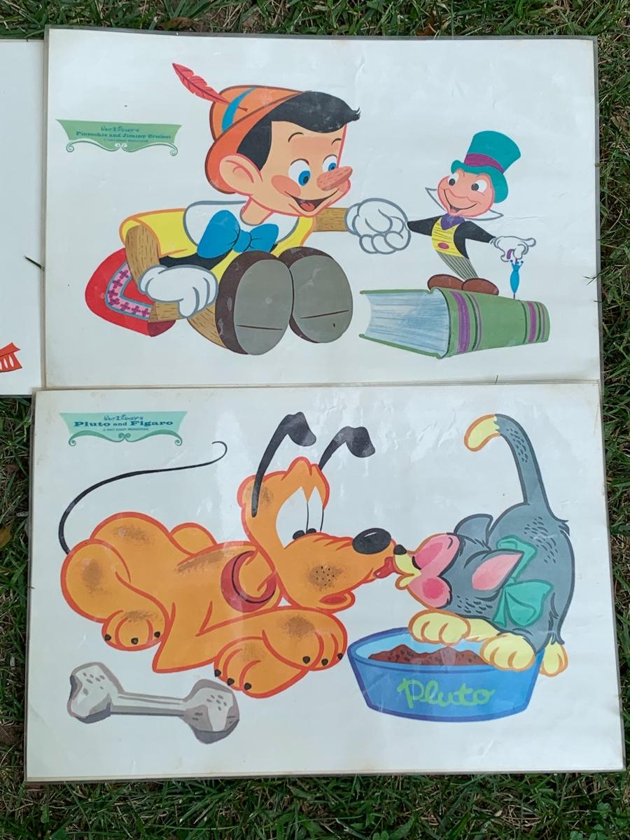 Especially for those who love Disney: A vintage Walt Disney Mickey Mouse, Minnie Mouse, Donald Duck, & Daisy metal waste basket, 1960's vintage placemats, Mickey Mouse bank, Melamine Snack Set - still in original packaging, the story of Disney book, beverage glasses and more. The metal waste basket does have scratches and wear.