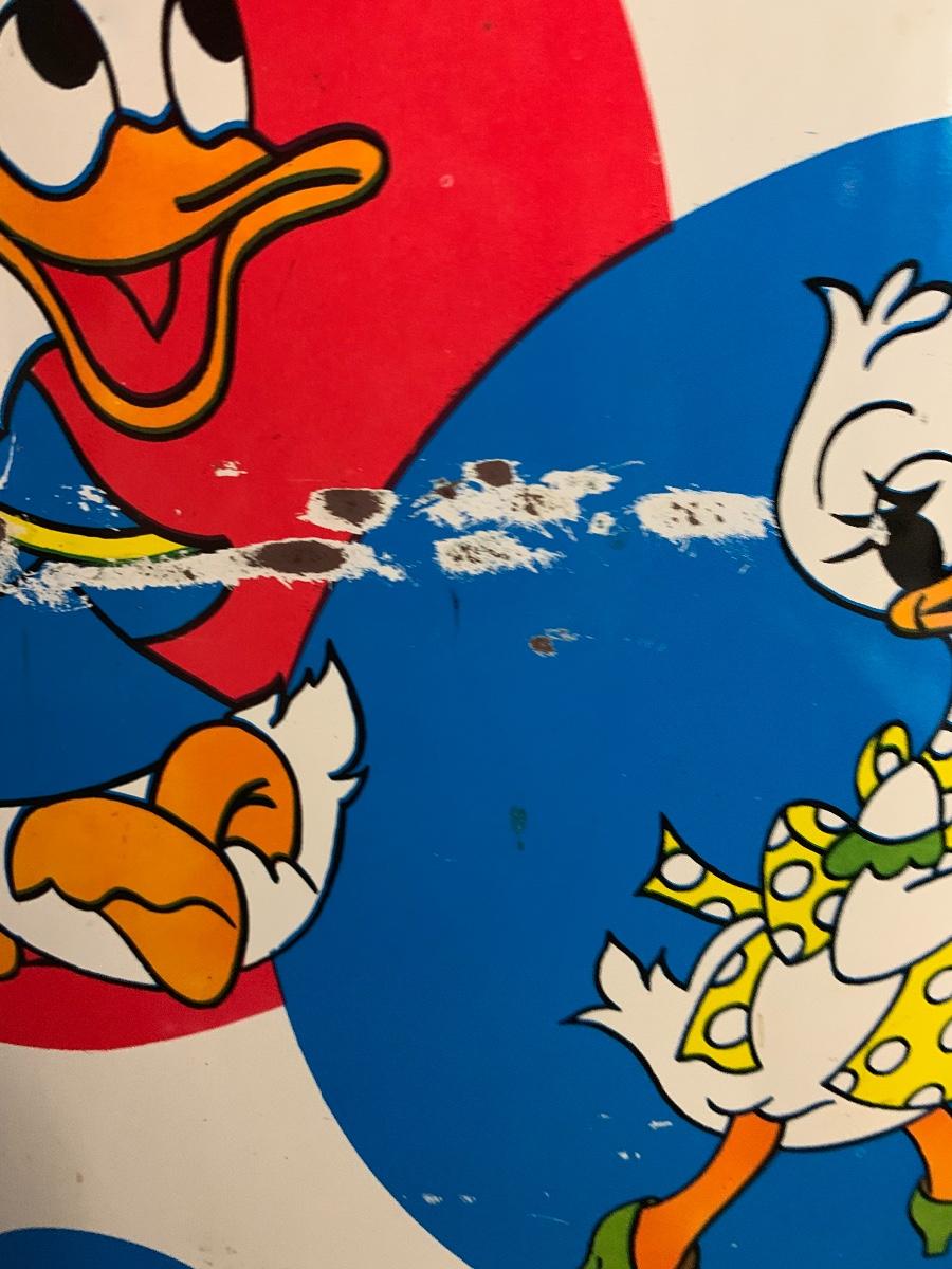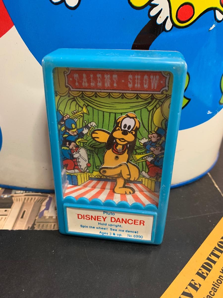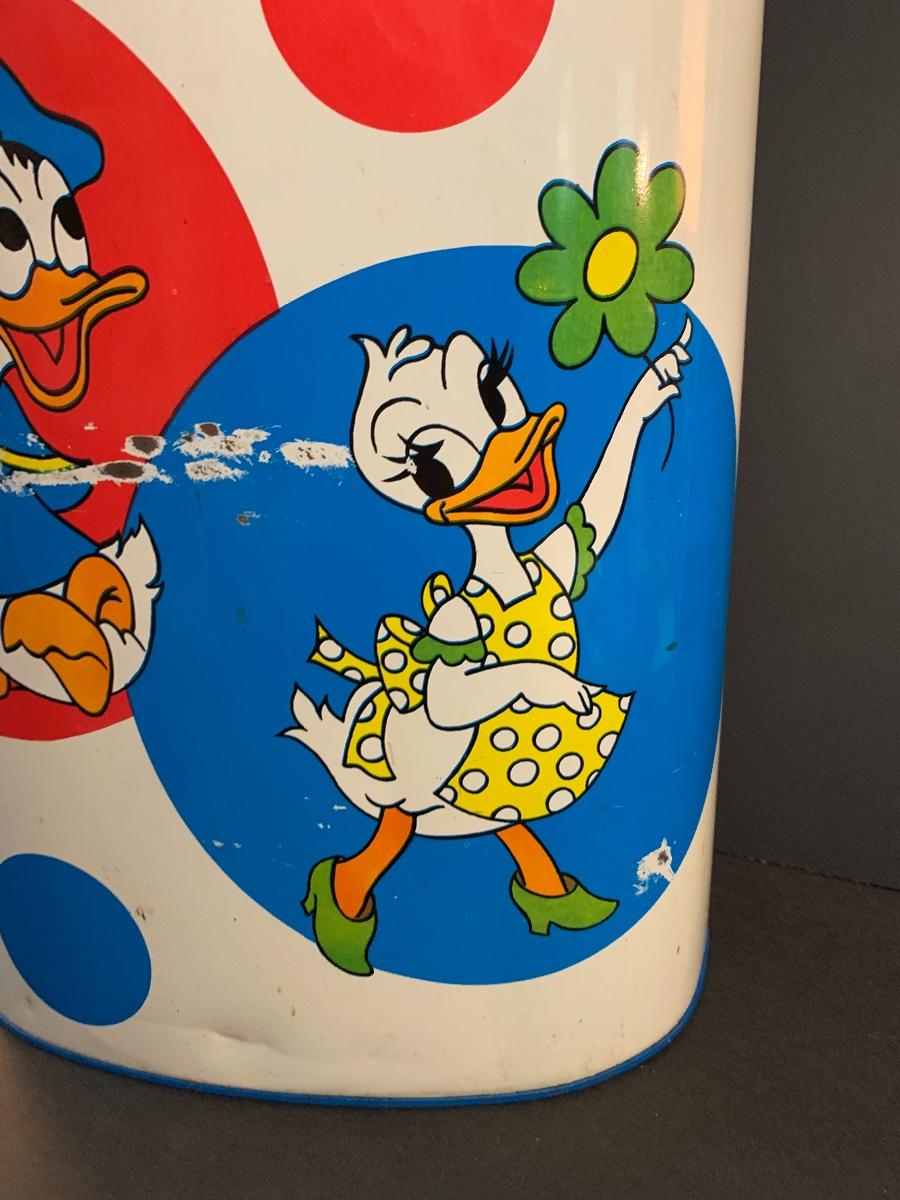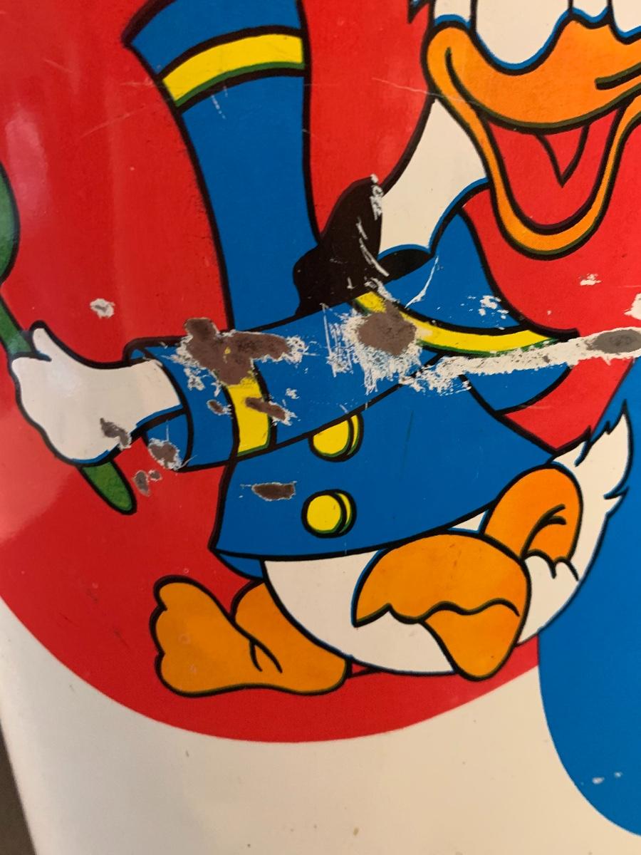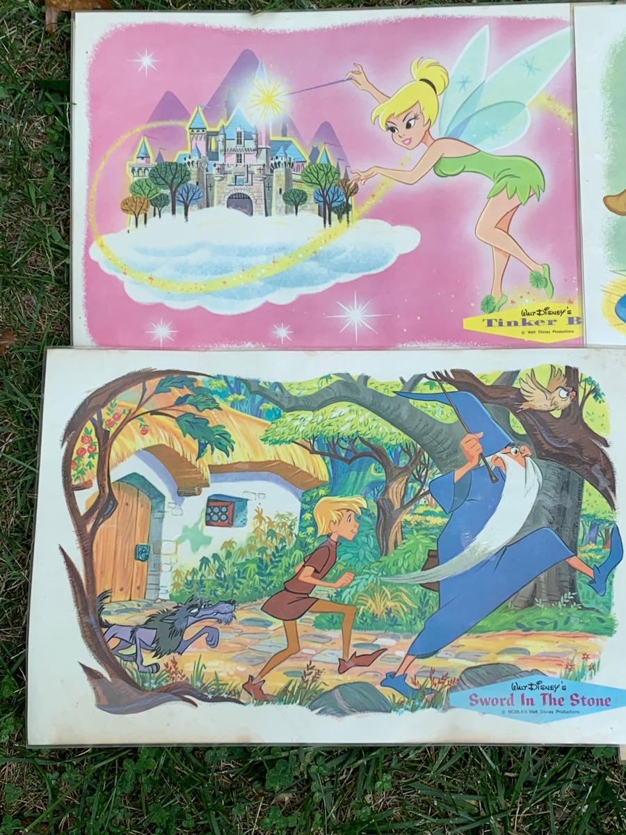 Especially for those who love Disney: A vintage Walt Disney Mickey Mouse, Minnie Mouse, Donald Duck, & Daisy metal waste basket, 1960's vintage placemats, Mickey Mouse bank, Melamine Snack Set - still in original packaging, the story of Disney book, beverage glasses and more. The metal waste basket does have scratches and wear.