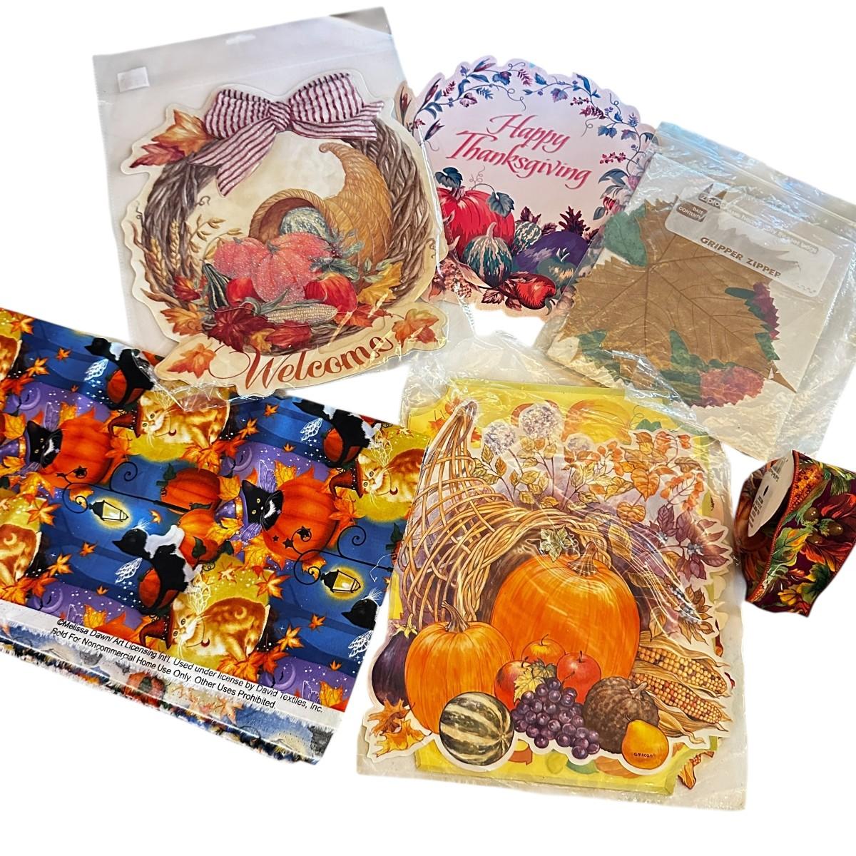 Lot Thanksgiving / Fall Items - Paper Decorations, Fabric, Ribbon