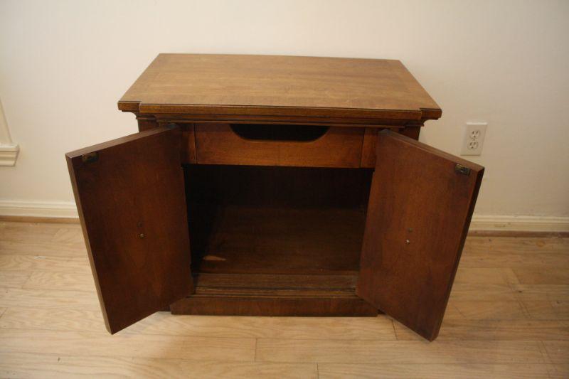 Thomasville Vintage End Table - This vintage end table/bedside table can be used for a variety of functions. Features two opening doors and and inner pull out shelf. Solid wood with some imperfections. Measures 27” (width) 16” (depth) 24” (height).