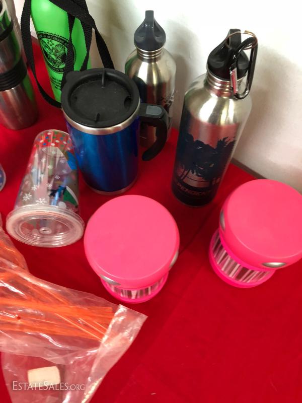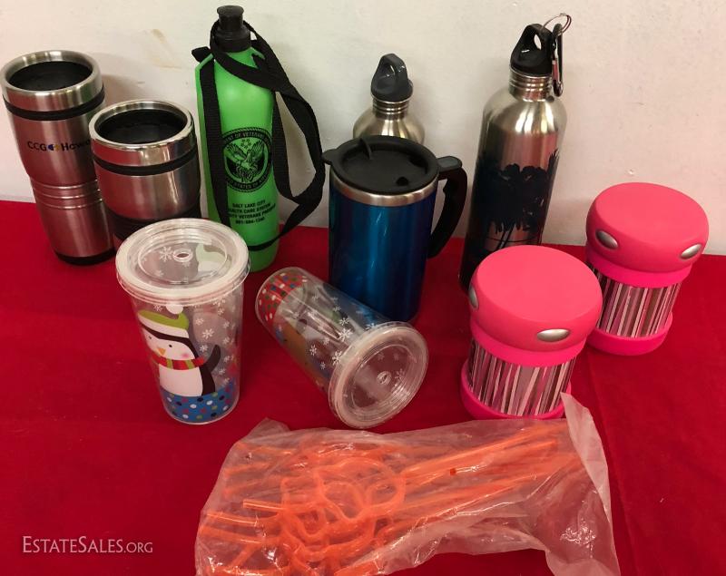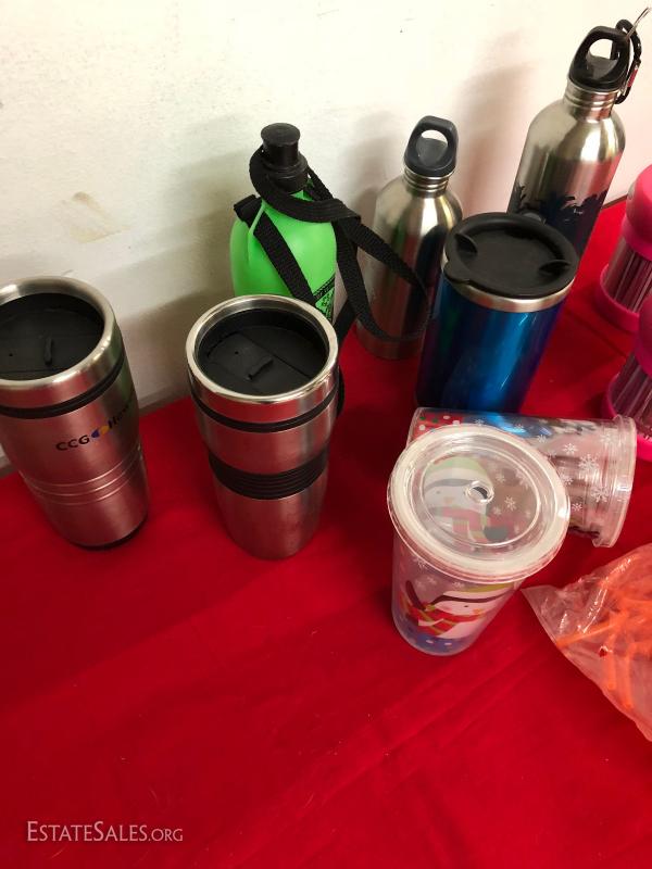 Lot of travel mugs, thermos bottles, plastic lidded cups and straws