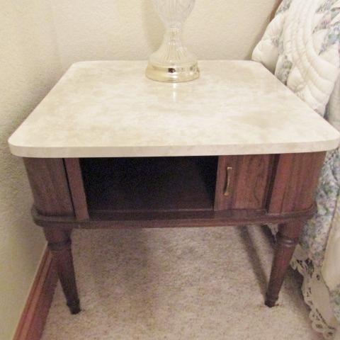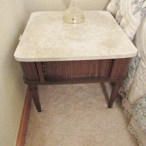 WOODEN BASE NIGHTSTAND WITH SLIDING CABINET DOOR (SIMILAR TO ROLLTOP DESK) WITH FORMICA TOP. MEASURE 23" SQUARE X 20 1/2"