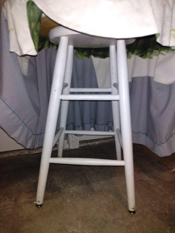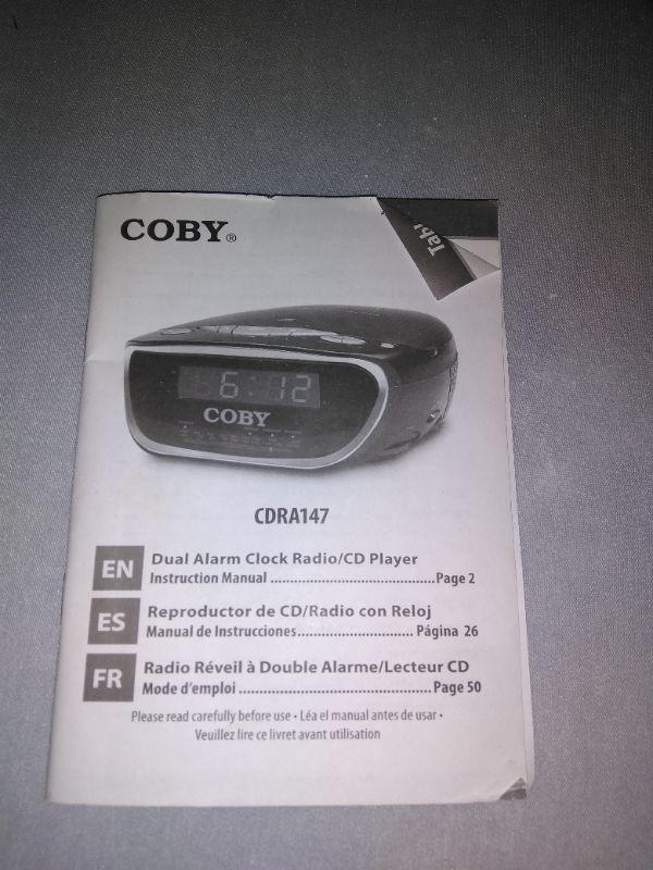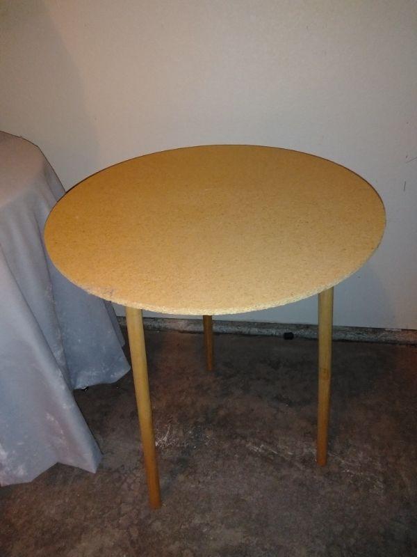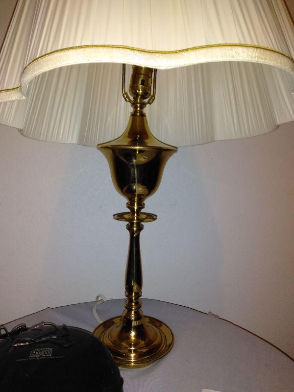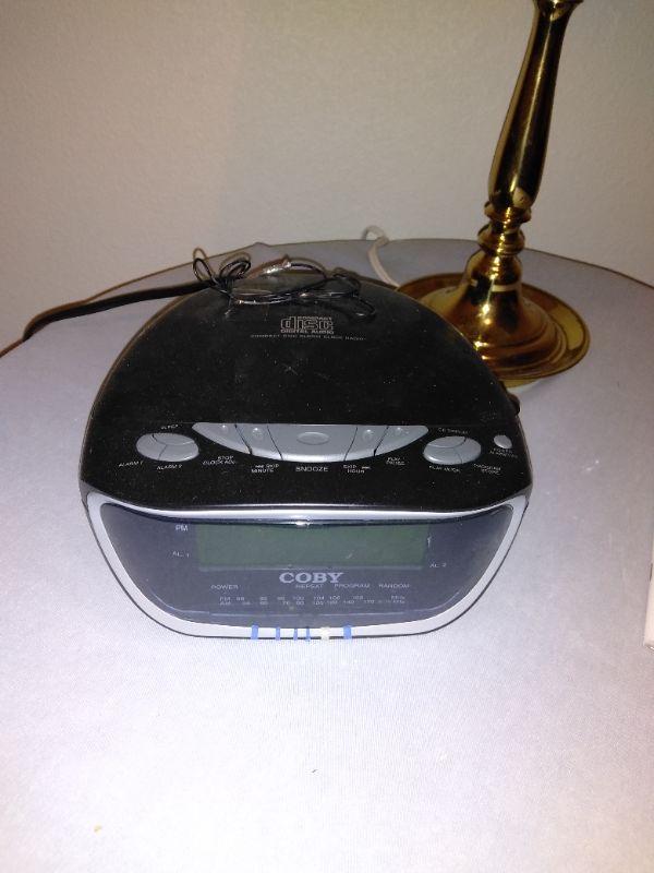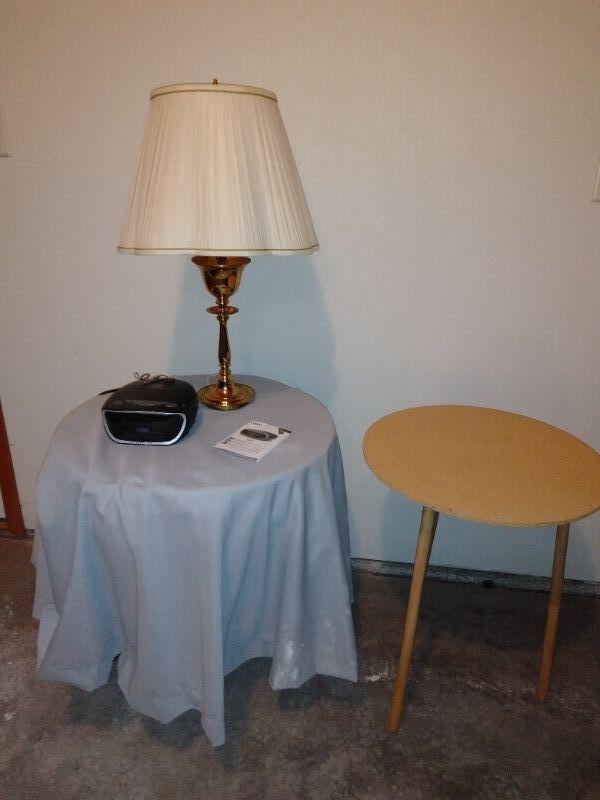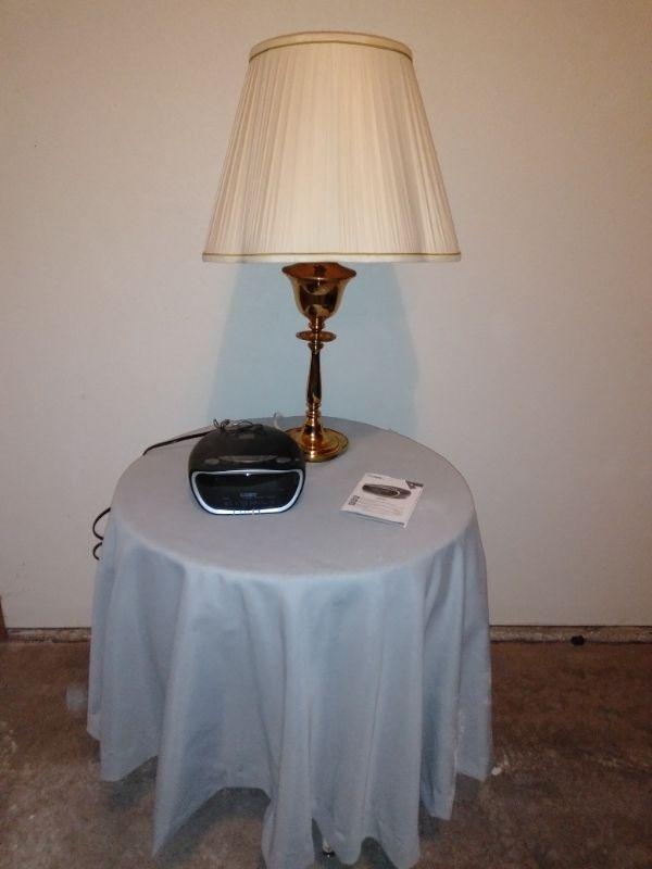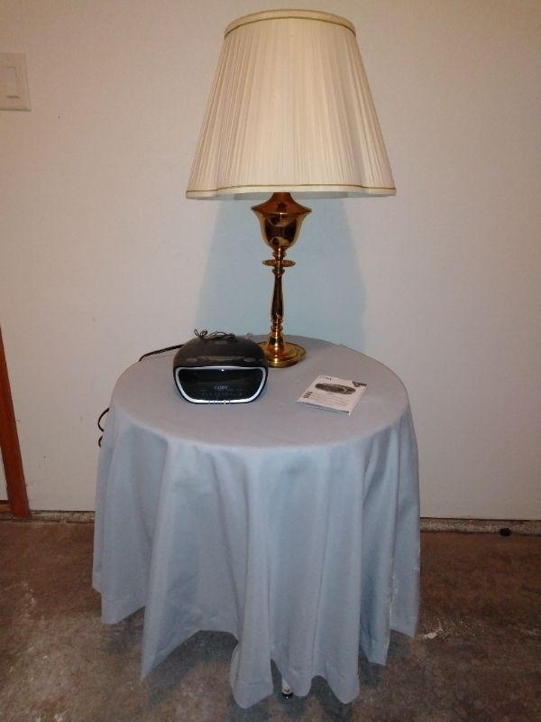 AM/FM/ CD ALARM CLOCK, BRASS LAMP WITH SHADE, A RE-PURPOSED BAR STOOL TURNED COVERED TABLE. AND A PARTICLE BOARD THREE LEGGED TABLE.