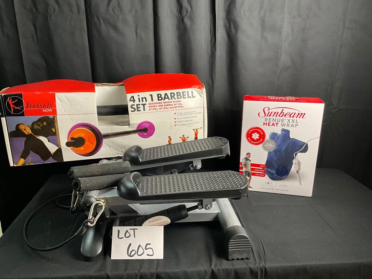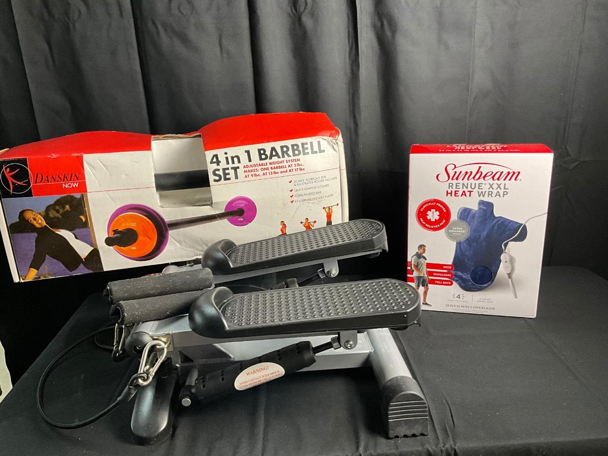 Lot U 605 NIB 4 in 1 Barbell Set / Sunbeam Renuw XXL Heat Wrap / Stair Stepper