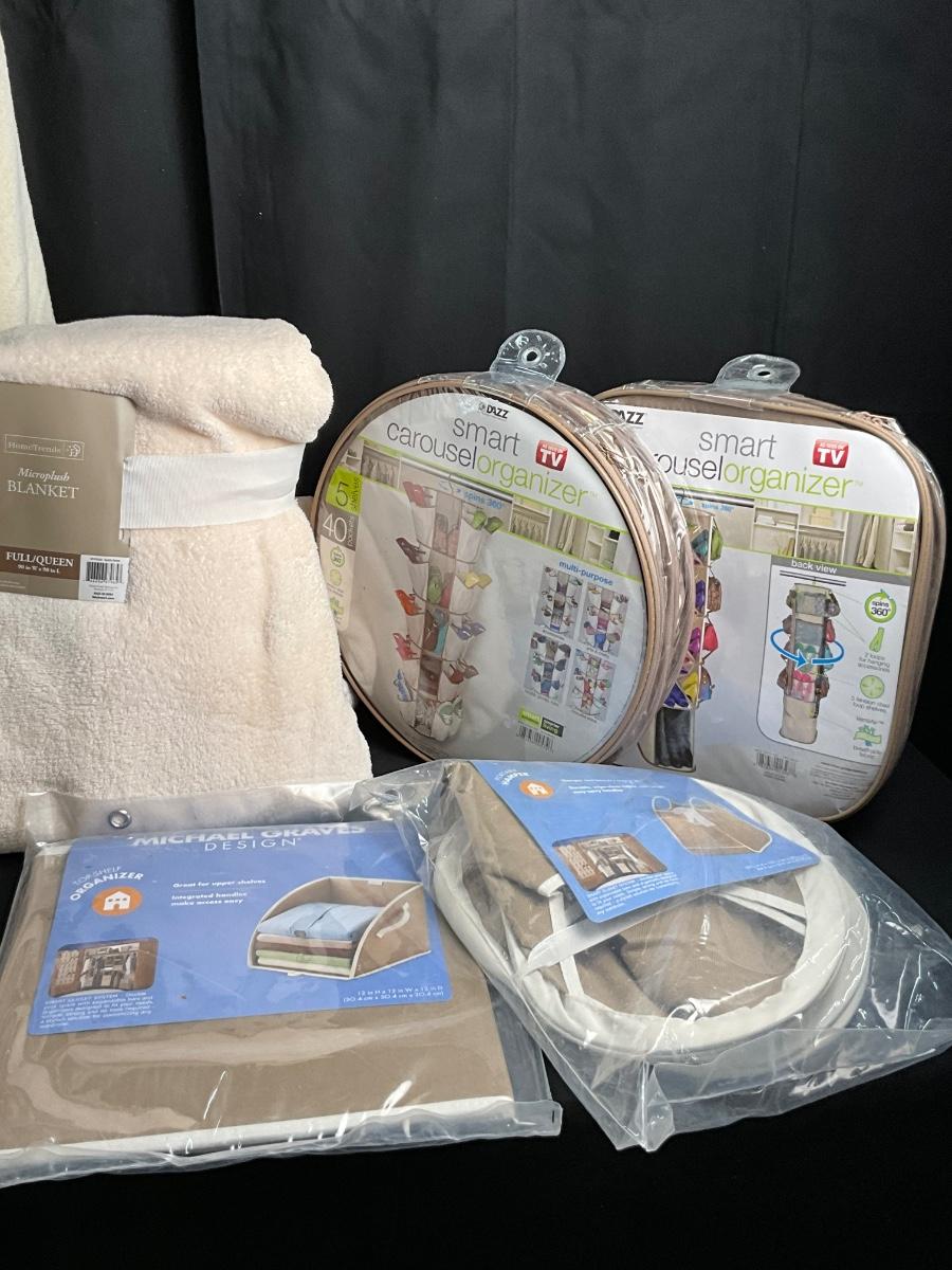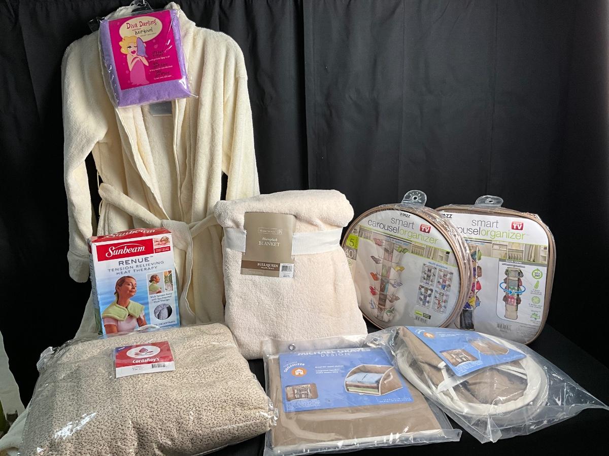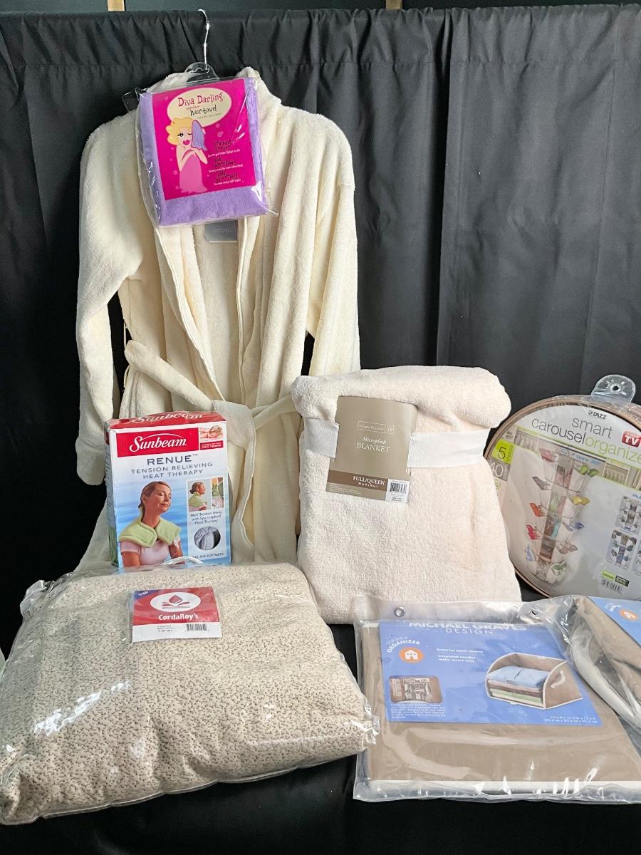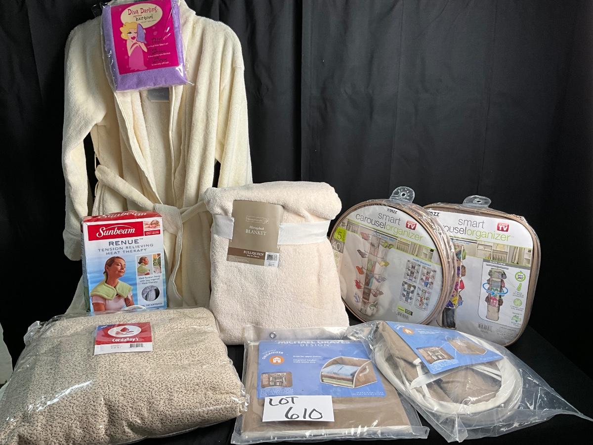 Lot U 610 NWT Plush Bath Robe, NIB Organizers, Microplush Full Size Blanket, NIB Shoulder Heating Pad