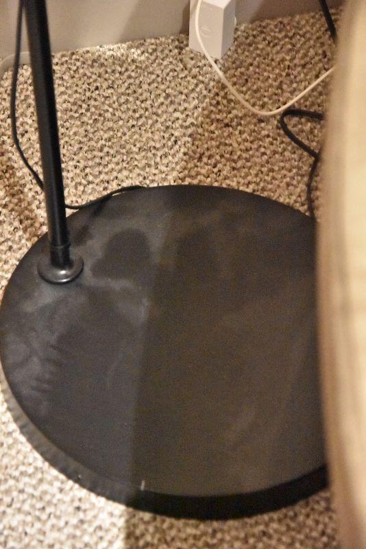 Iron base and a long, curved, black metal pole with a paper lantern. Heavy, bring help to move.
