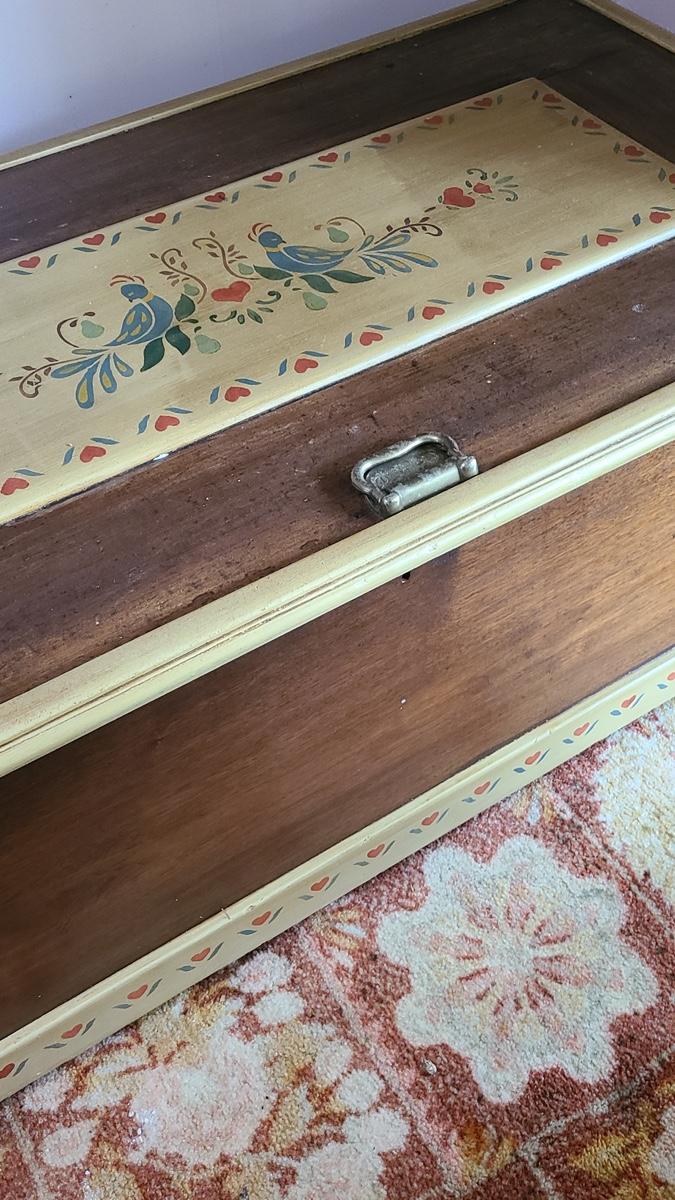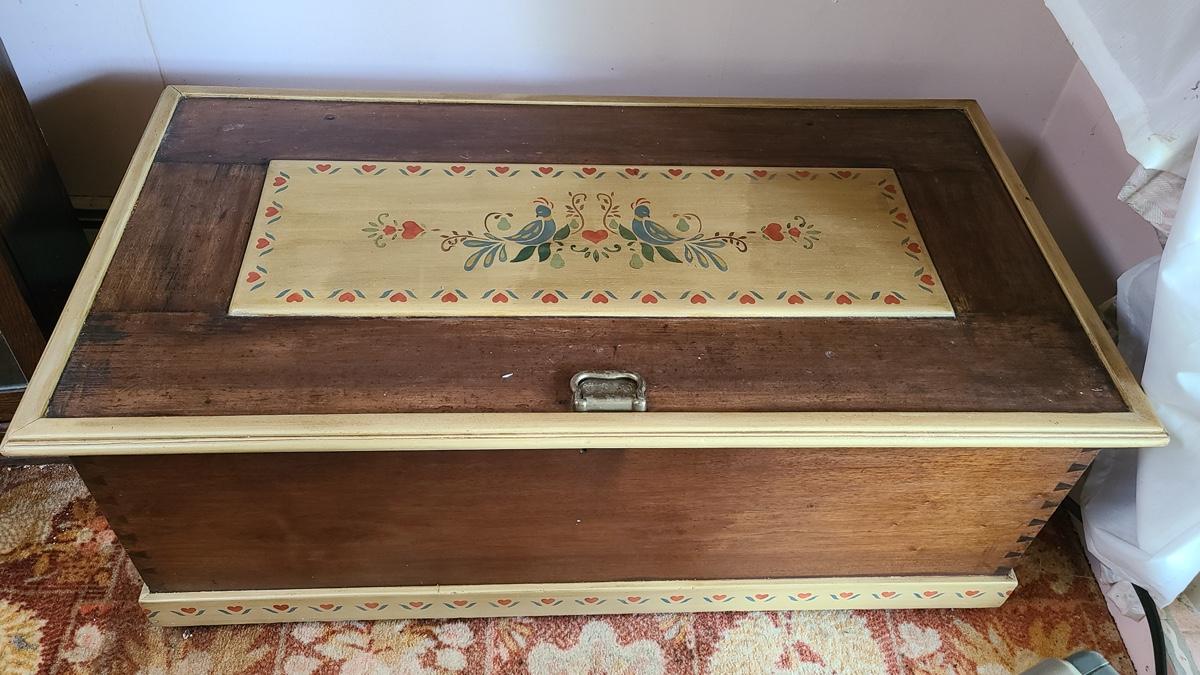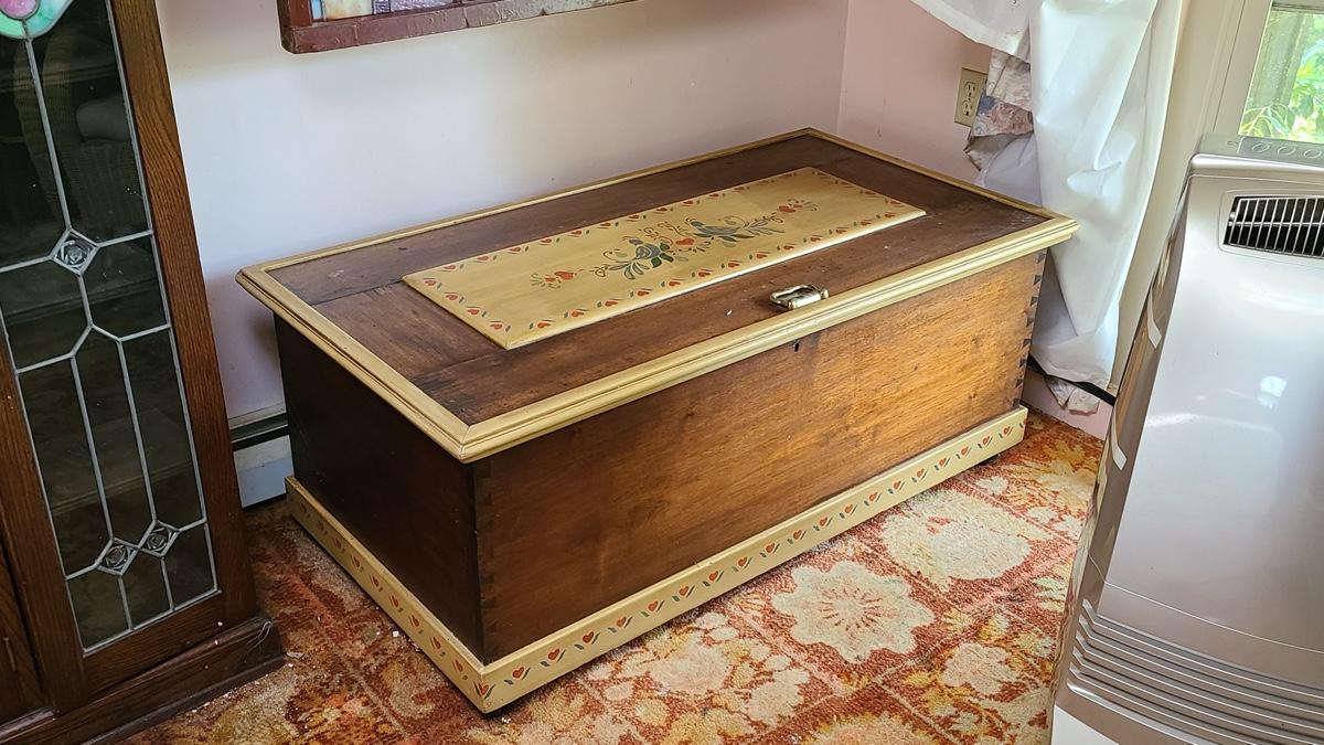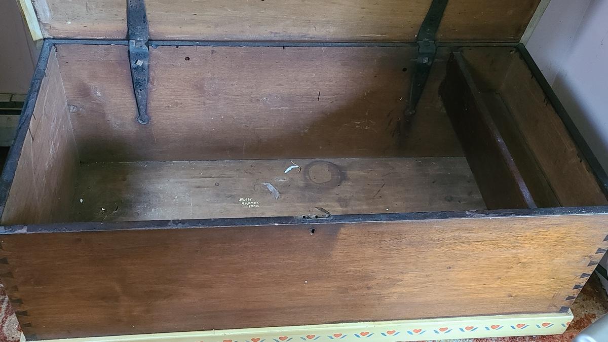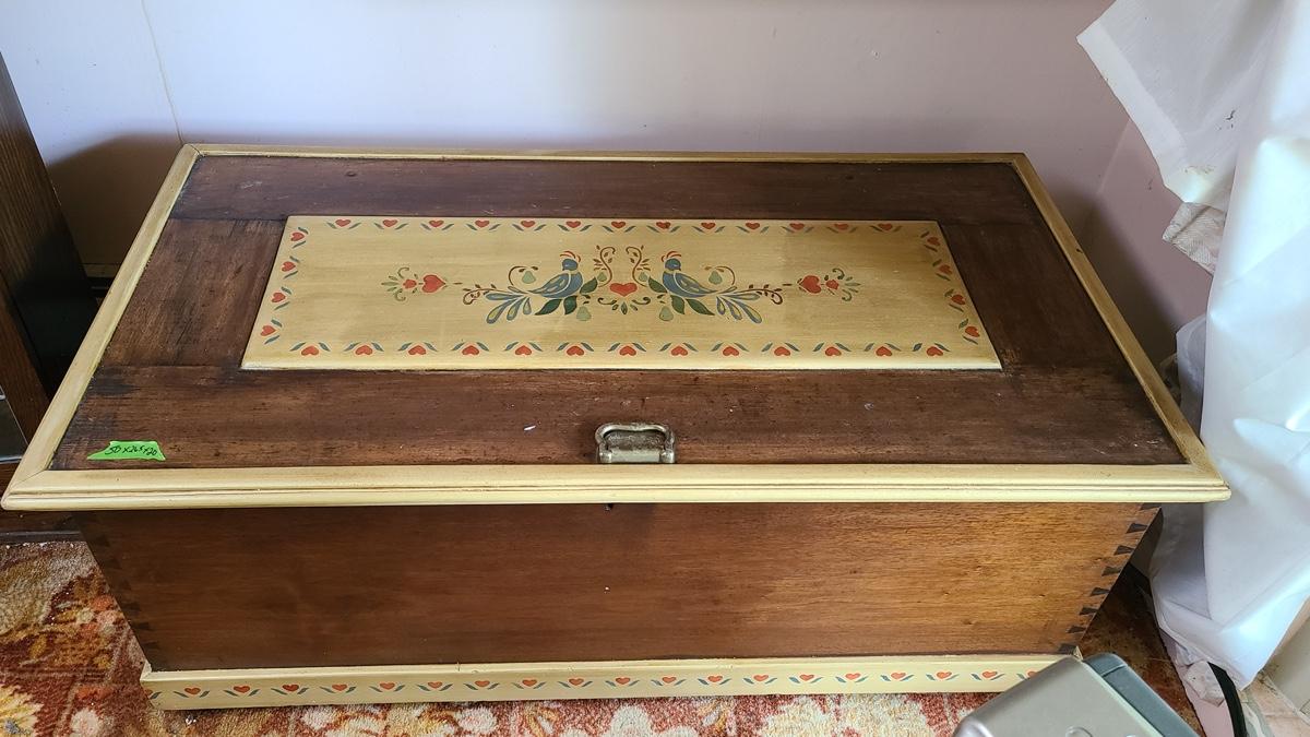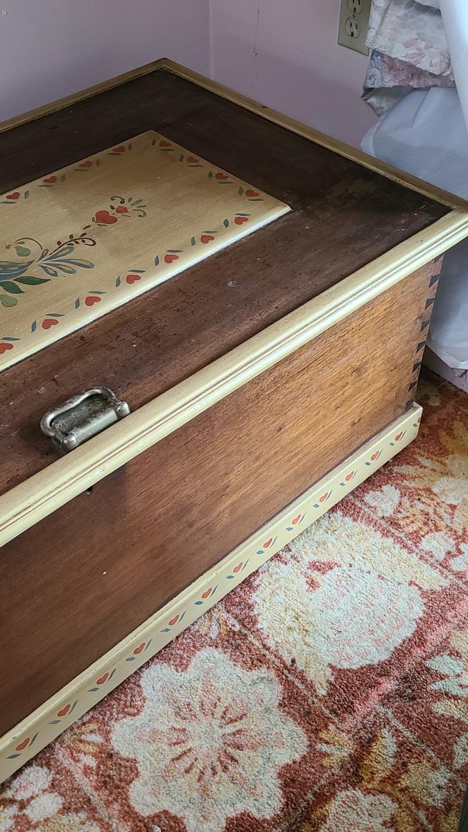 50x26.5x20 inches. This is a gorgeous antique primitive blanket chest with primitive painted decorations. It is solid wood with original inscriptions of history. This is large in size and is sturdy and fully functional. Amazing piece in any room of the home. Looks to be handmade, the dovetail edges show true character as does the wood. Please see pictures as they are the best representation of the item, the condition of the item, and the size of the item.