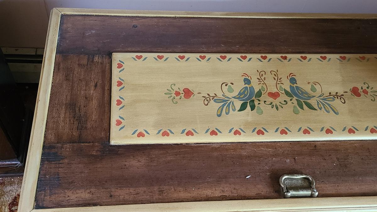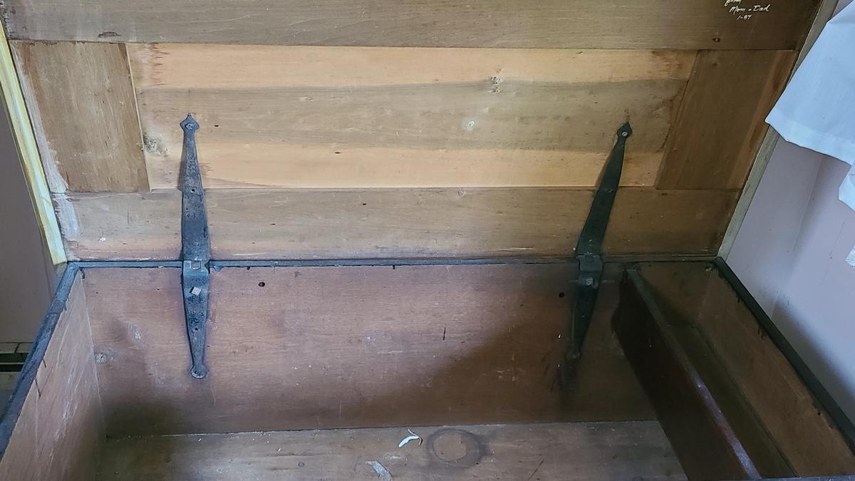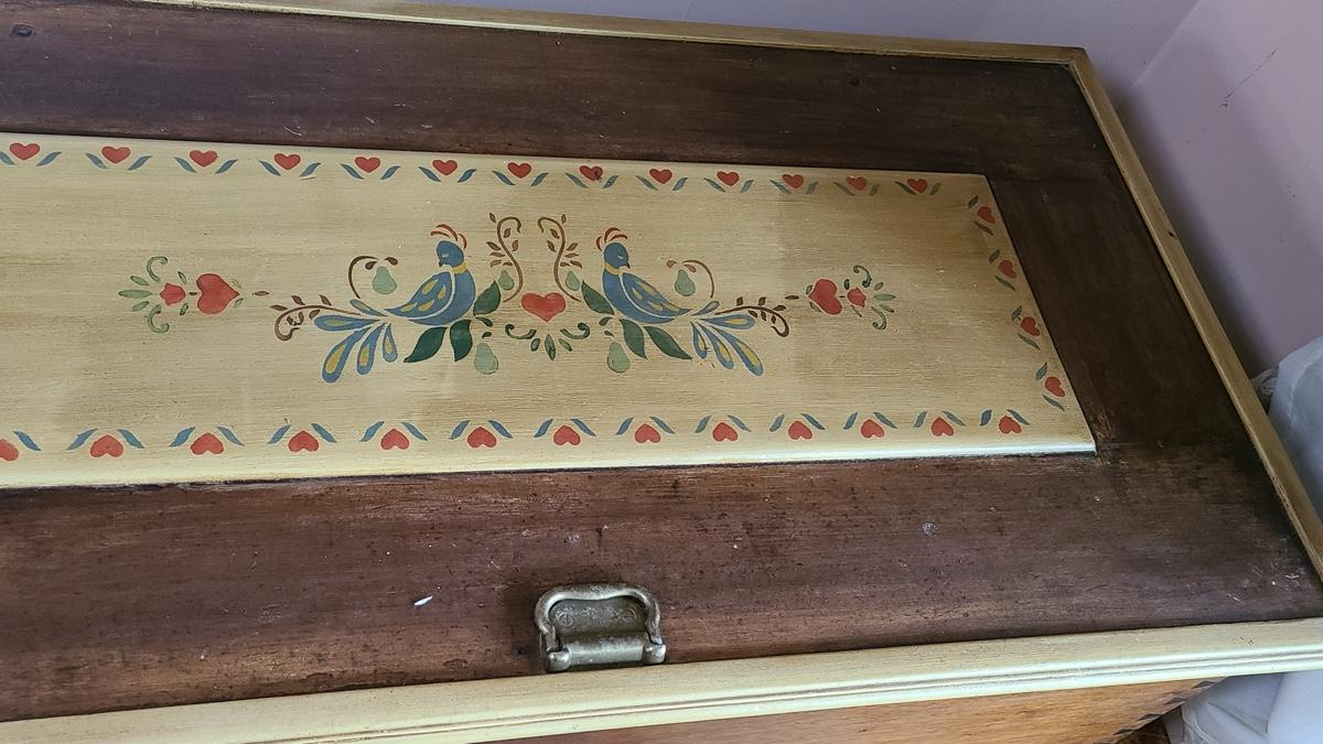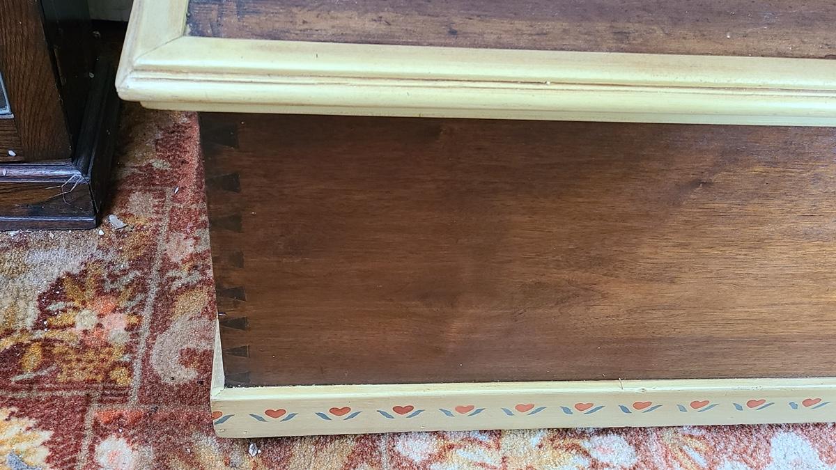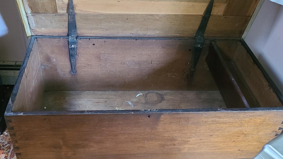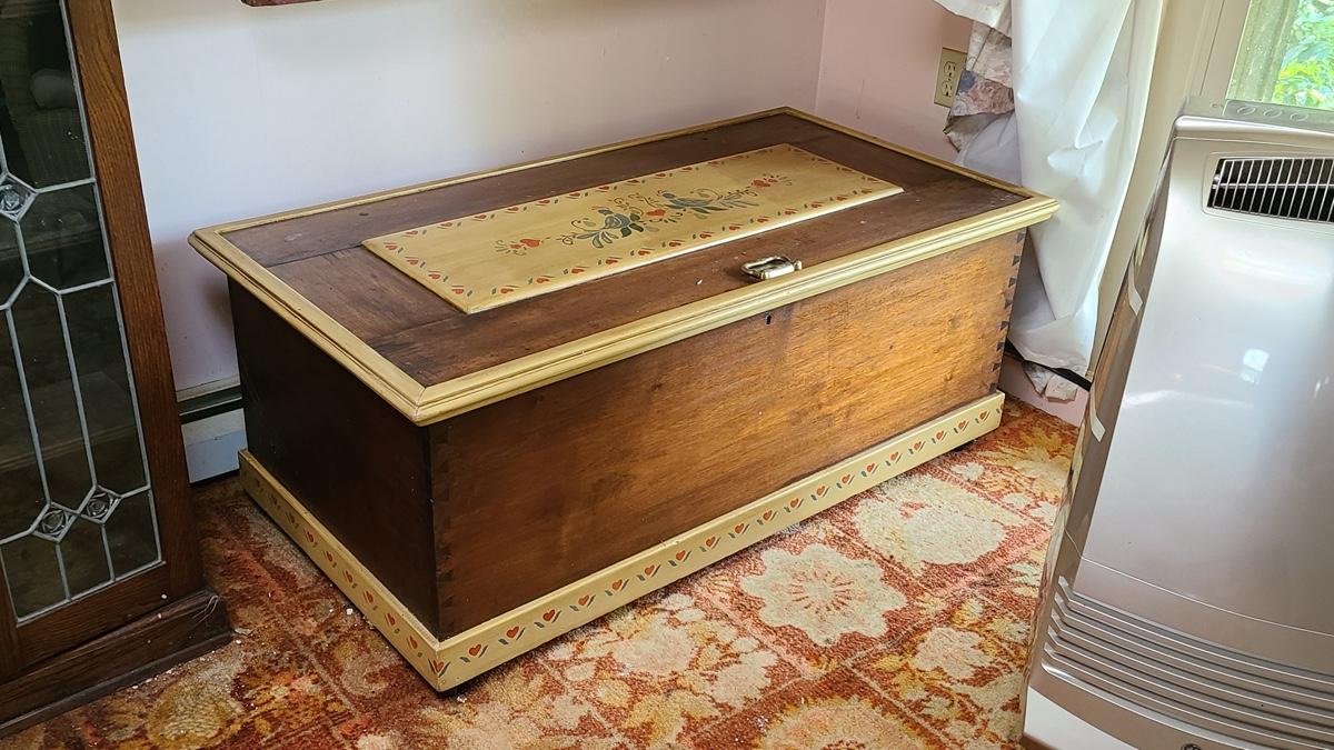 50x26.5x20 inches. This is a gorgeous antique primitive blanket chest with primitive painted decorations. It is solid wood with original inscriptions of history. This is large in size and is sturdy and fully functional. Amazing piece in any room of the home. Looks to be handmade, the dovetail edges show true character as does the wood. Please see pictures as they are the best representation of the item, the condition of the item, and the size of the item.