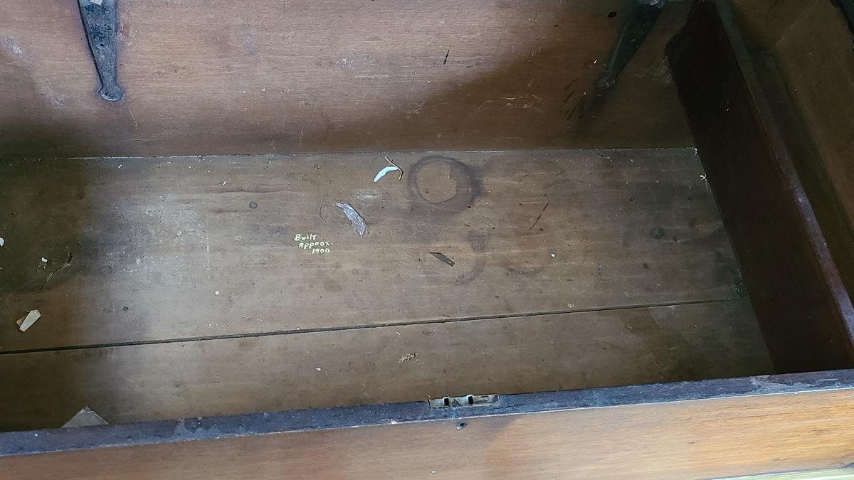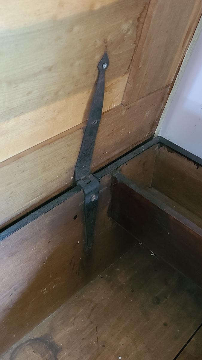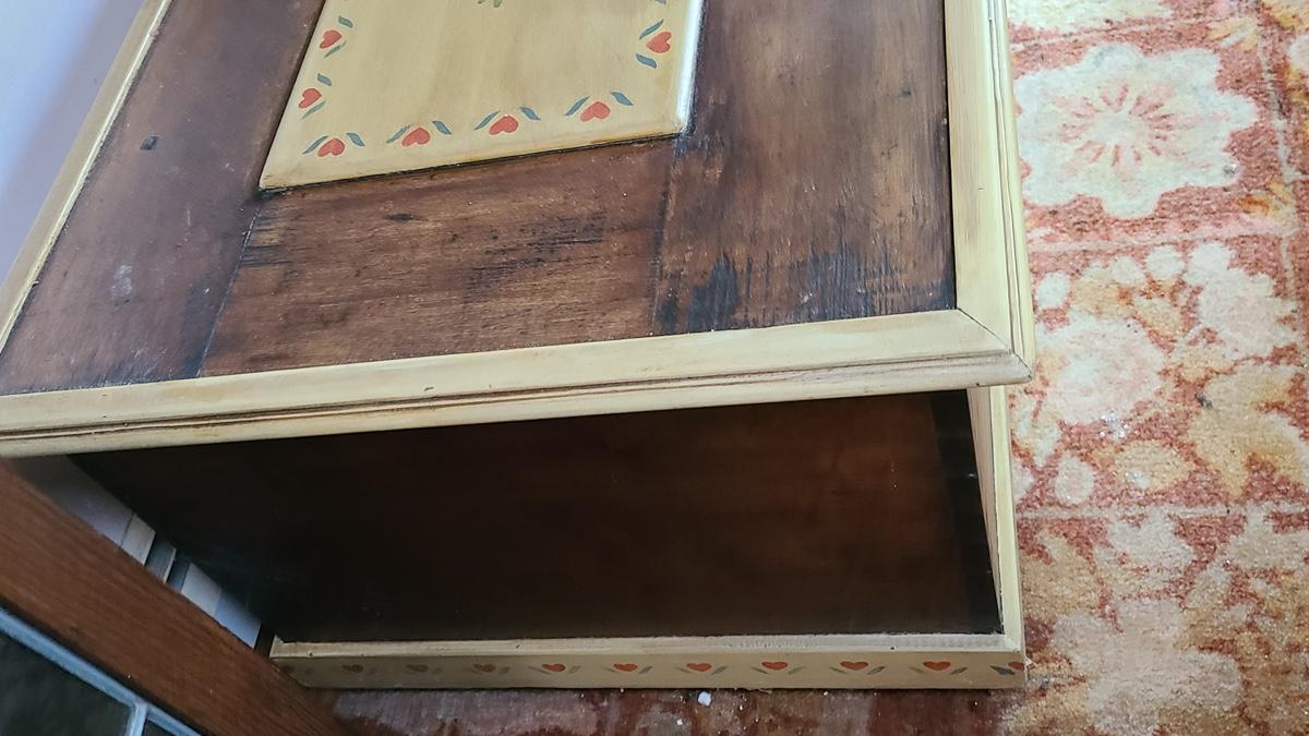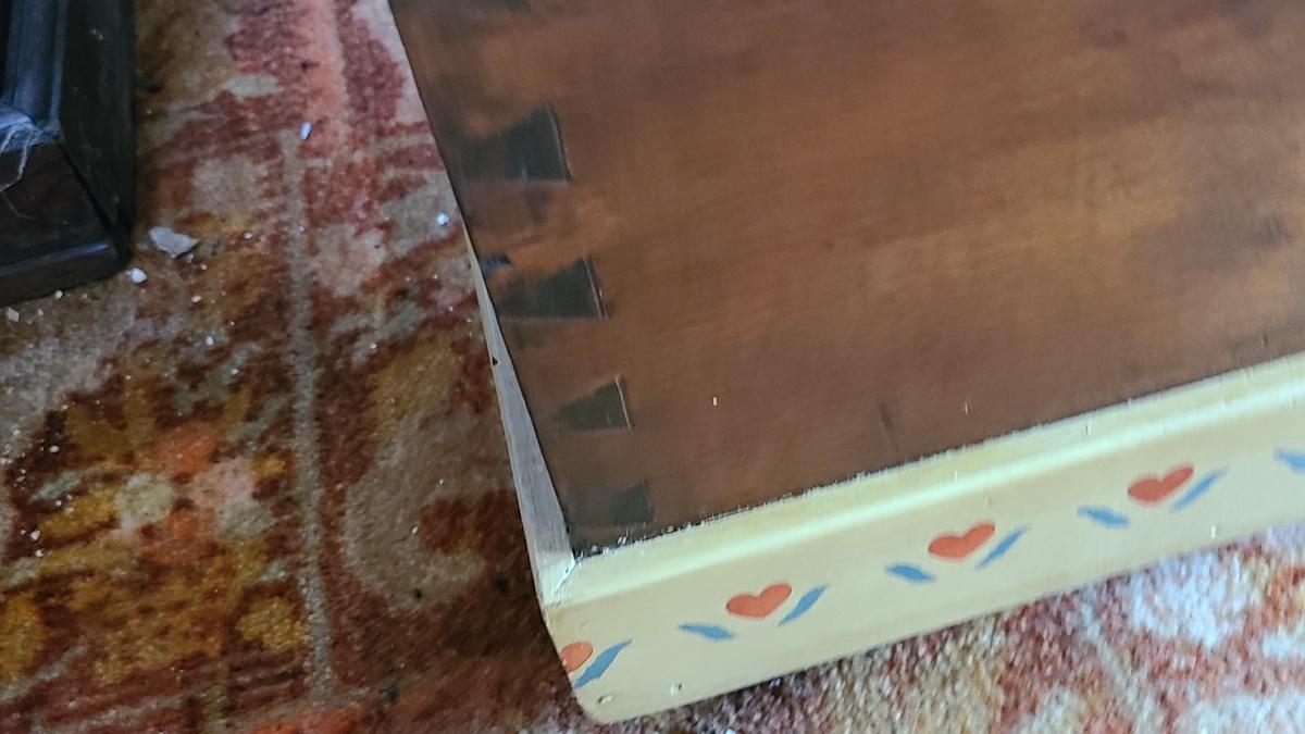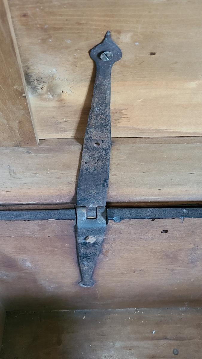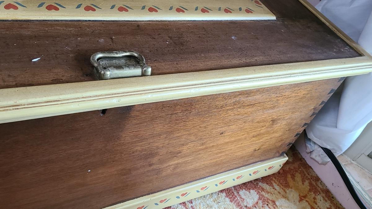 50x26.5x20 inches. This is a gorgeous antique primitive blanket chest with primitive painted decorations. It is solid wood with original inscriptions of history. This is large in size and is sturdy and fully functional. Amazing piece in any room of the home. Looks to be handmade, the dovetail edges show true character as does the wood. Please see pictures as they are the best representation of the item, the condition of the item, and the size of the item.