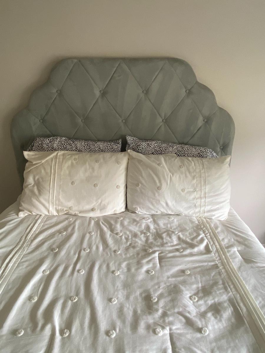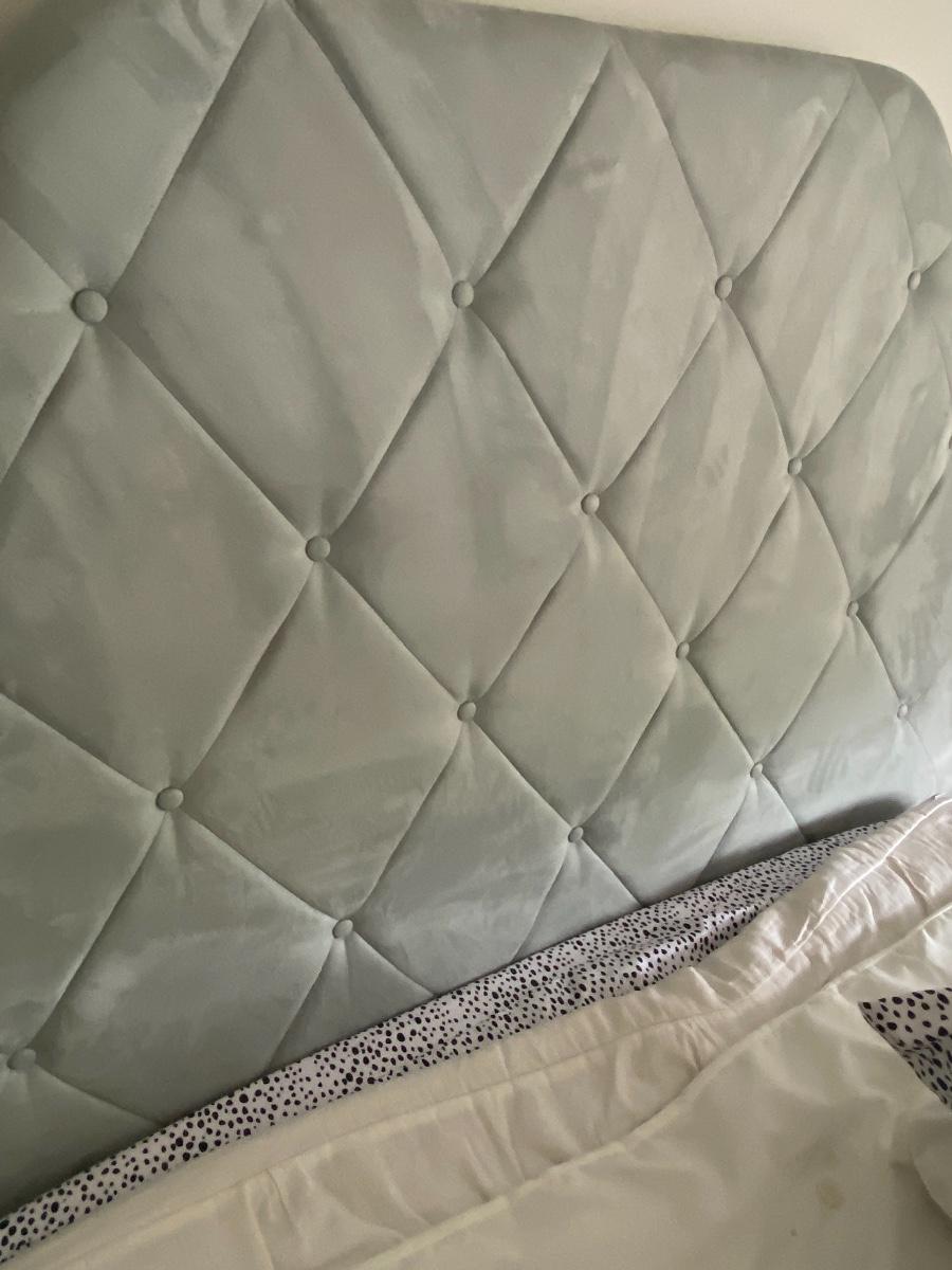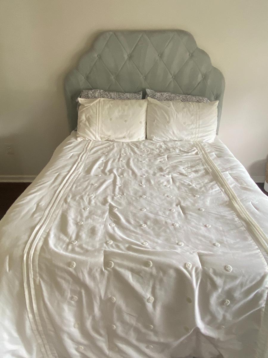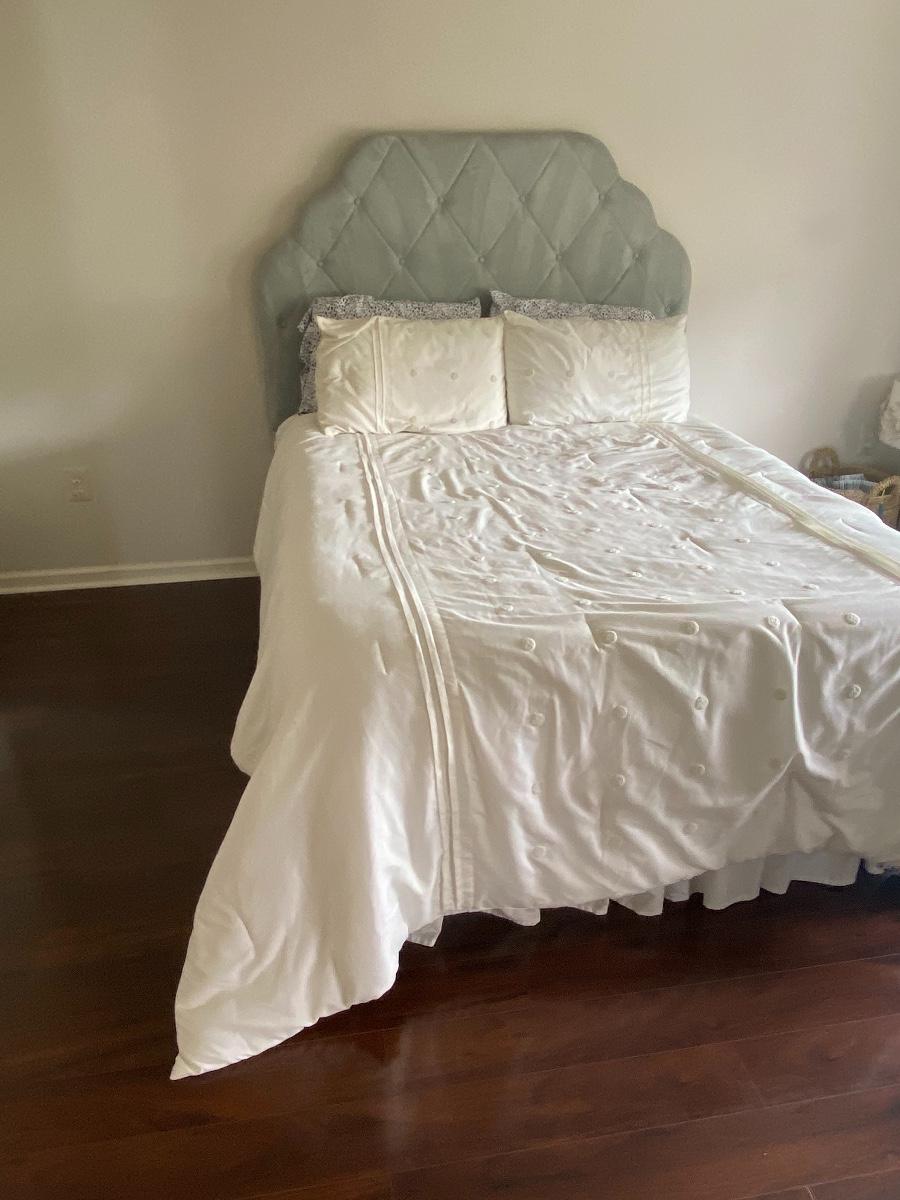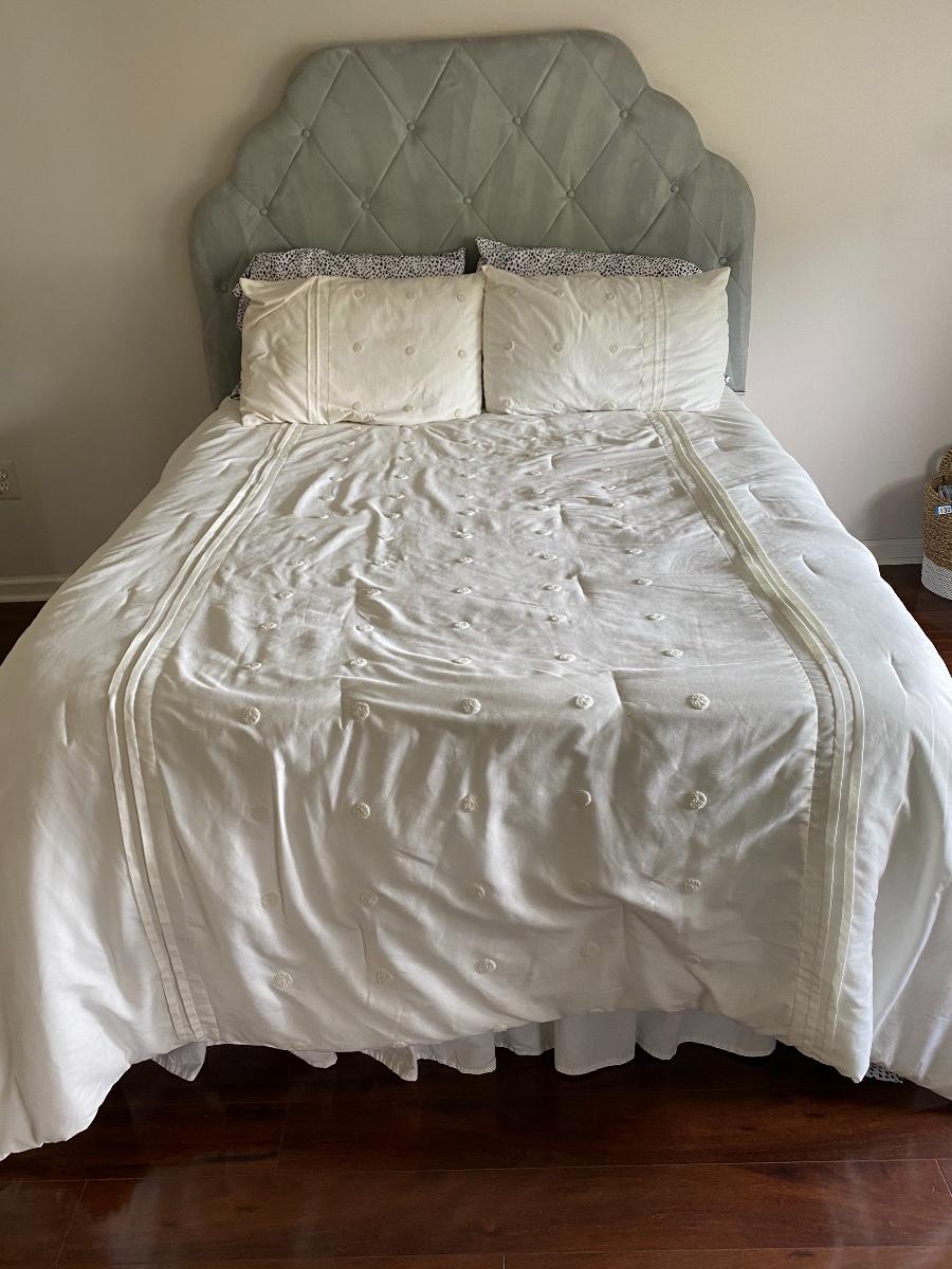 Neutral green twin headboard. Neutral cream colored twin bedding. Please see all pictures for content of the lot, condition of the lot, and measurements if taken. Pictures are the best representation of the items listed and items are untested unless indicated in description. Thank you for looking and have fun bidding!
