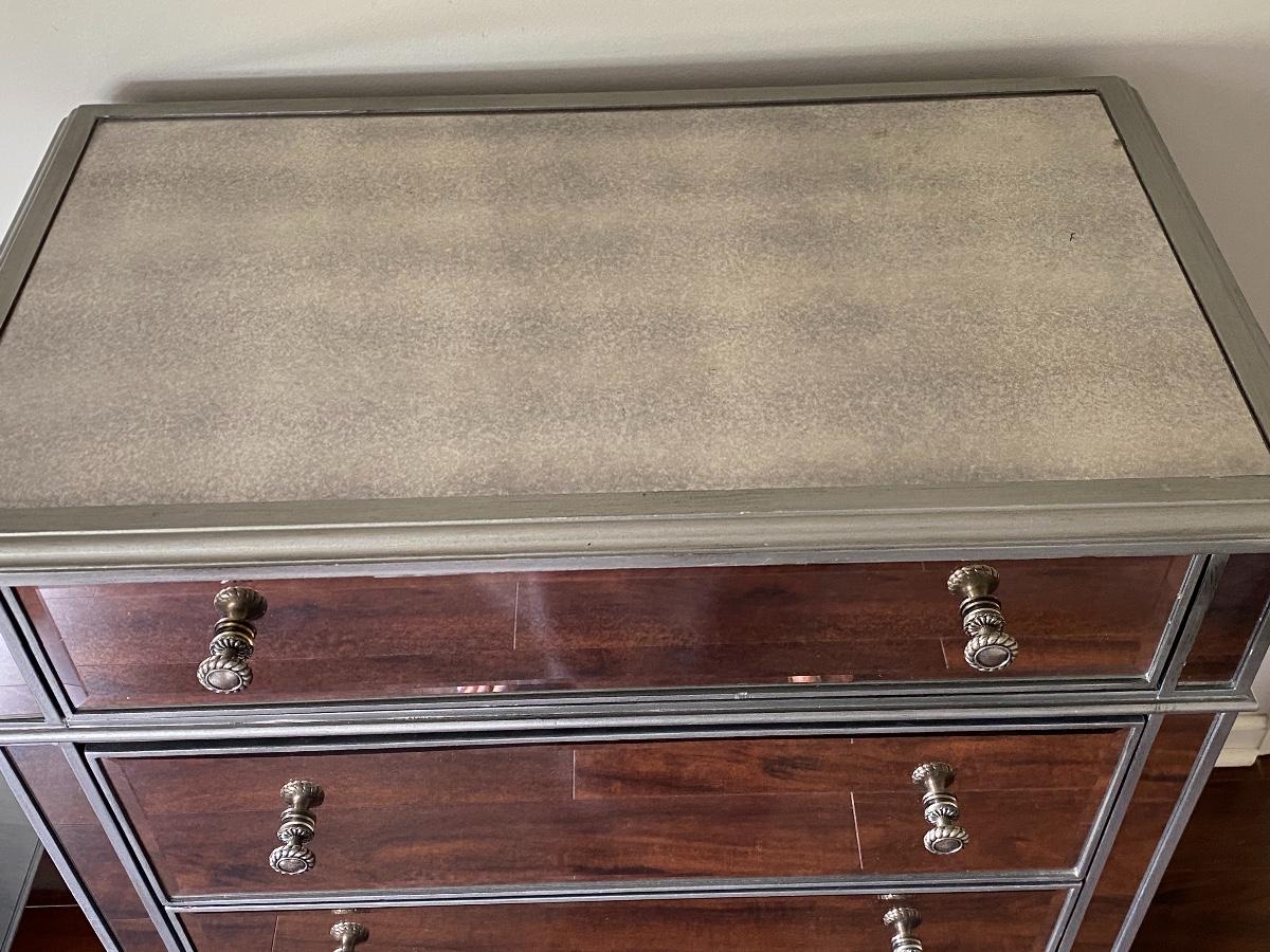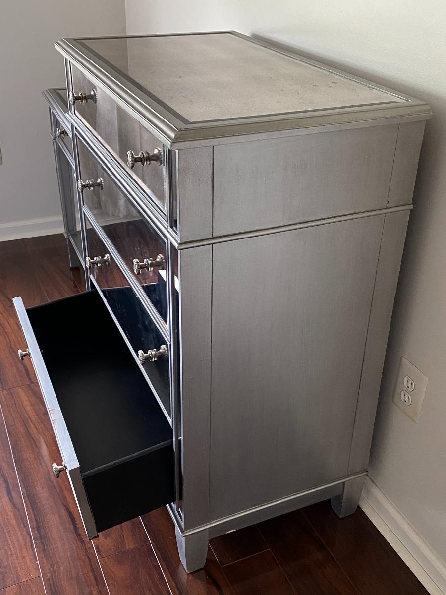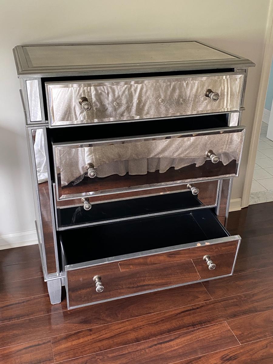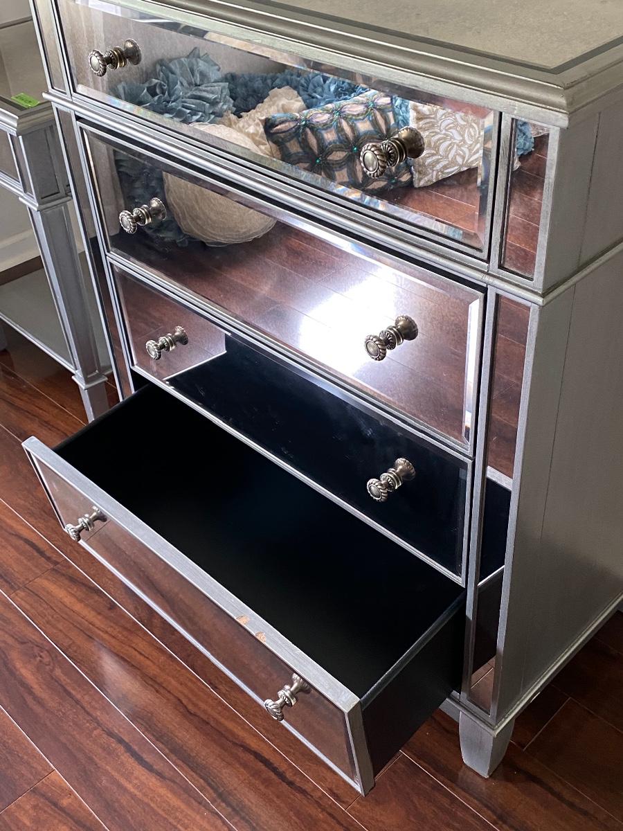 Modern mirrored dresser 35x19x40. Please see all pictures for content of the lot, condition of the lot, and measurements if taken. Pictures are the best representation of the items listed and items are untested unless indicated in description. Thank you for looking and have fun bidding!