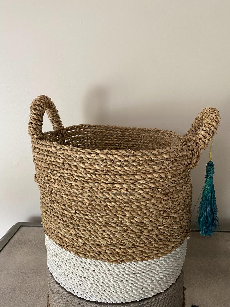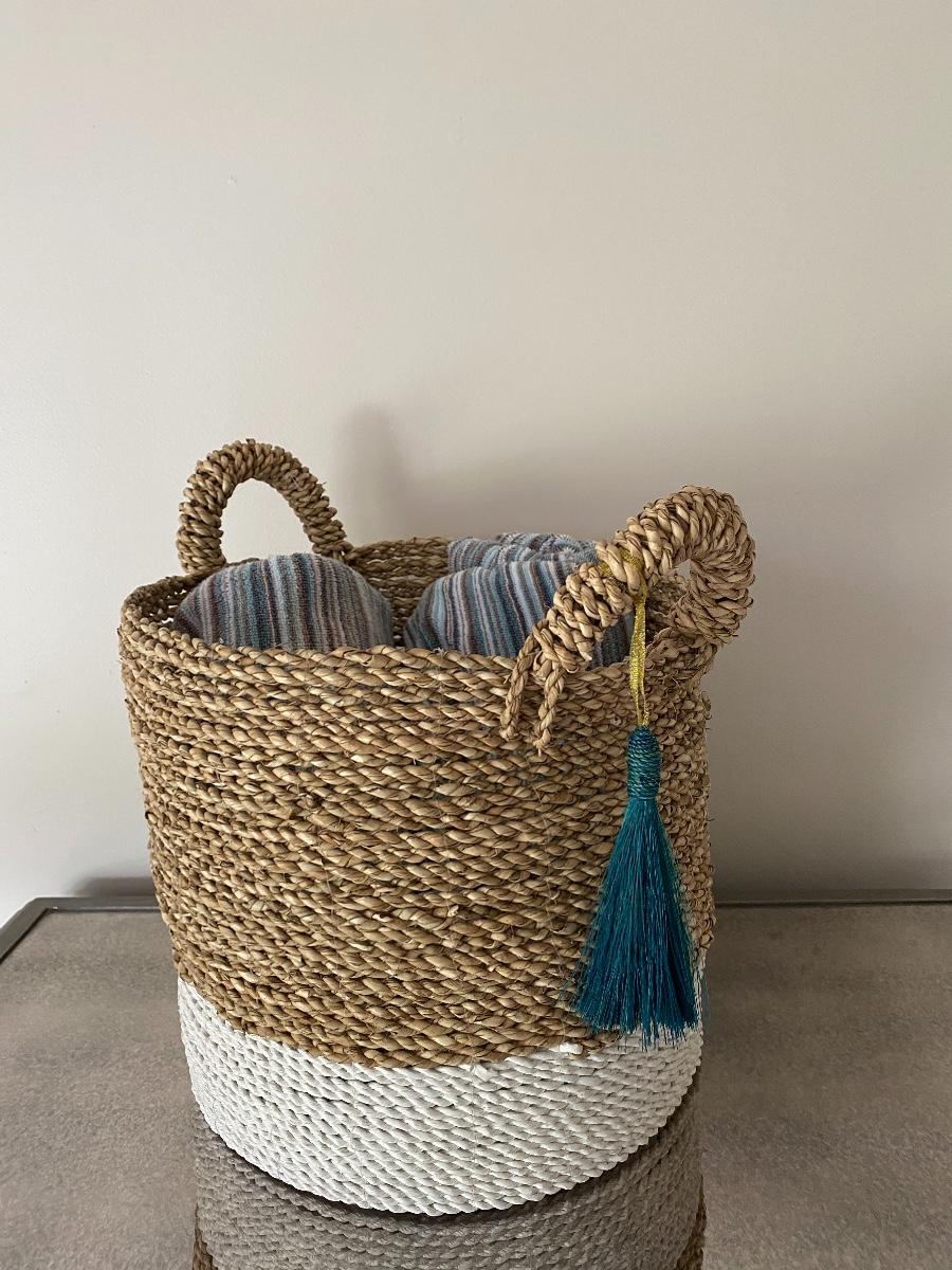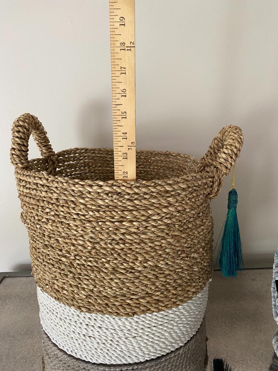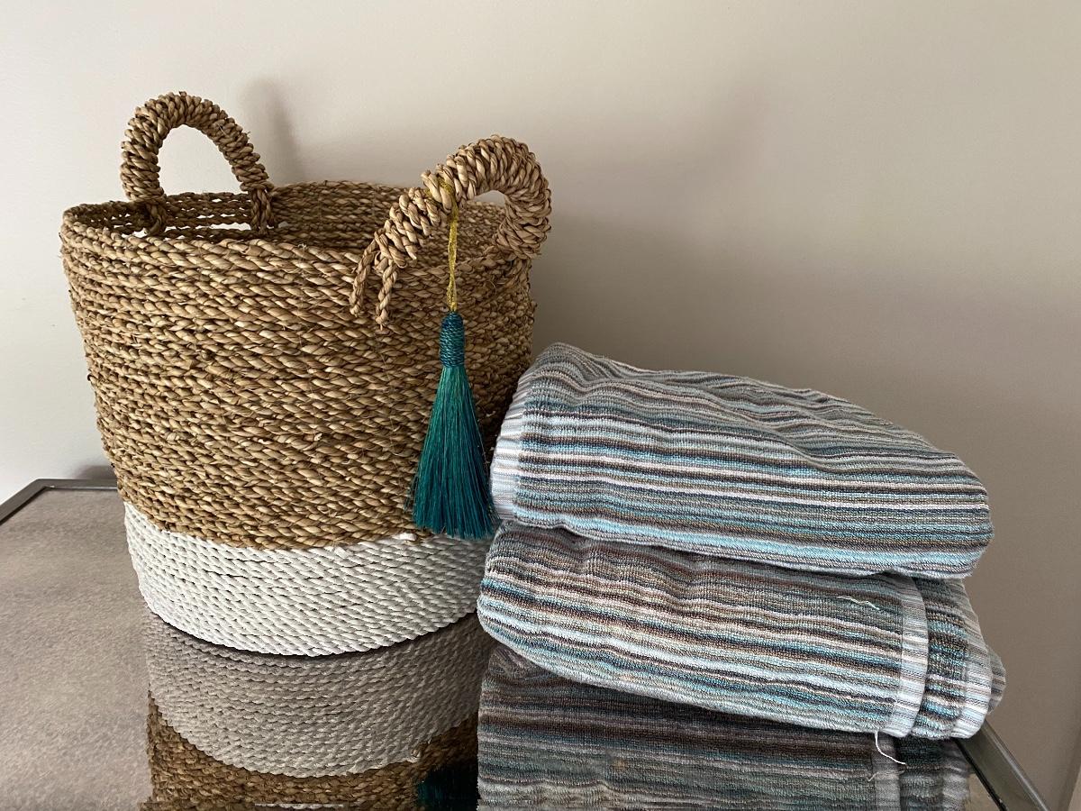 Basket w hanging tassel and two towels. Please see all pictures for content of the lot, condition of the lot, and measurements if taken. Pictures are the best representation of the items listed and items are untested unless indicated in description. Thank you for looking and have fun bidding!
