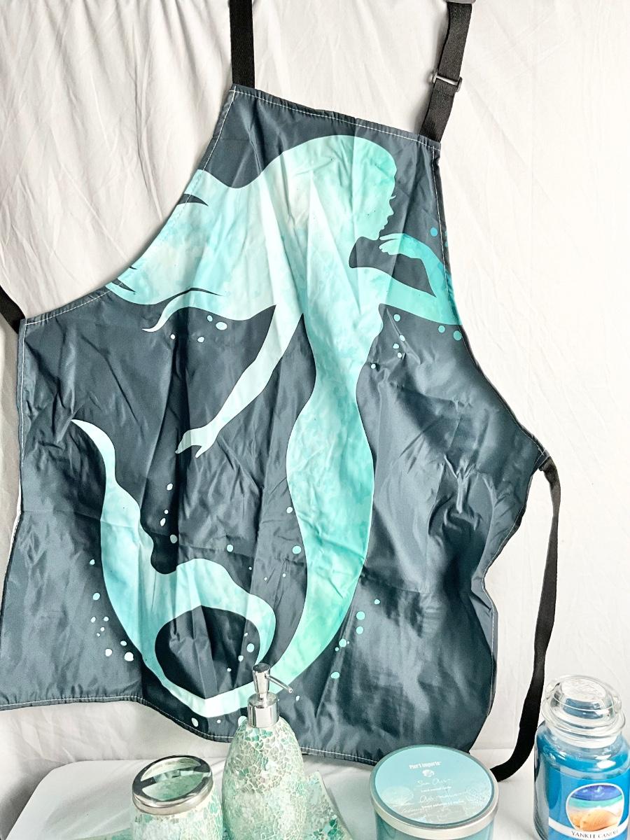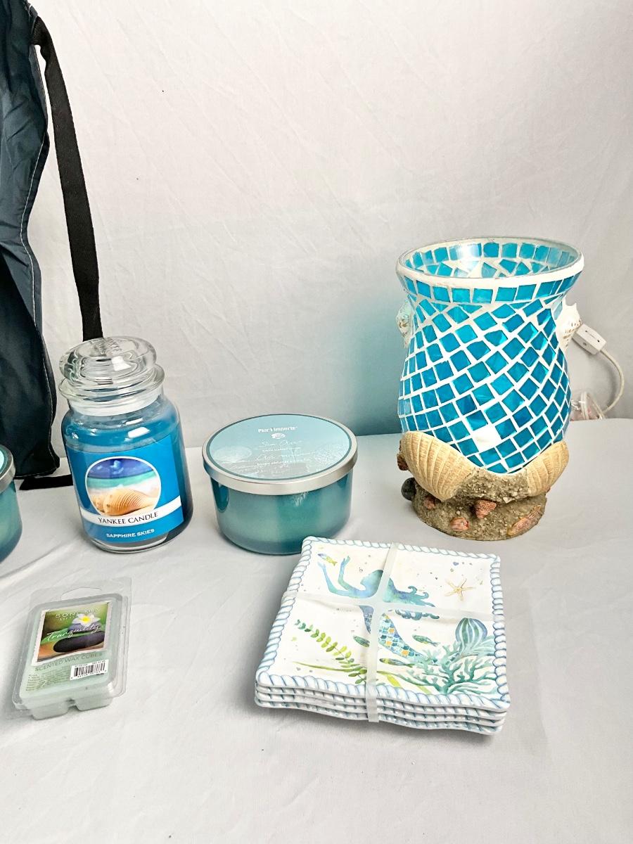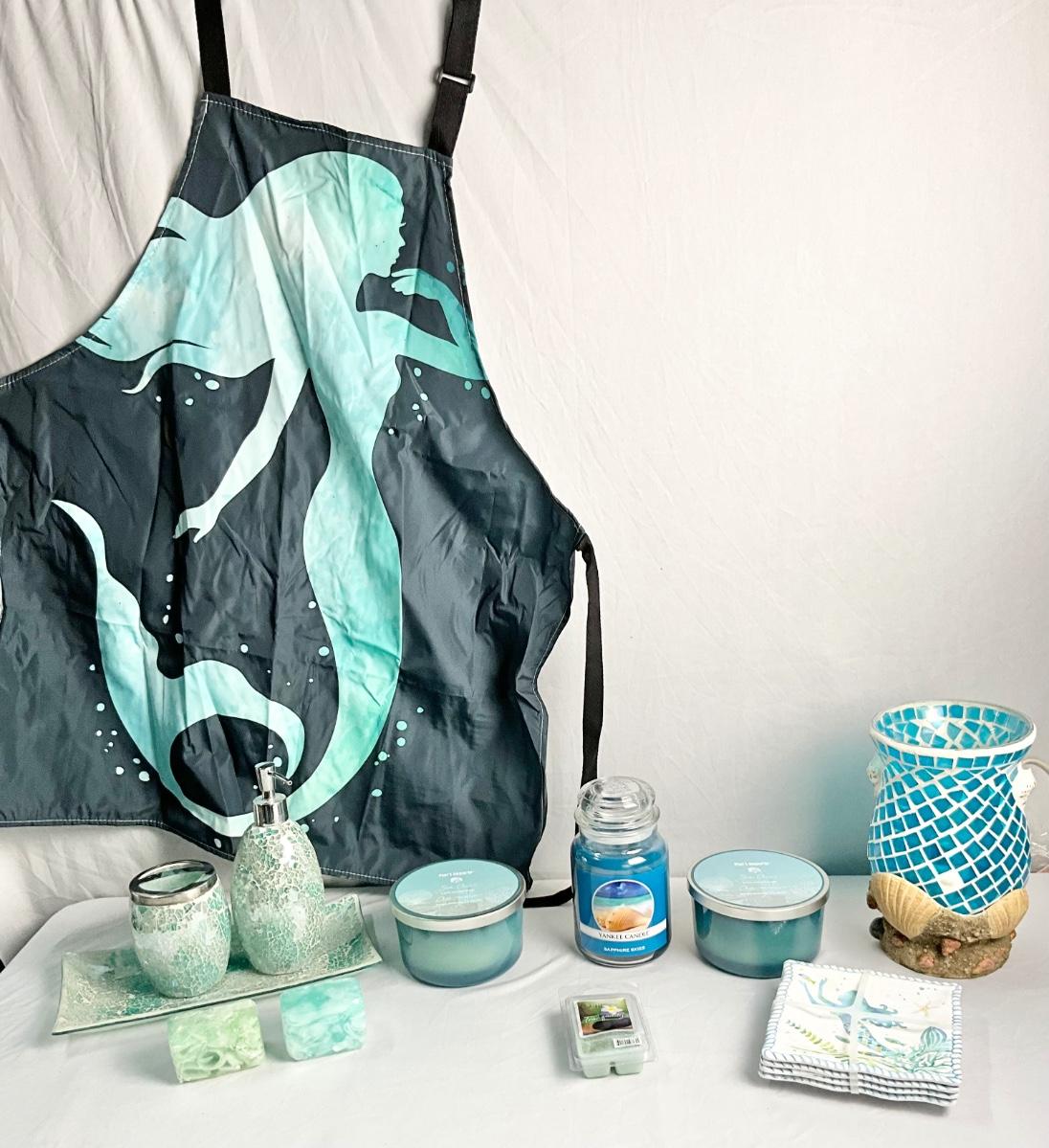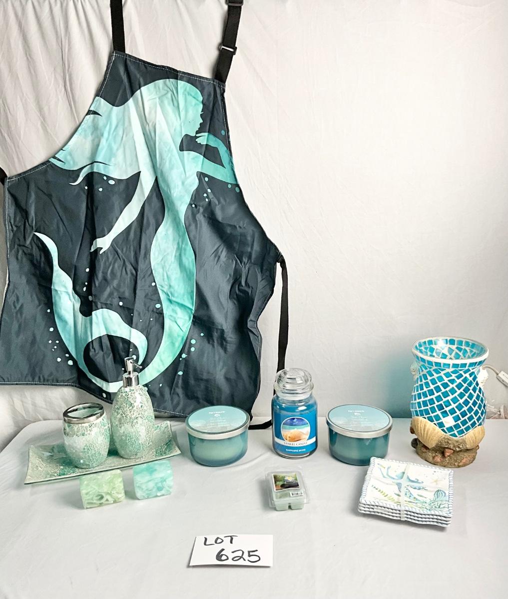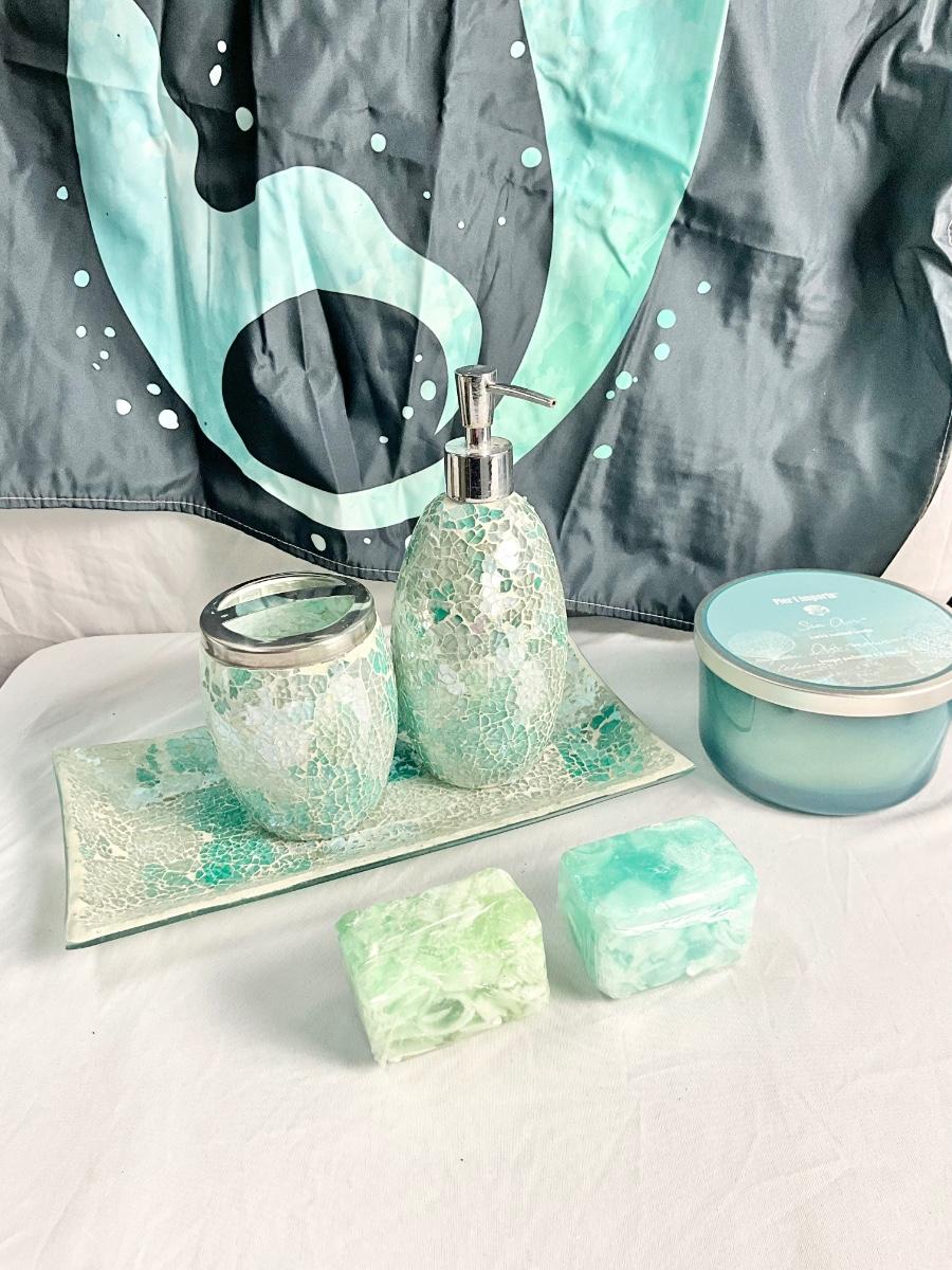Lot V 625 Aqua Sea Glass Mosaic Dispensers, Mermaid Apron & Dishes, Mosaic Style Lamp, Candles, and Soaps