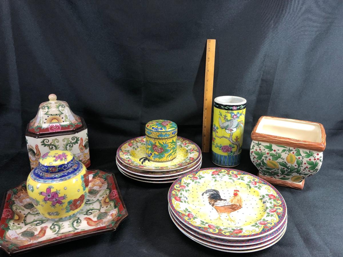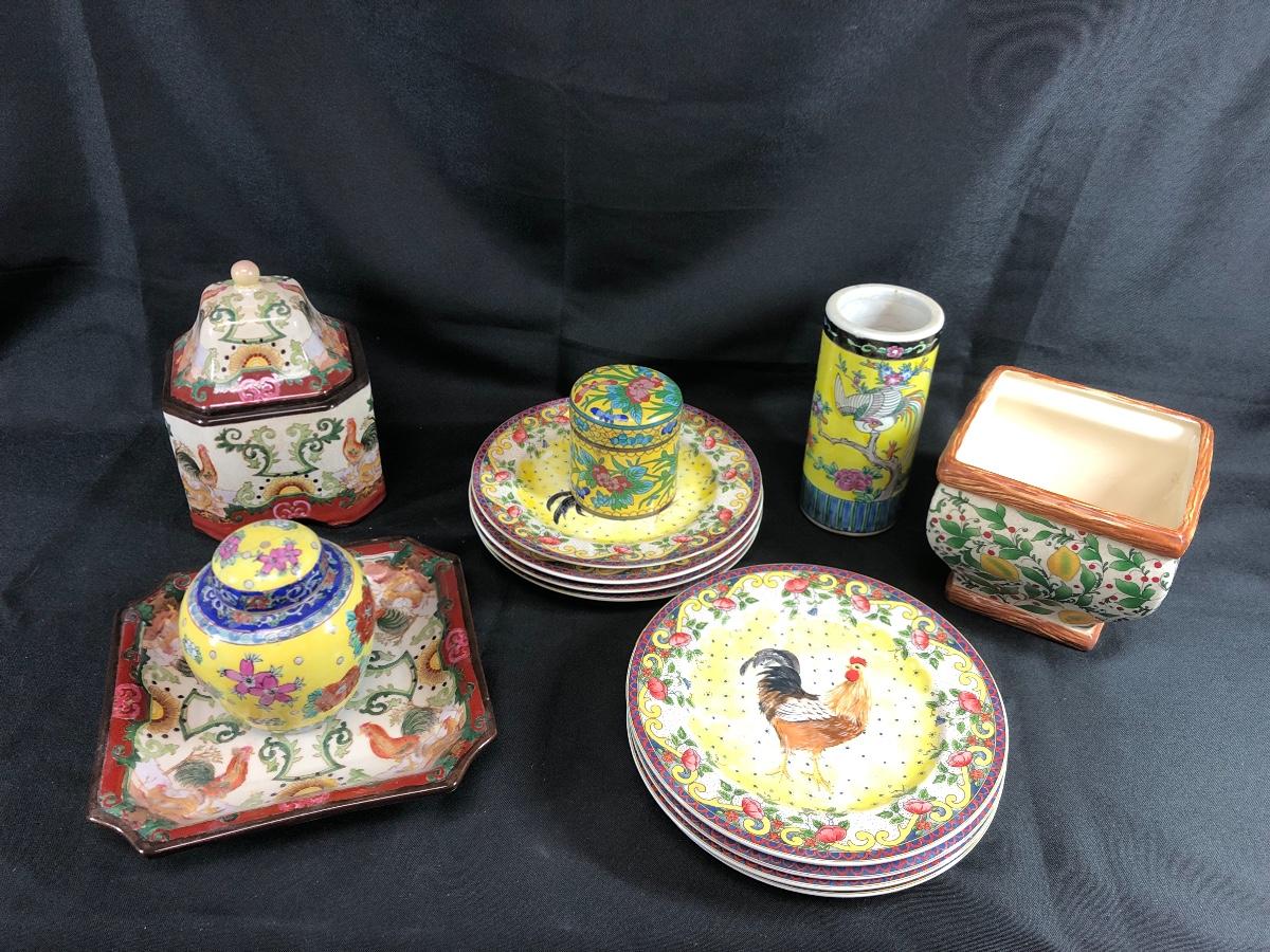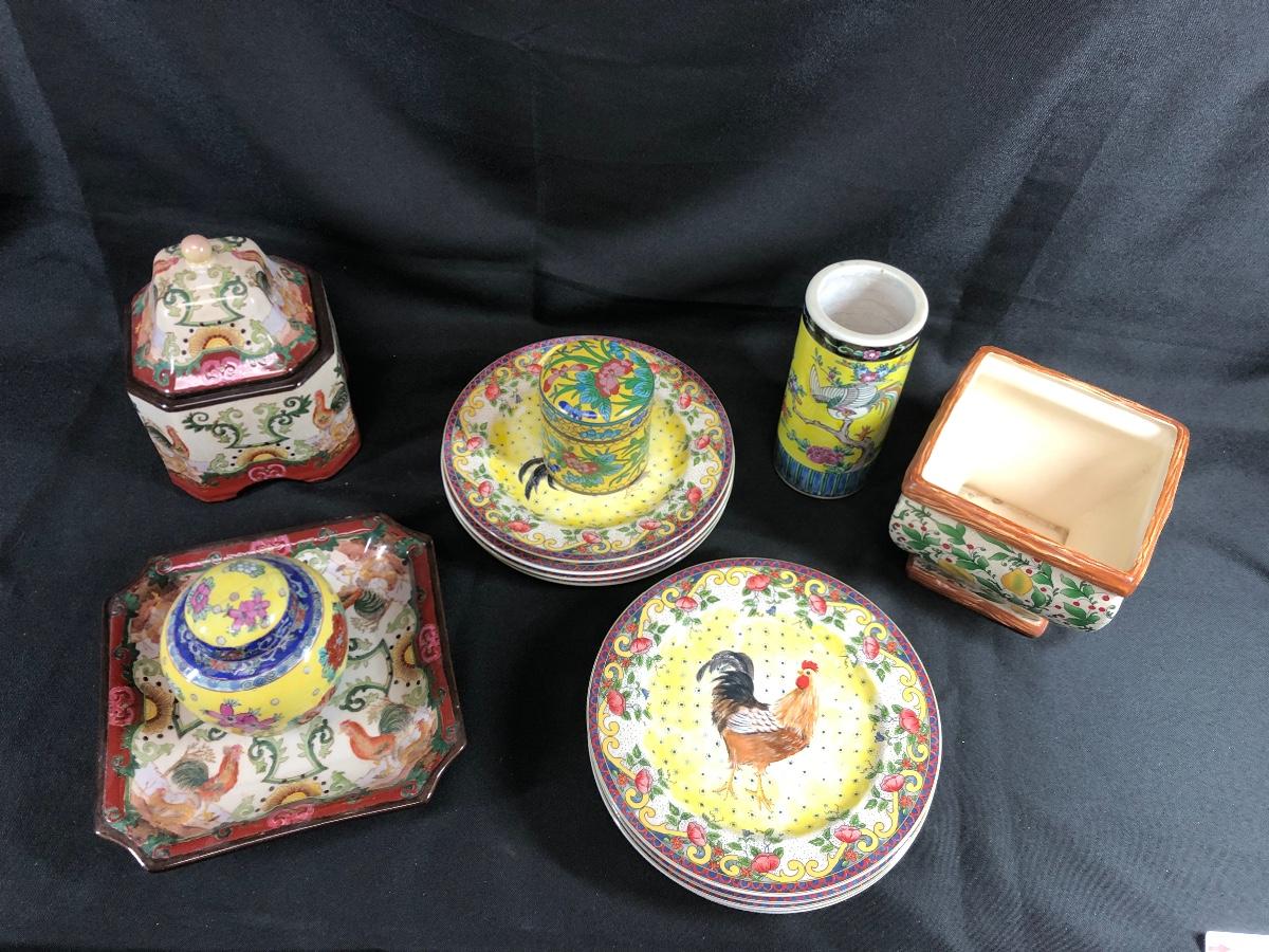 Plates, pot,, ginger jar, trinket box, etc. lid of ginger jar has hairline crack.