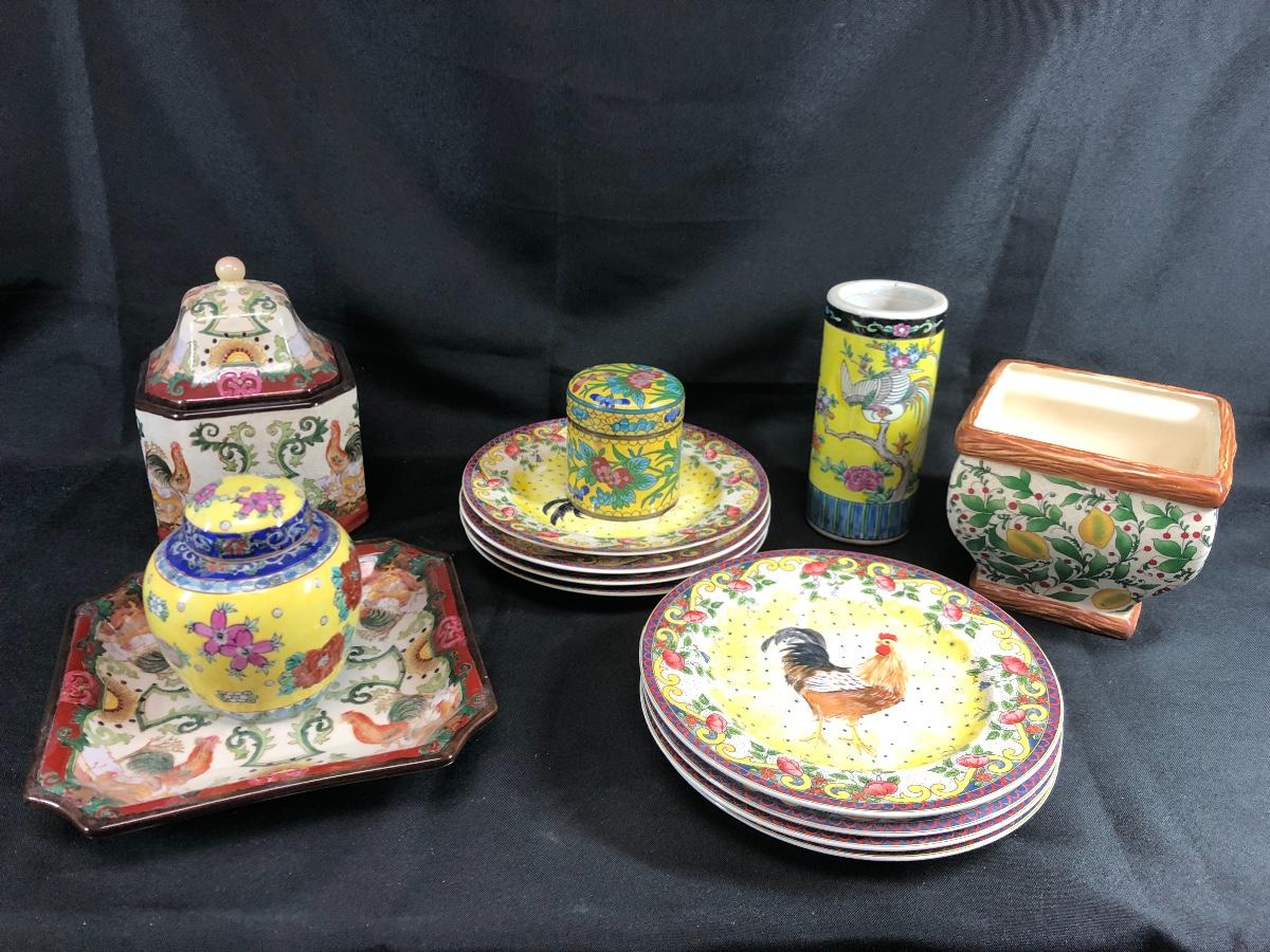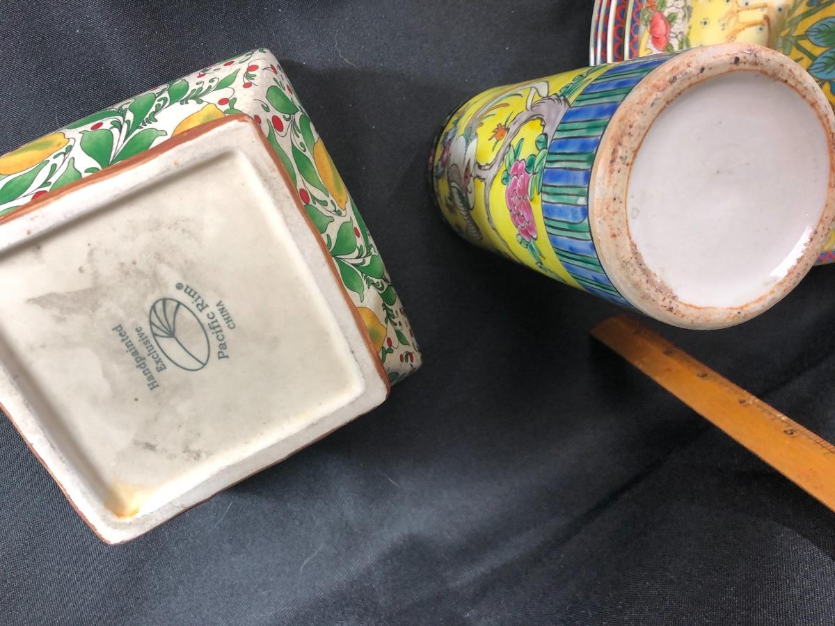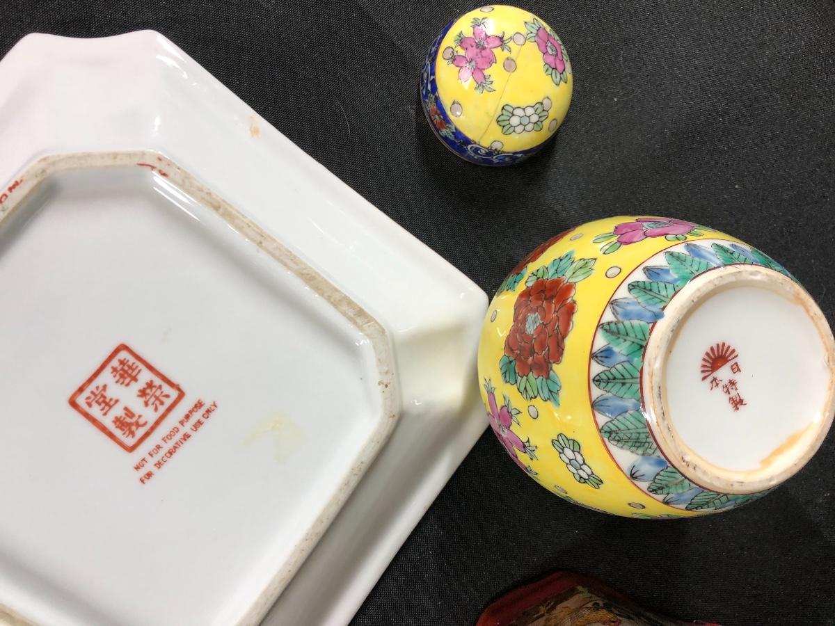 Plates, pot,, ginger jar, trinket box, etc. lid of ginger jar has hairline crack.