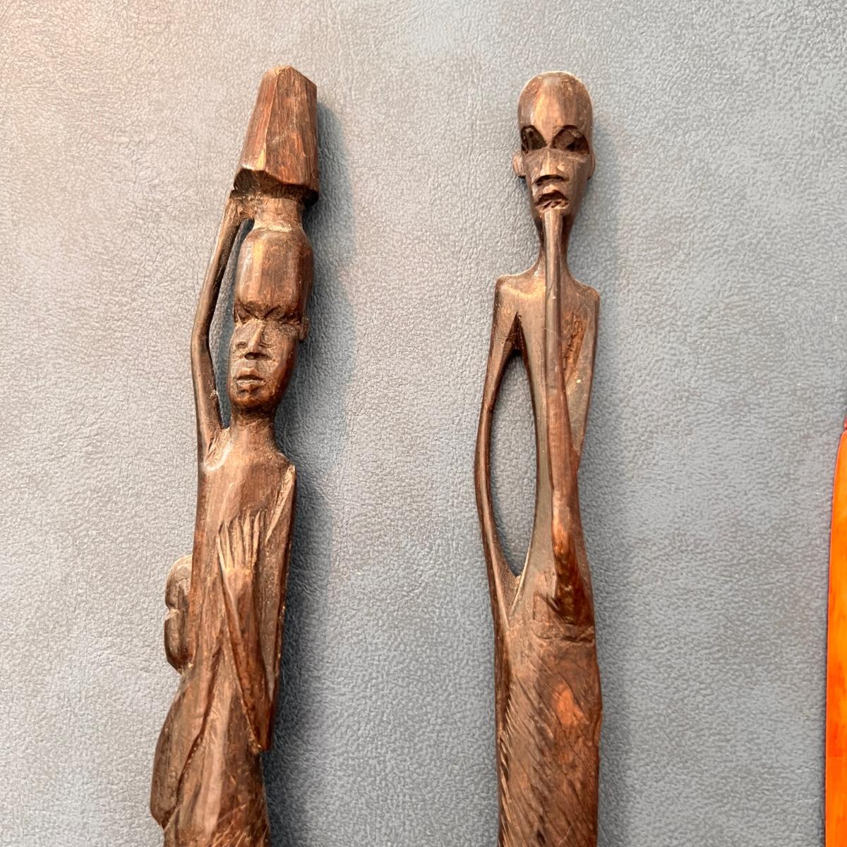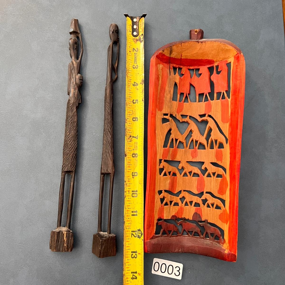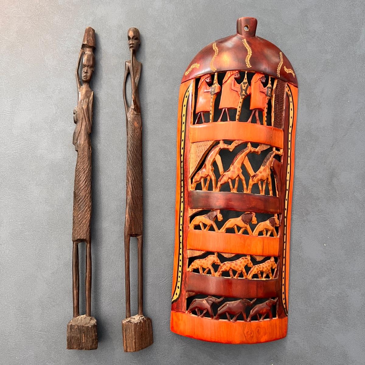 Amazing details. 2 tall slender statue figurines. 1 wall hanging. Hand carved and purchased in Africa.