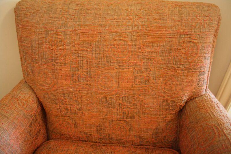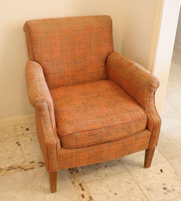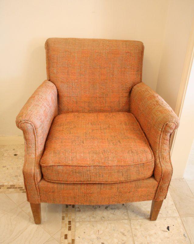 Vintage Orange Baroque Pattern Armchair - Clean and vibrant soft orange colored vintage armchair with wooden legs. Sturdy and comfortable. Measures: 30" (width) 26" (depth) 33" (height).
