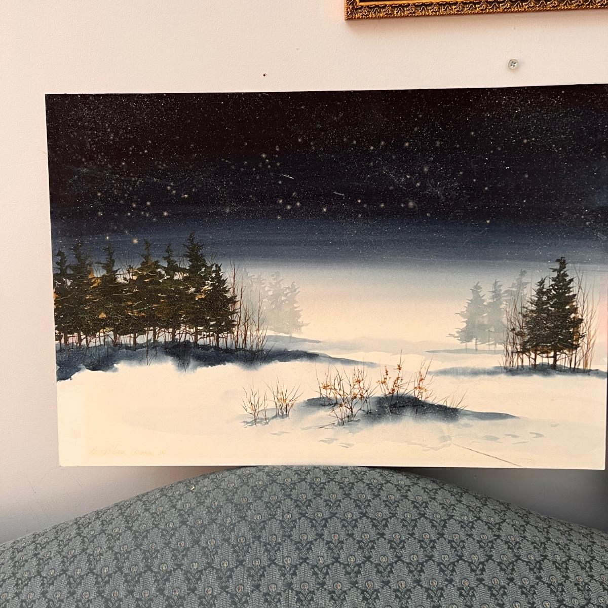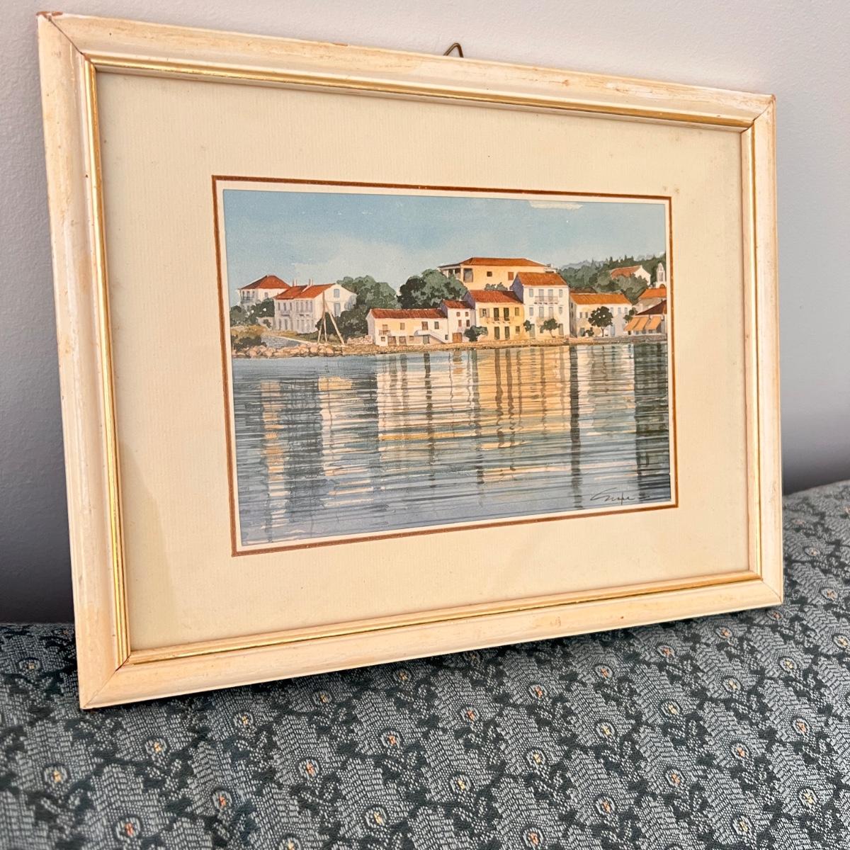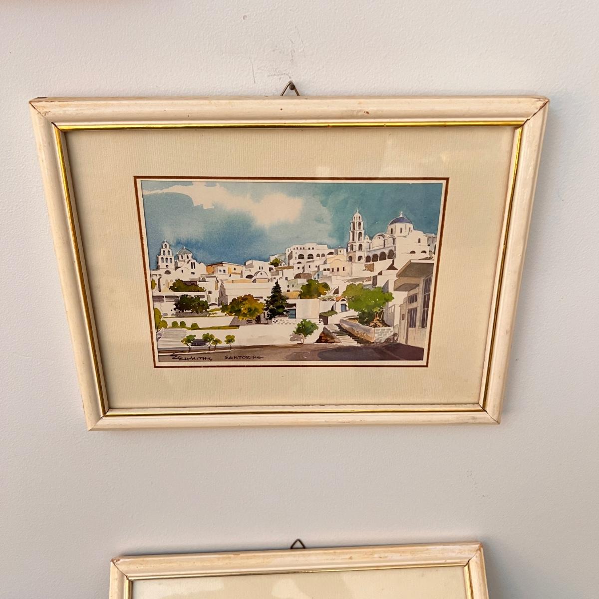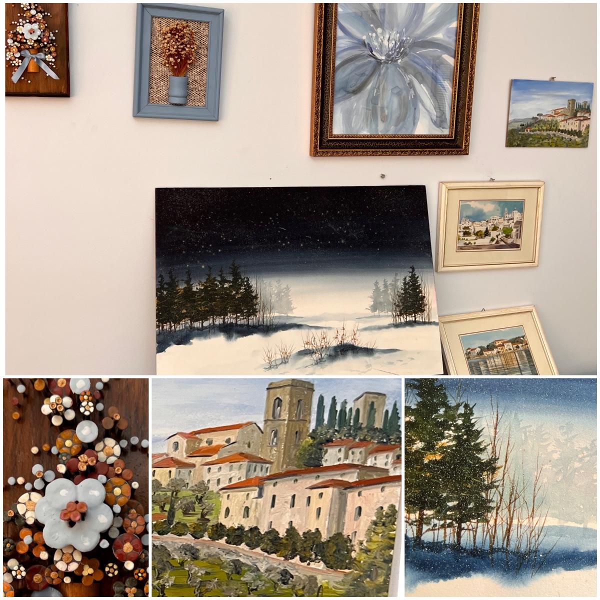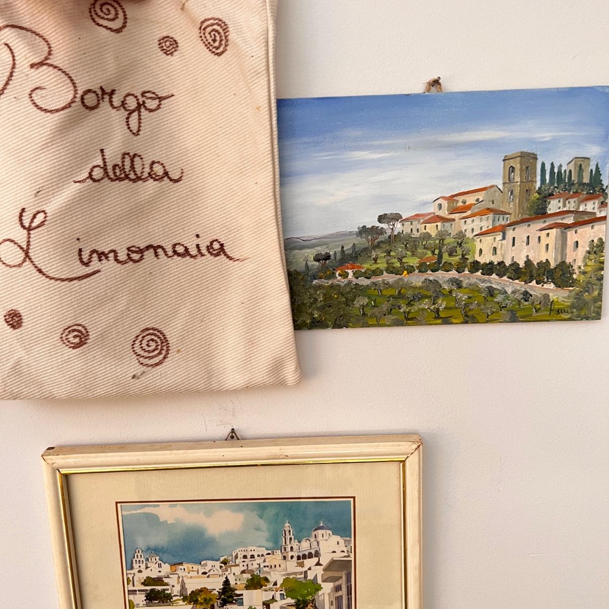 Snow scene is gorgeous signed NANCY HOGAN ARMOUR. Painted on board. Just needs a frame. Small painted board of Borgo della L'imonaia, 2 greek framed prints, 1970's Polo Craft Nail 3D Art, and more.
