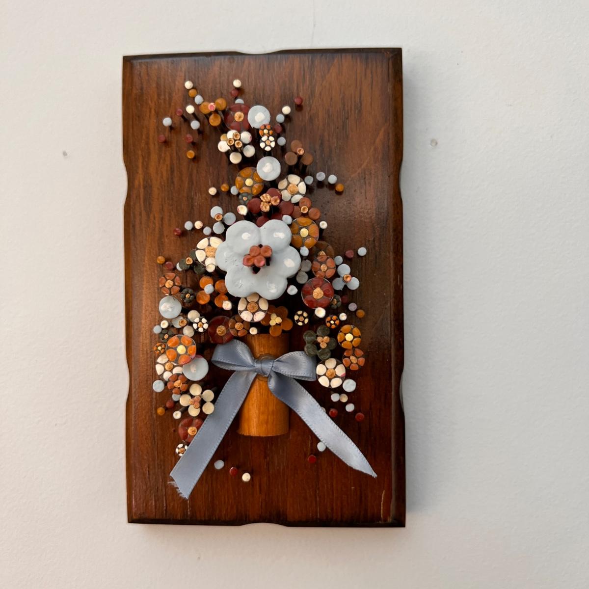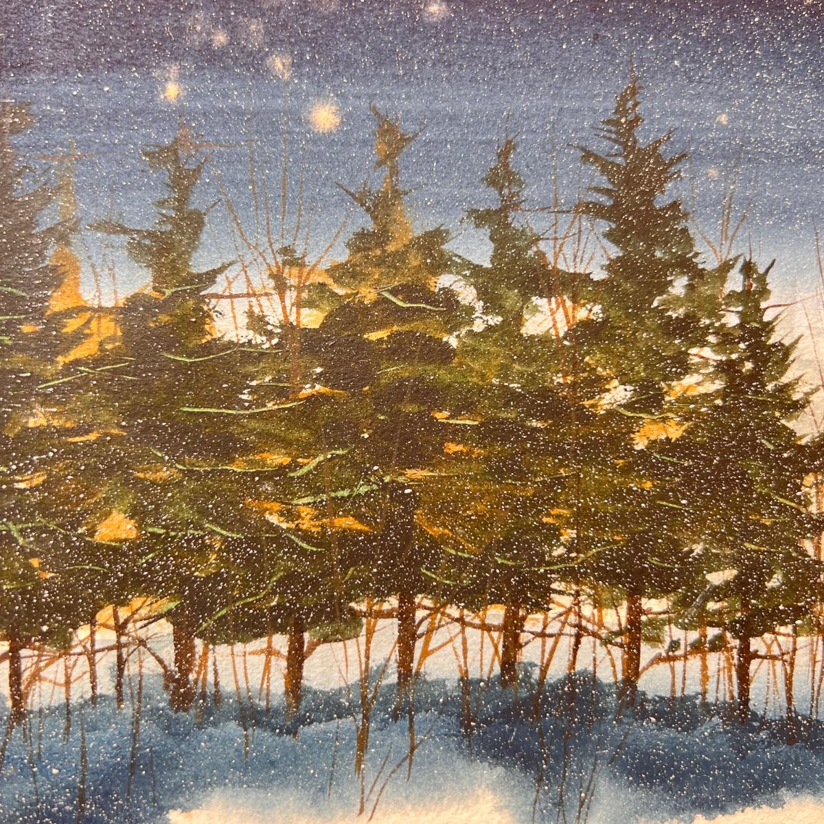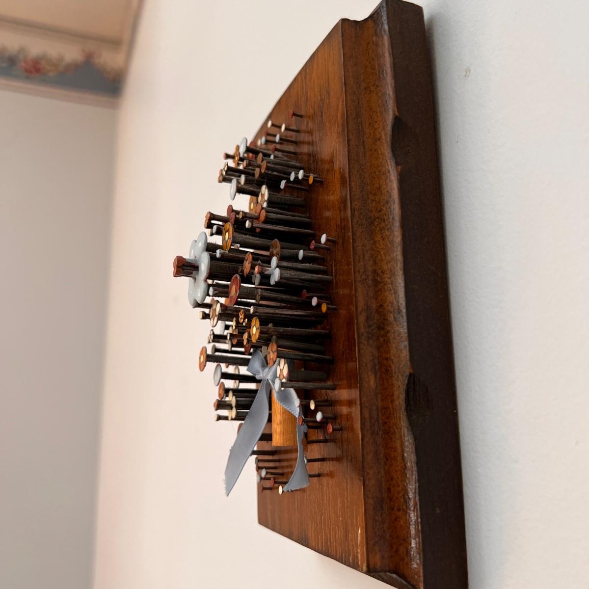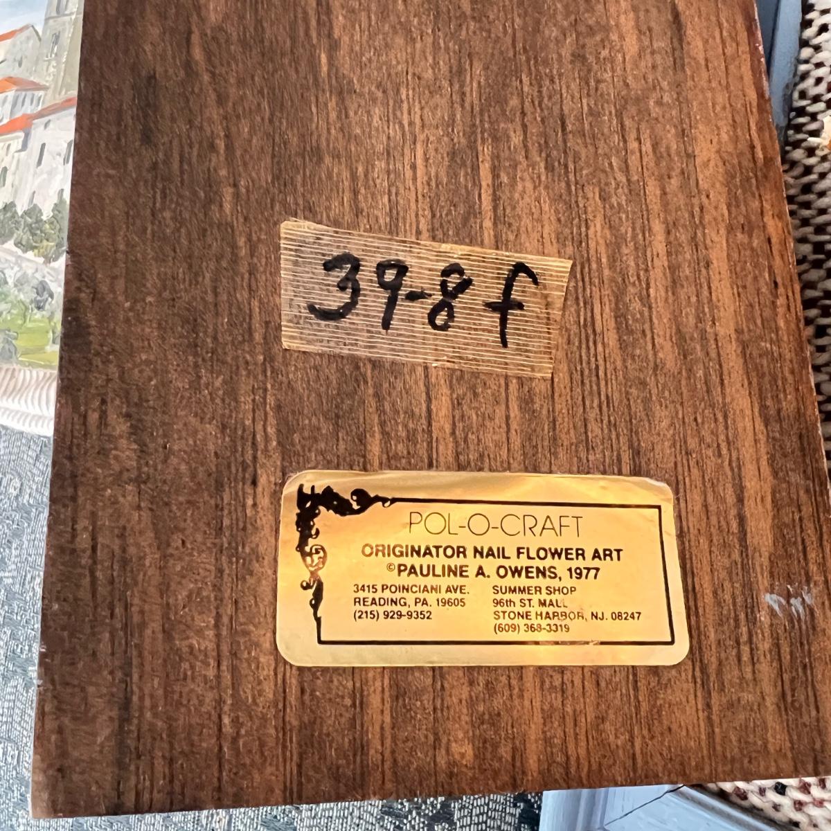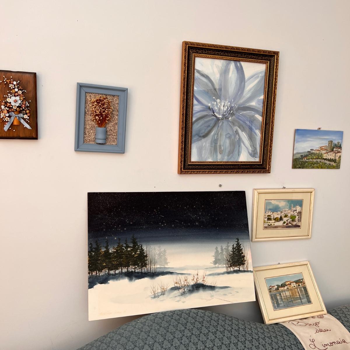 Snow scene is gorgeous signed NANCY HOGAN ARMOUR. Painted on board. Just needs a frame. Small painted board of Borgo della L'imonaia, 2 greek framed prints, 1970's Polo Craft Nail 3D Art, and more.