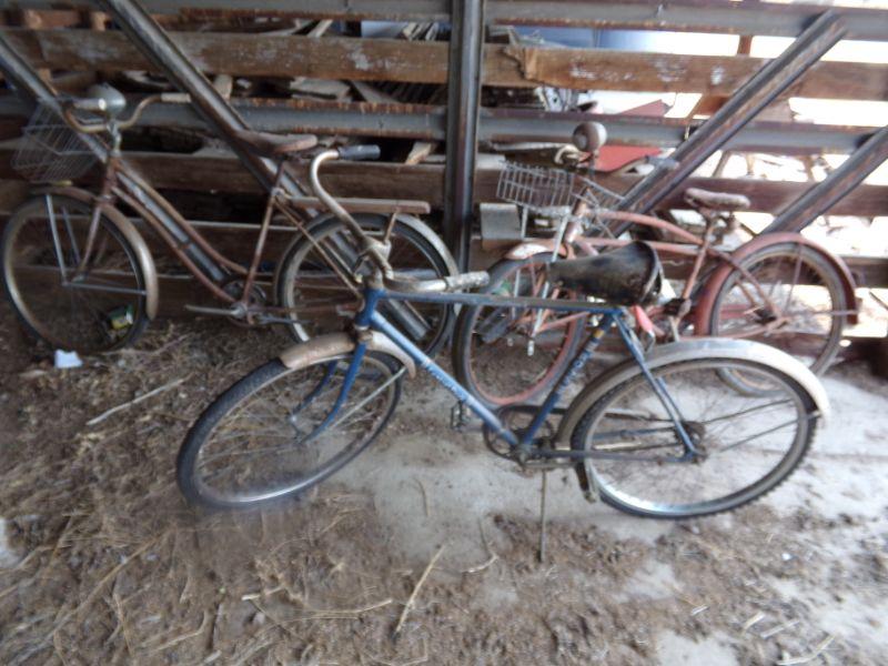 3 VINTAGE BICYCLES, ONE IS A "ROSS CENTRAL PARK" NOT SURE THE MAKE OF THE OTHER 2. IT WOULD TAKE A LOT TO MAKE THESE BIKES ROAD READY. THEY ARE BEING SOLD MAINLY FOR PARTS OR REPURPOSE