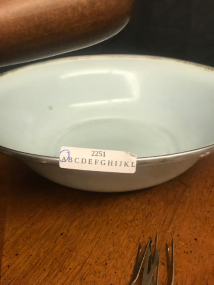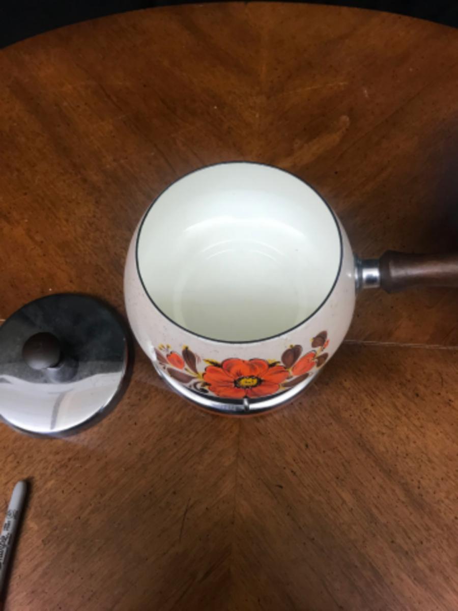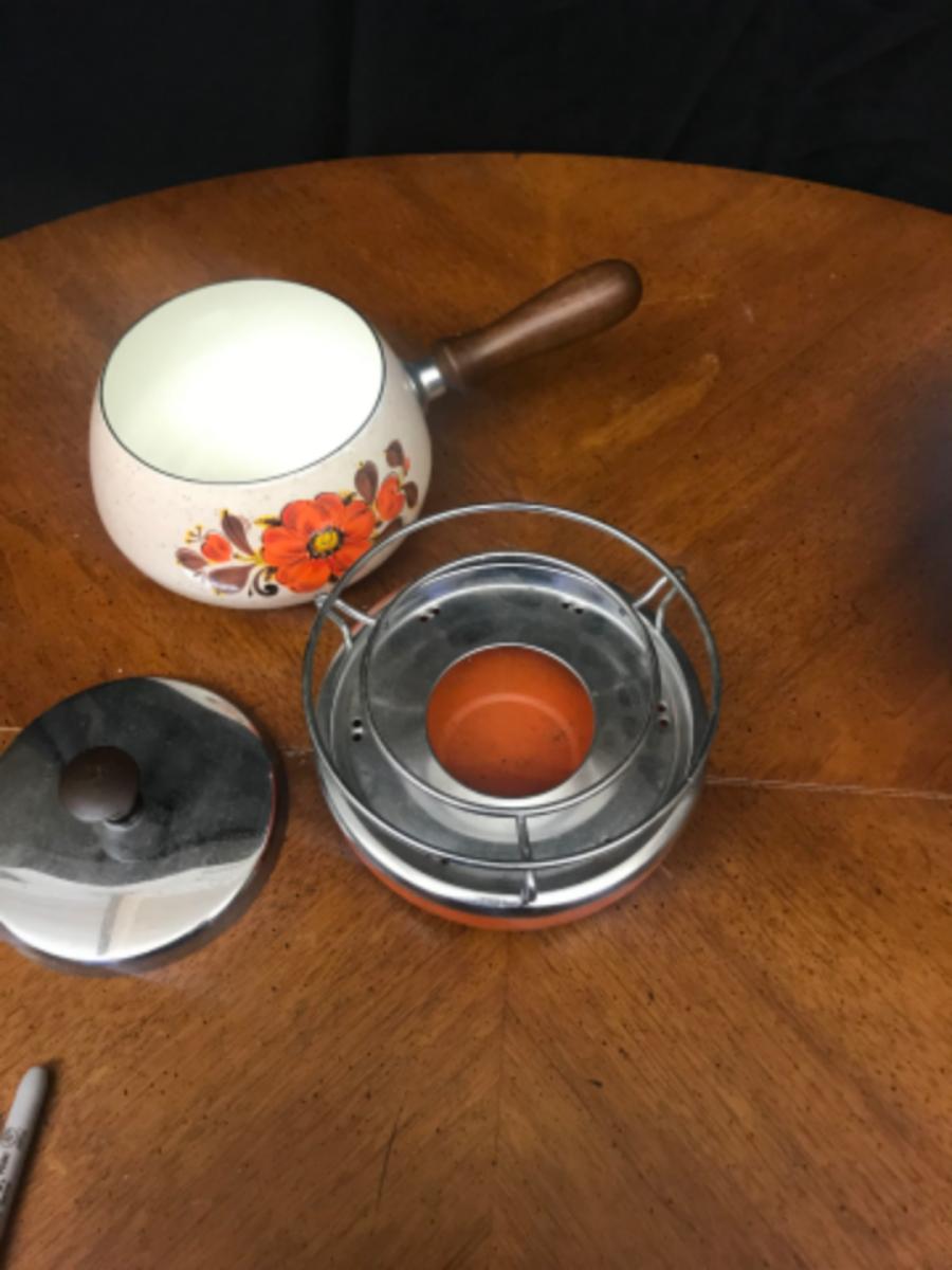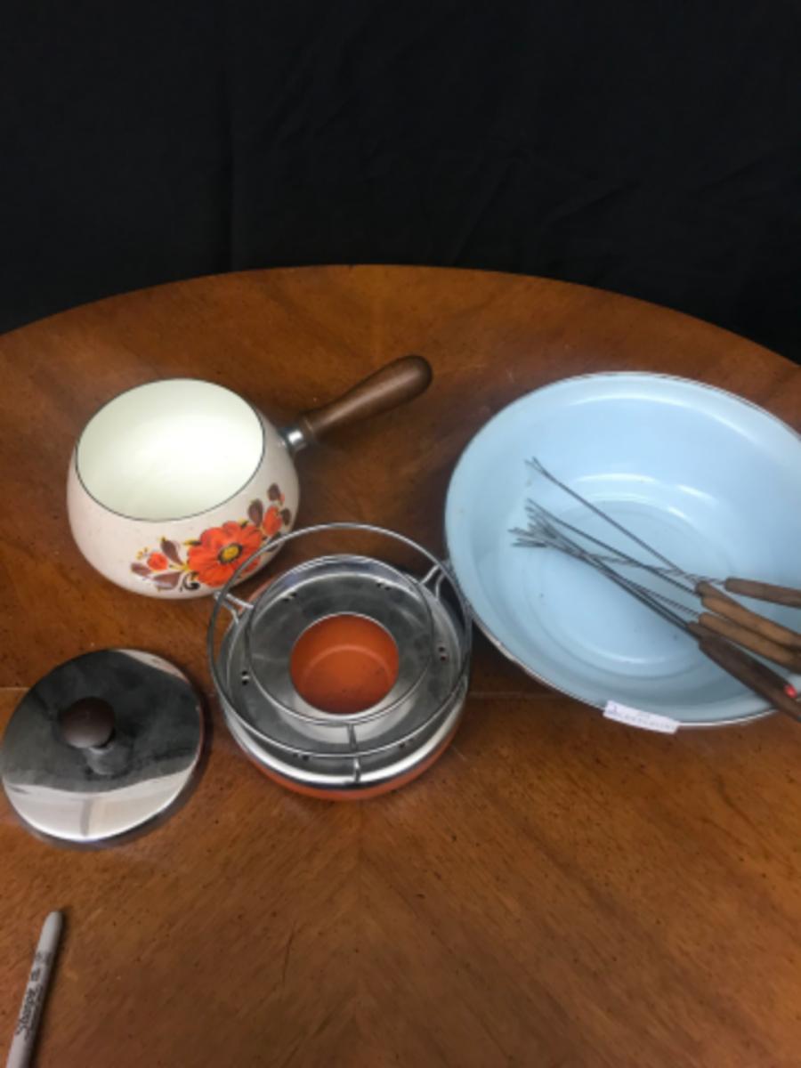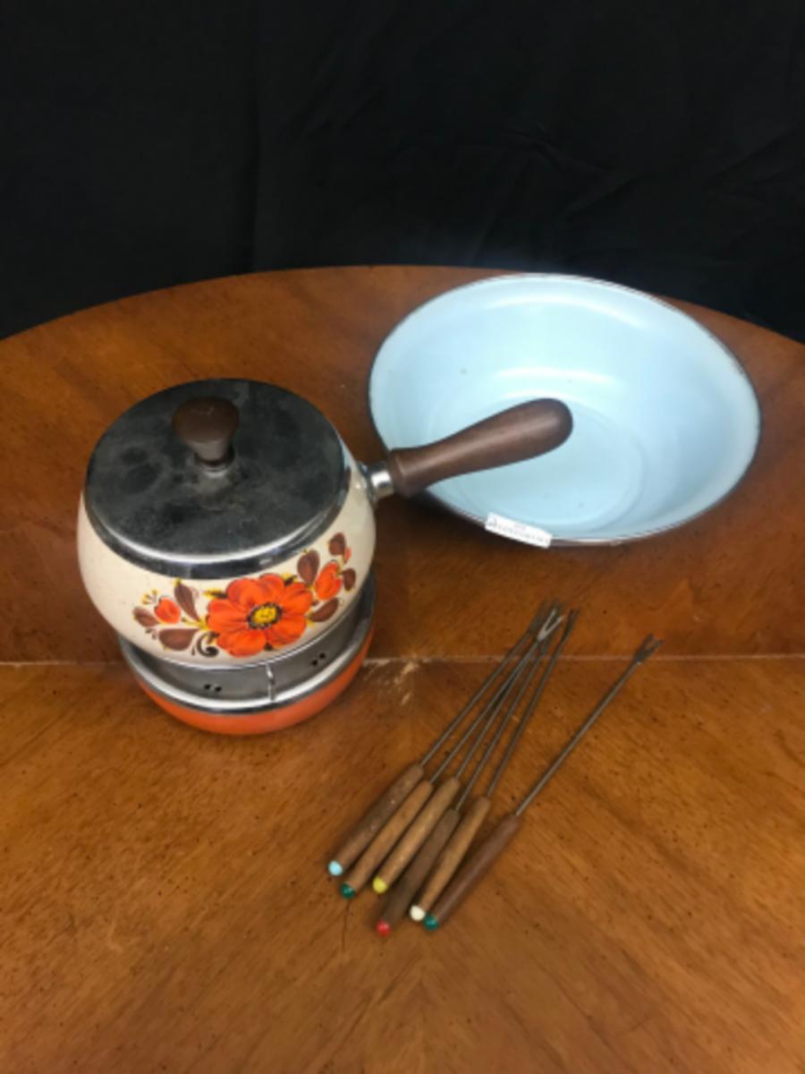 kitchen:lot vintage blue enamel wash bowl, orange, brown, yellow, and ivory fondue pot with 6 forks;