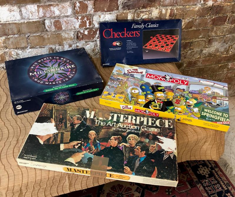 Good condition with some light normal use on this lot of familiar vintage Board Games...including such Family Classics as Checkers..Masterpiece..Monopoly and Millionaire...