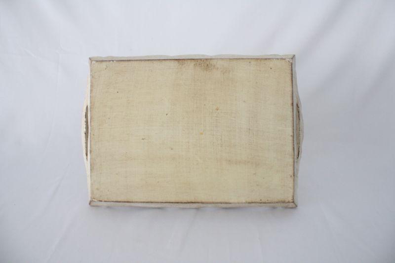 Vintage Carved Wood Floral Painted Tea Vanity Tray - This wooden tray has carved edges and a off-white distressed finish with hand painted flowers. Makes a beautiful decorative piece. In good condition. Tray measures 12" inches long.
