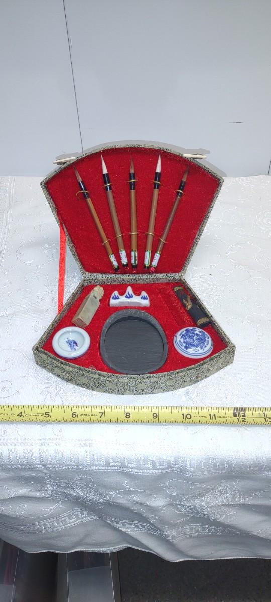 THIS VINTAGE CHINESE CALLIGRAPHY SET COMES IN ITS OWN FABRIC COVERED BOX LINED WITH RED VELVET. IT CONTAINS EVERYTHING NEEDED TO CREATE. THERE ARE 5 BRUSHES, INK, MIXING SPOON AND STONE, PORCELAIN BRUSH HOLDER , INK WELLS AND HAND CARVED SOAPSTONE. THIS CALLIGRAPHY SET IS IN GREAT CONDITION BUT GENTLY USED.